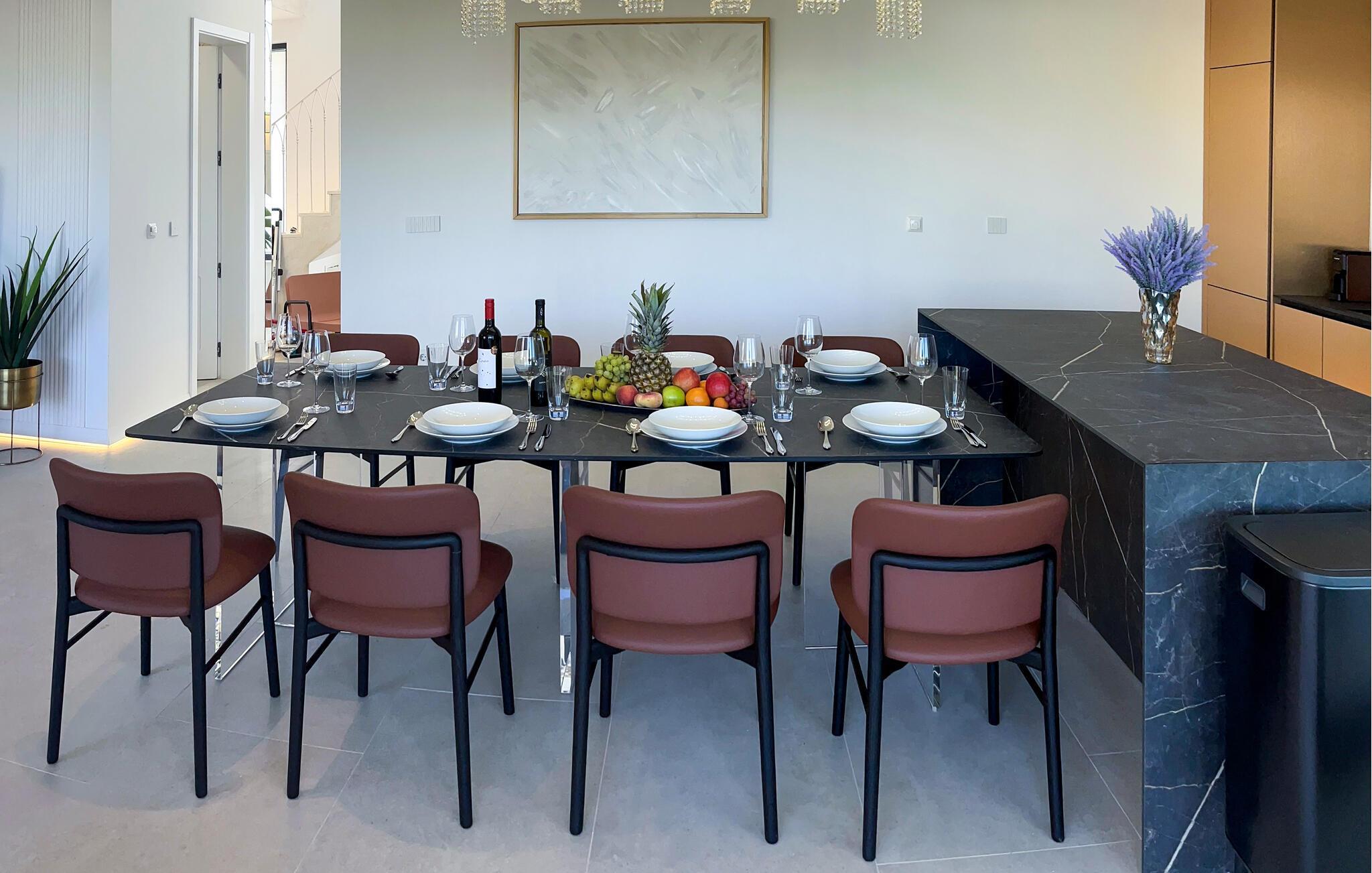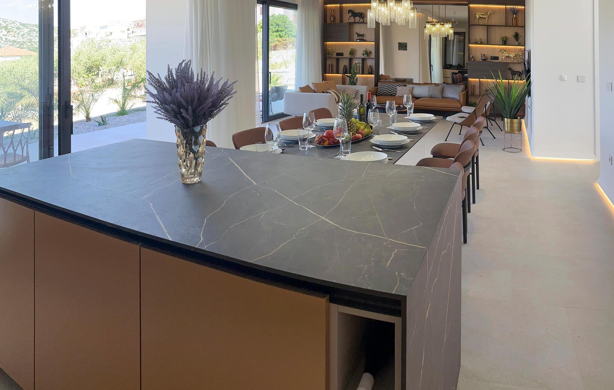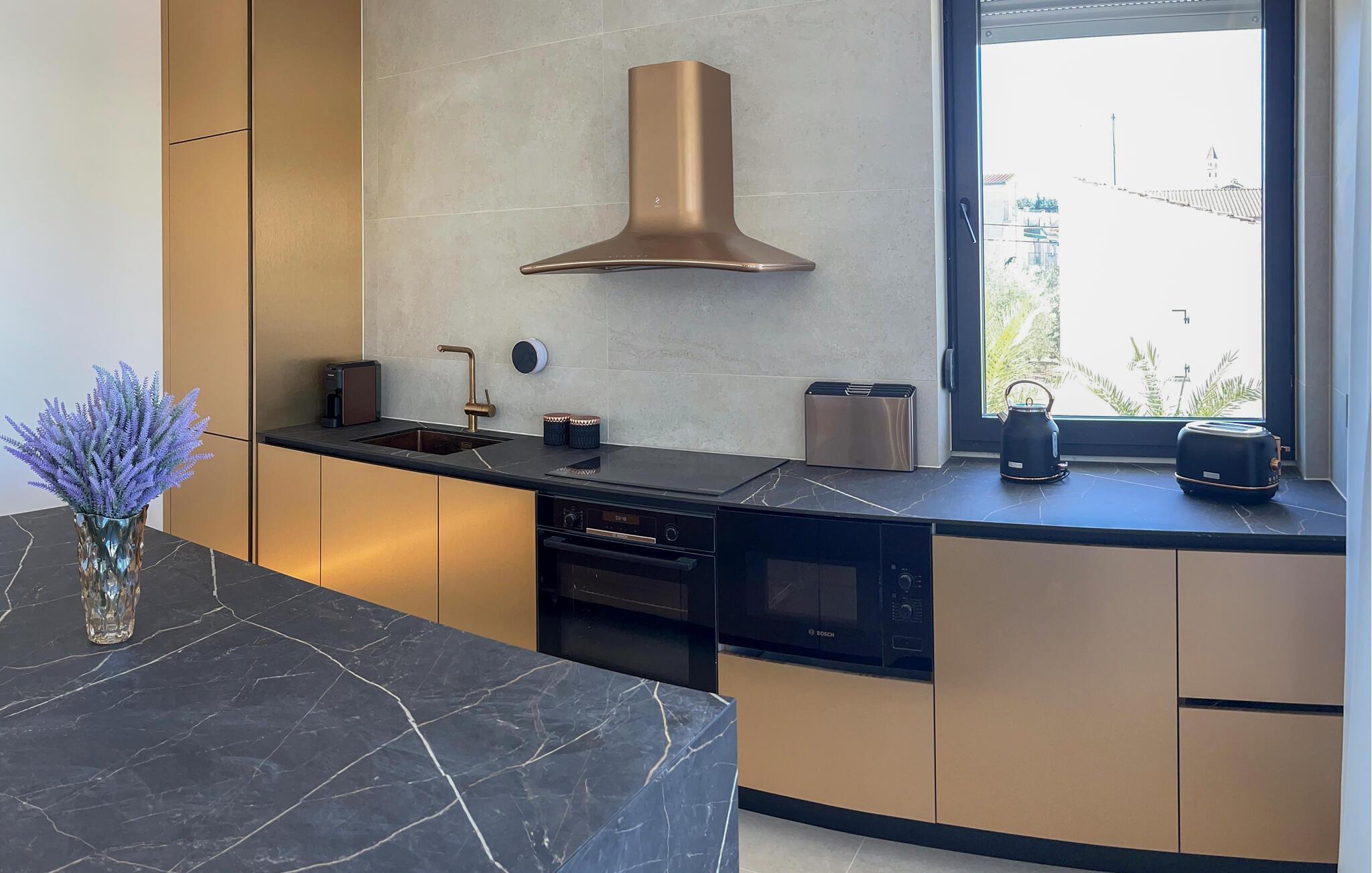 Dieses hochwertig ausgestattete Ferienhaus verwöhnt Sie mit einem geräumigen Interieur, das mit stilvollen Designermöbeln eingerichtet ist, und einem bezaubernden Blick auf die türkisfarbene Bucht. Lassen Sie sich zu kulinarischen Highlights verführen und genießen Sie harmonische Mahlzeiten am einladenden Esstisch. Plaudern Sie abends im gemütlichen Wohnzimmer oder entspannen Sie bei einem guten Film.
