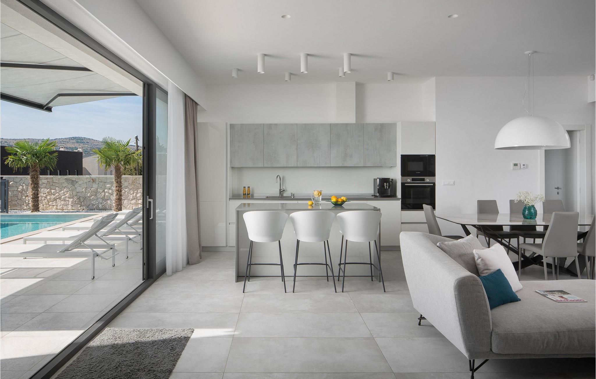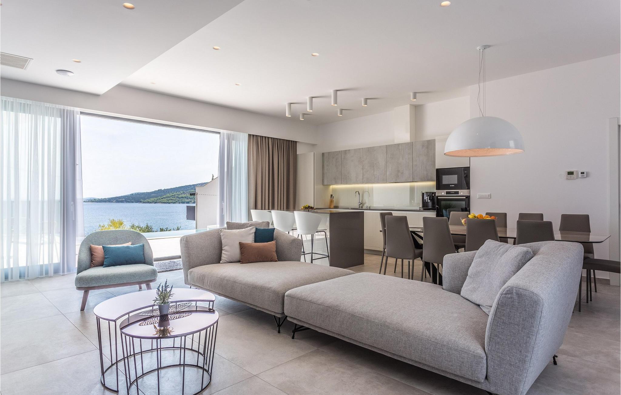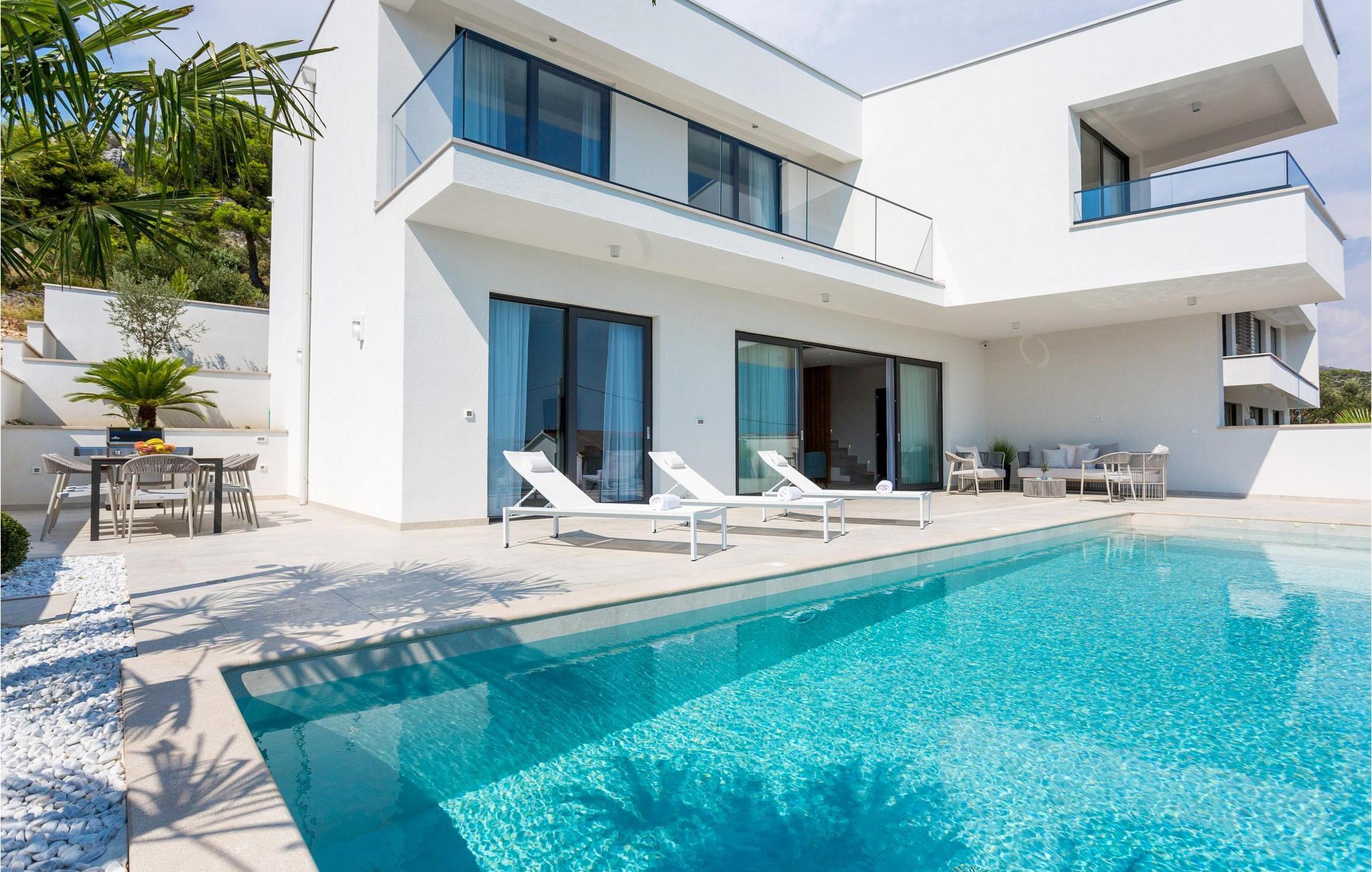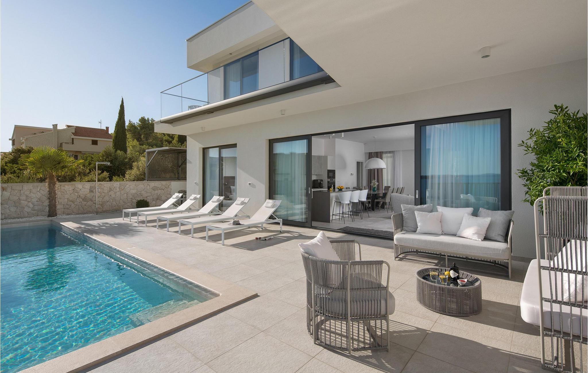 Die moderne Villa Alba Seget bietet Ihnen lichtdurchflutete Räume, eine hochwertige Küche und ein stilvoll eingerichtetes Wohnzimmer mit Blick auf das glitzernde Meer. Die geschmackvolle Einrichtung, gepaart mit modernster Ausstattung, sorgt für ein rundum gelungenes Urlaubserlebnis. Entdecken Sie auf zwei Etagen die hochwertig ausgestatteten Räume in hellen Farben. Alle Schlafzimmer verfügen über eigene Badezimmer, sodass Sie Ihre Nachtruhe und Privatsphäre genießen können. Im Gegensatz bietet Ihnen die Villa mit PlayStation sowie einem erstklassigen Fitnessbereich Unterhaltung und Aktivität.