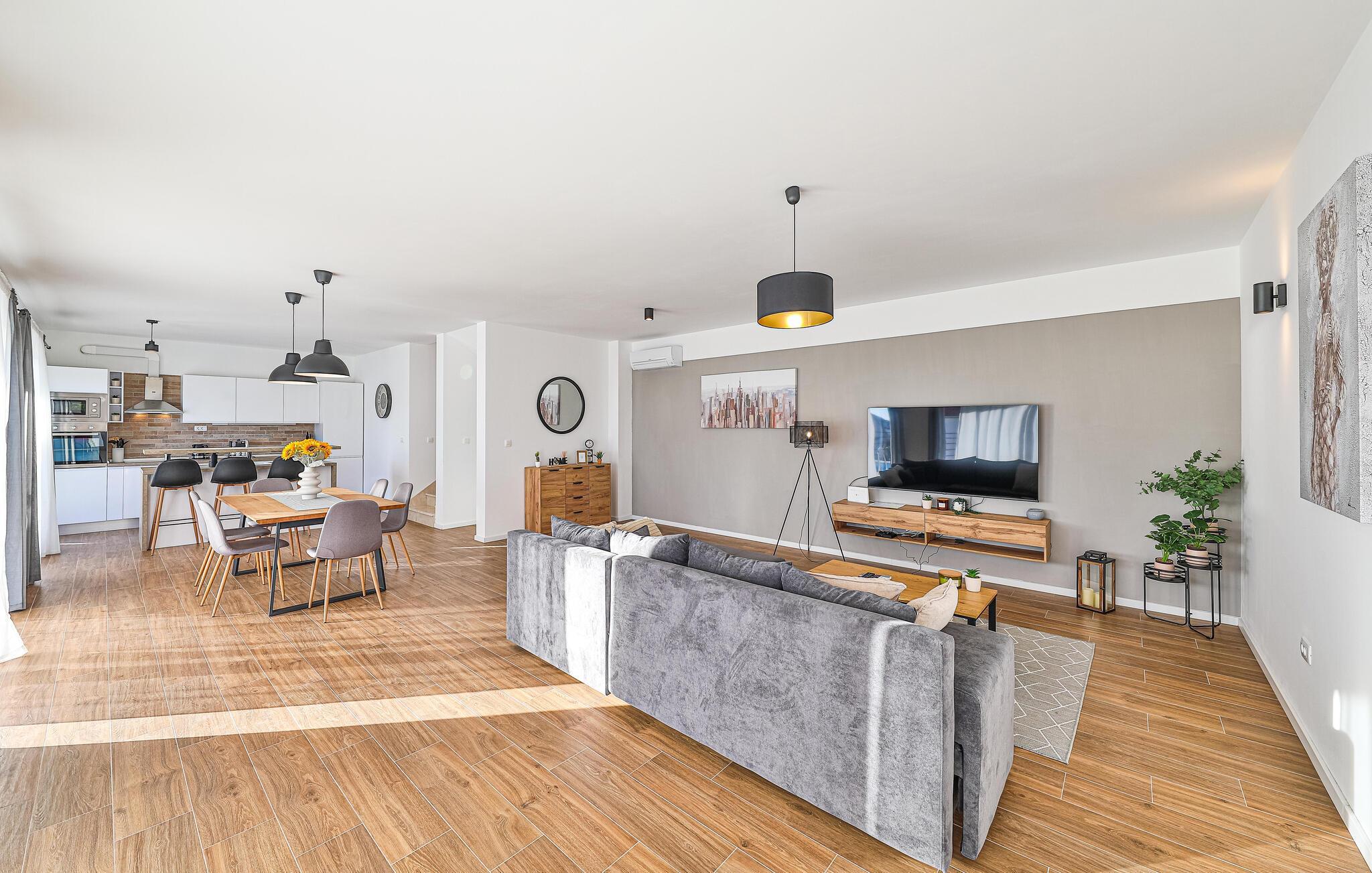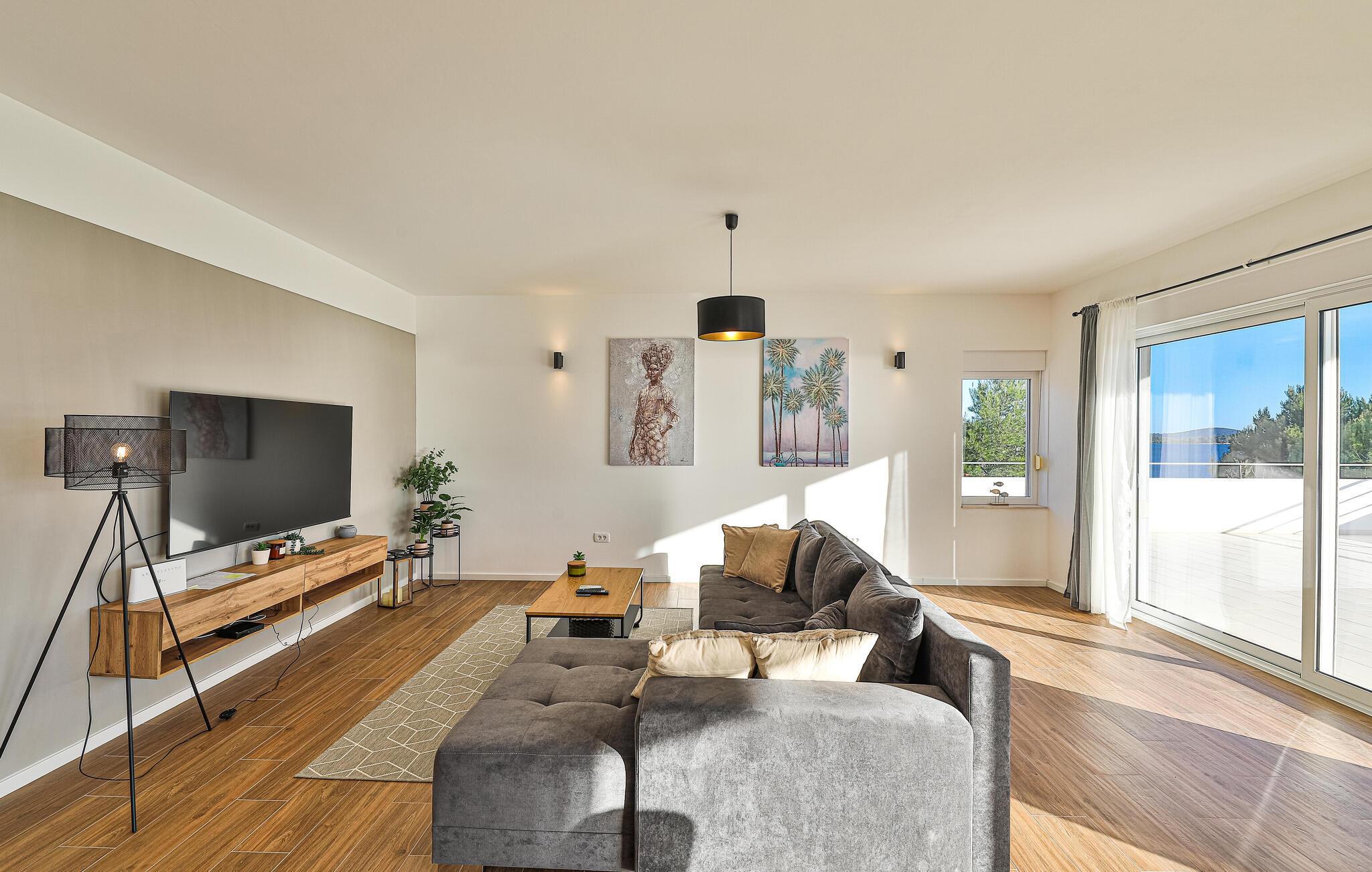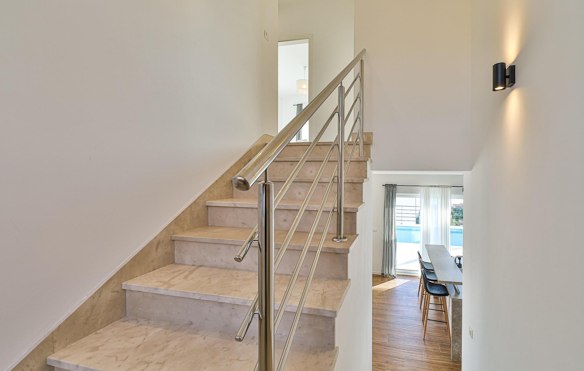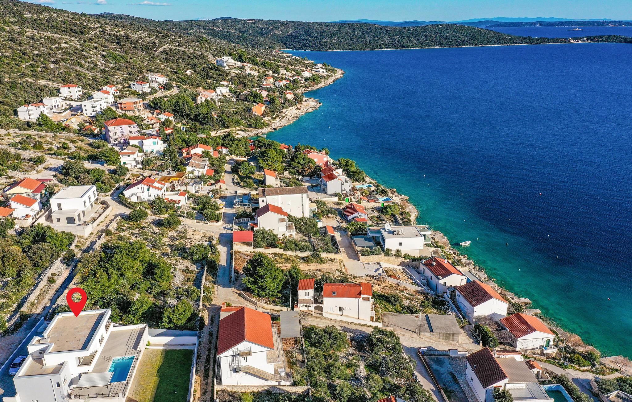 Reisen Sie nach Trogir-Sevid und verbringen einen erholsamen Urlaub in diesem hellen und komfortablen Haus, das keine Ihrer Wünsche offenlässt. Fühlen Sie sich hier wie zuhause und genießen das Ambiente des offenen Wohnraumes, der sich über die Länge des Erdgeschosses zieht und Ihnen Zutritt auf die Terrasse gibt. Im Obergeschoss können Sie die Nachtruhe in den Schlafzimmern genießen und am Morgen langsam auf den Balkonen mit Meerblick aufwachen und Ihren ersten Kaffee trinken. Zum Frühstück können Sie auf der überdachten Terrasse zusammenkommen oder schon die ersten Bahnen im Pool schwimmen.