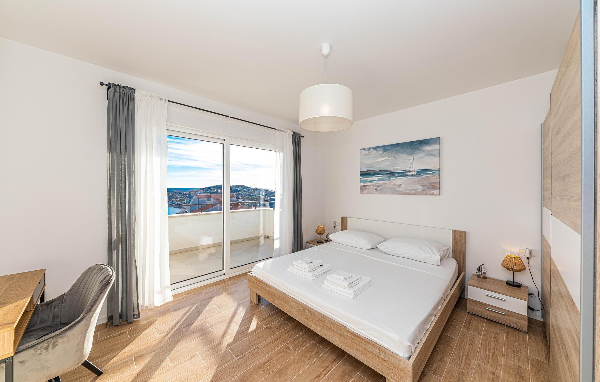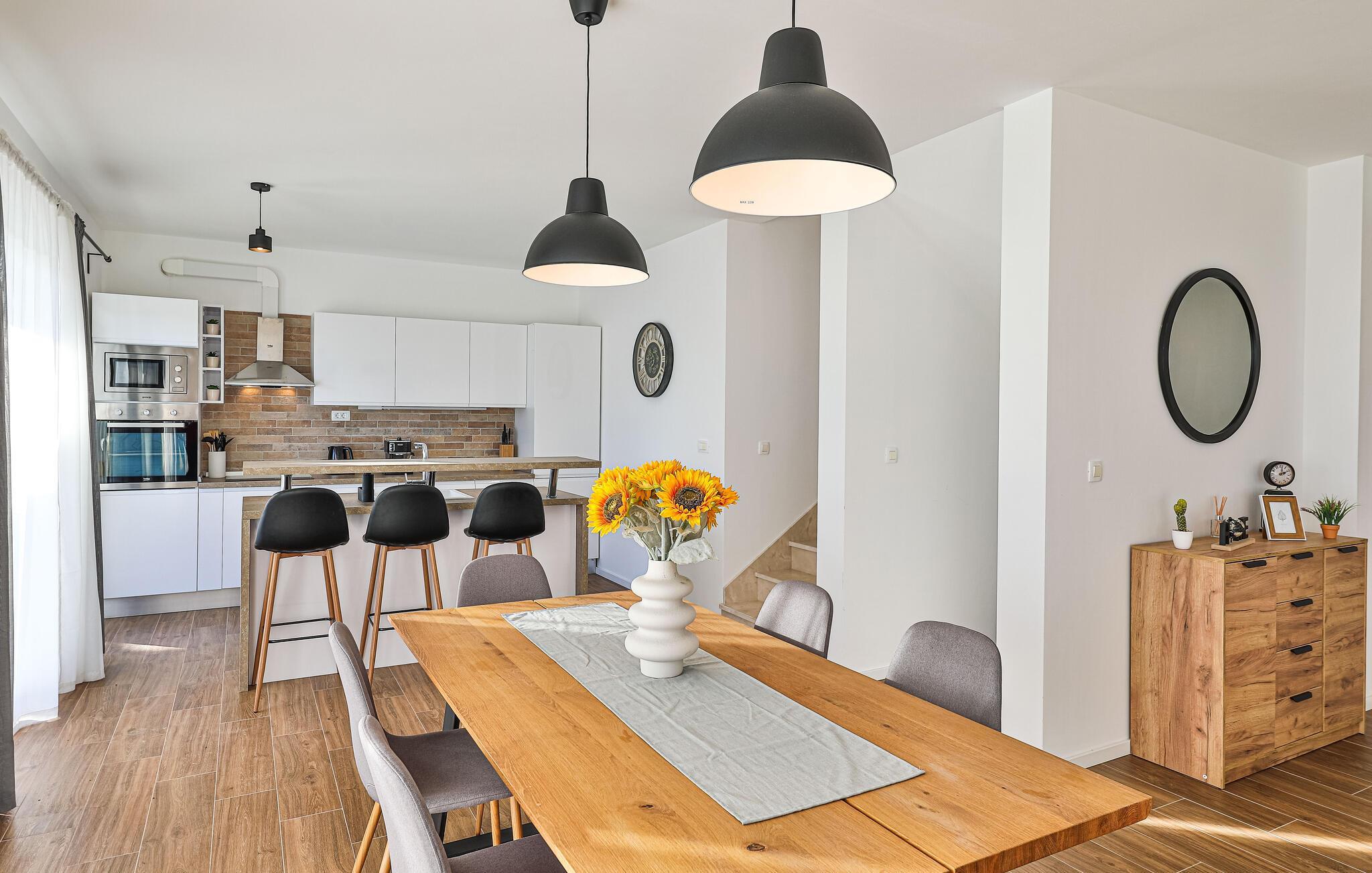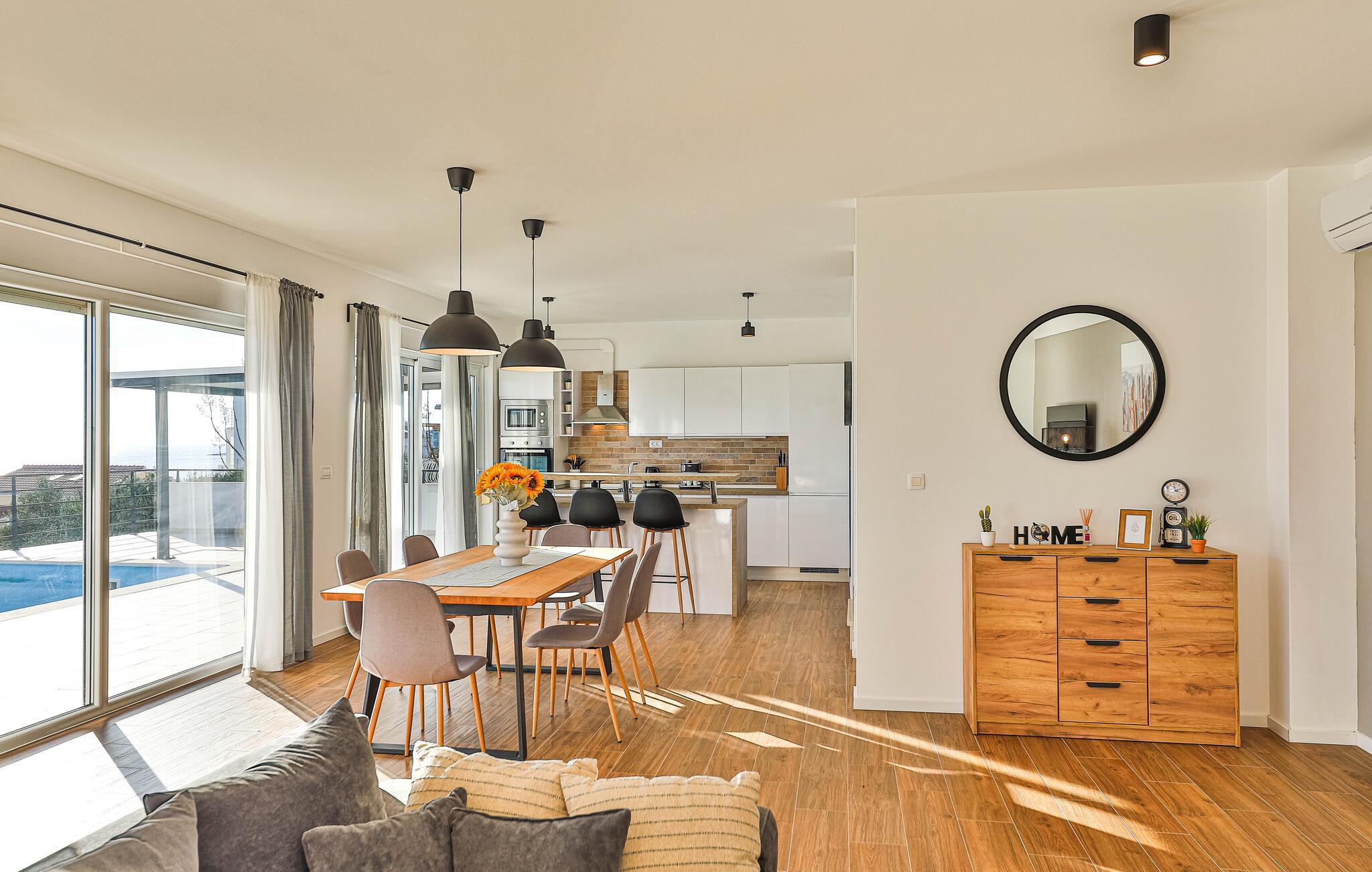 Reisen Sie nach Trogir-Sevid und verbringen einen erholsamen Urlaub in diesem hellen und komfortablen Haus, das keine Ihrer Wünsche offenlässt. Fühlen Sie sich hier wie zuhause und genießen das Ambiente des offenen Wohnraumes, der sich über die Länge des Erdgeschosses zieht und Ihnen Zutritt auf die Terrasse gibt. Im Obergeschoss können Sie die Nachtruhe in den Schlafzimmern genießen und am Morgen langsam auf den Balkonen mit Meerblick aufwachen und Ihren ersten Kaffee trinken. Zum Frühstück können Sie auf der überdachten Terrasse zusammenkommen oder schon die ersten Bahnen im Pool schwimmen.