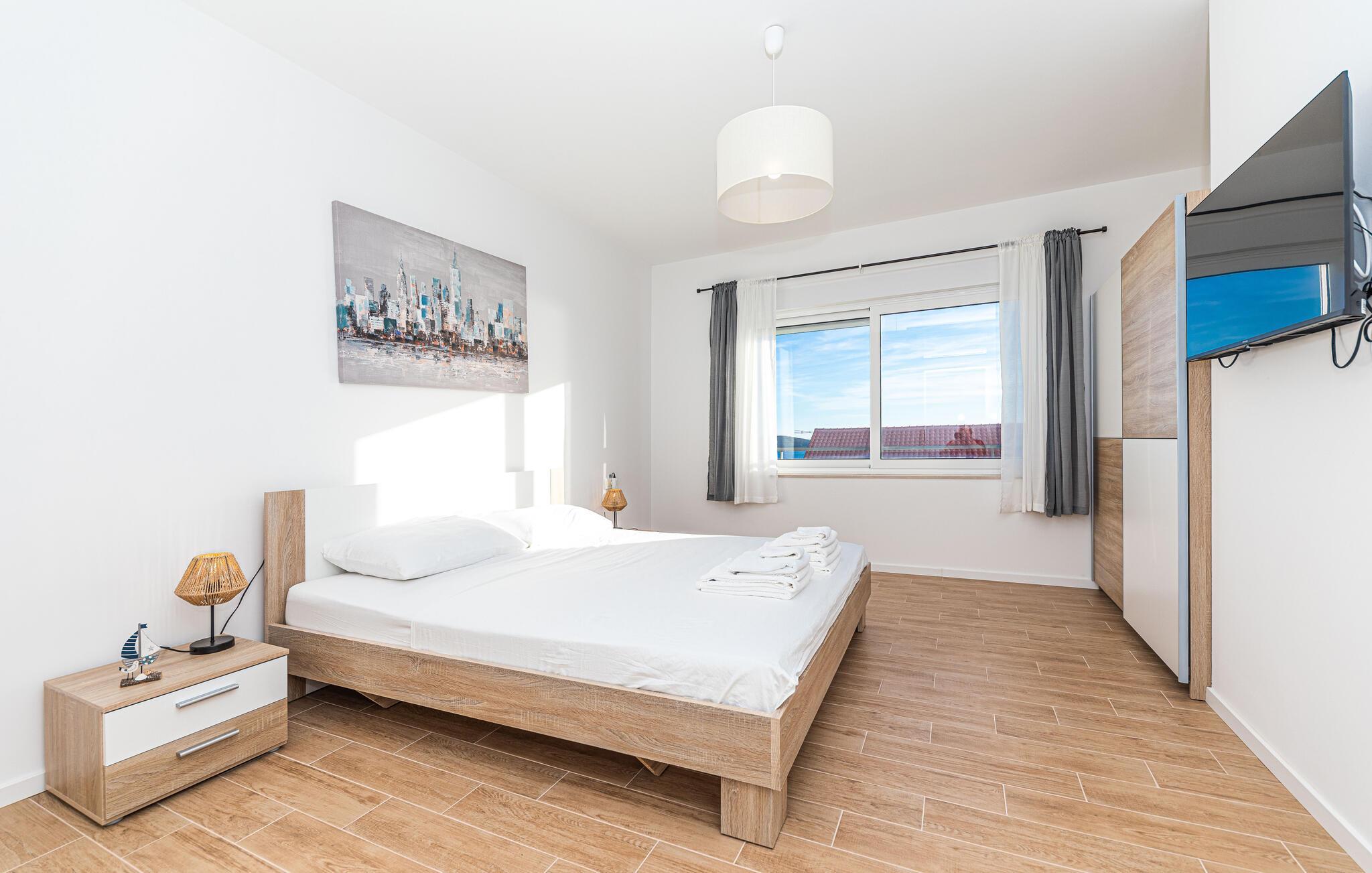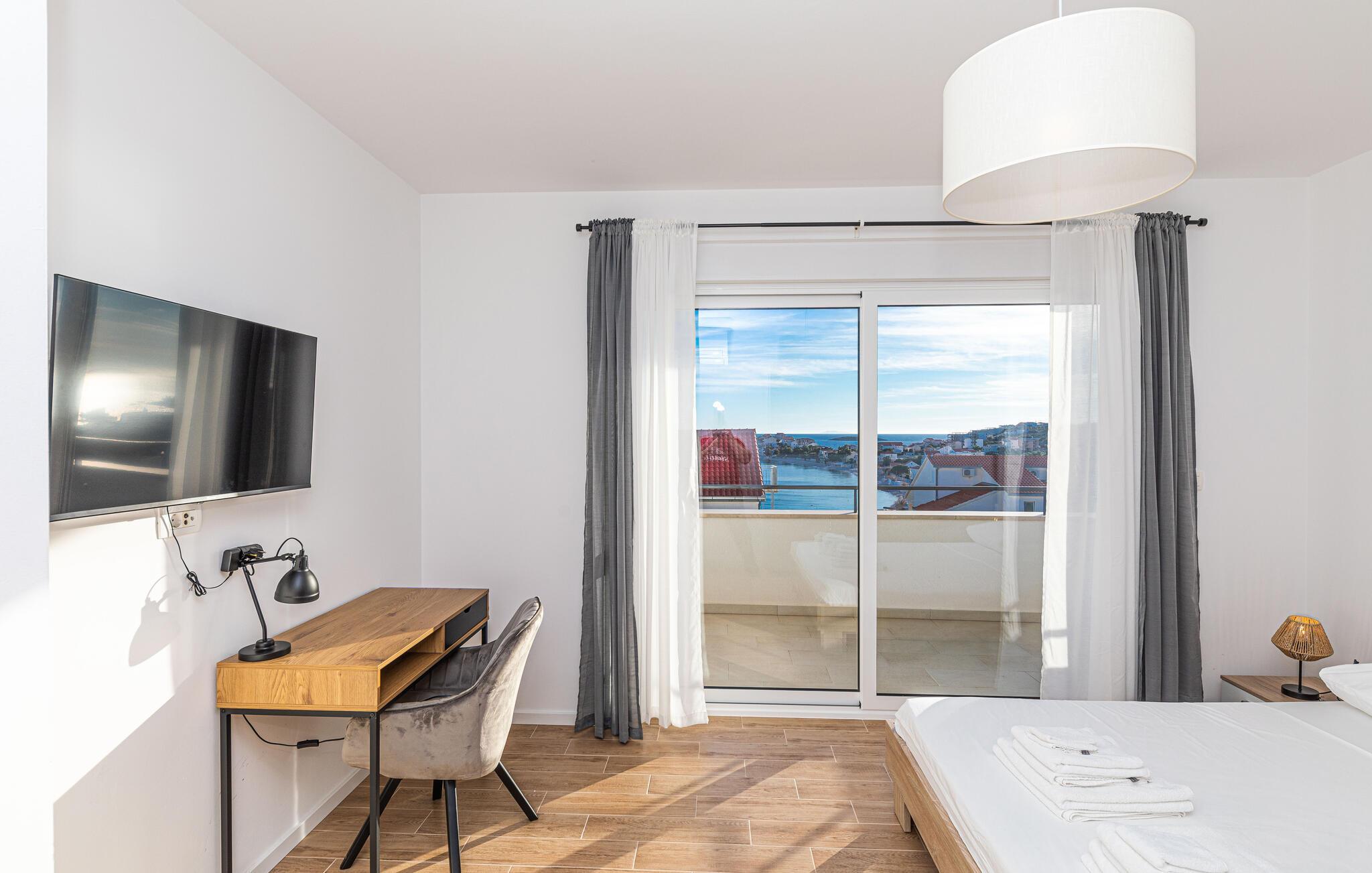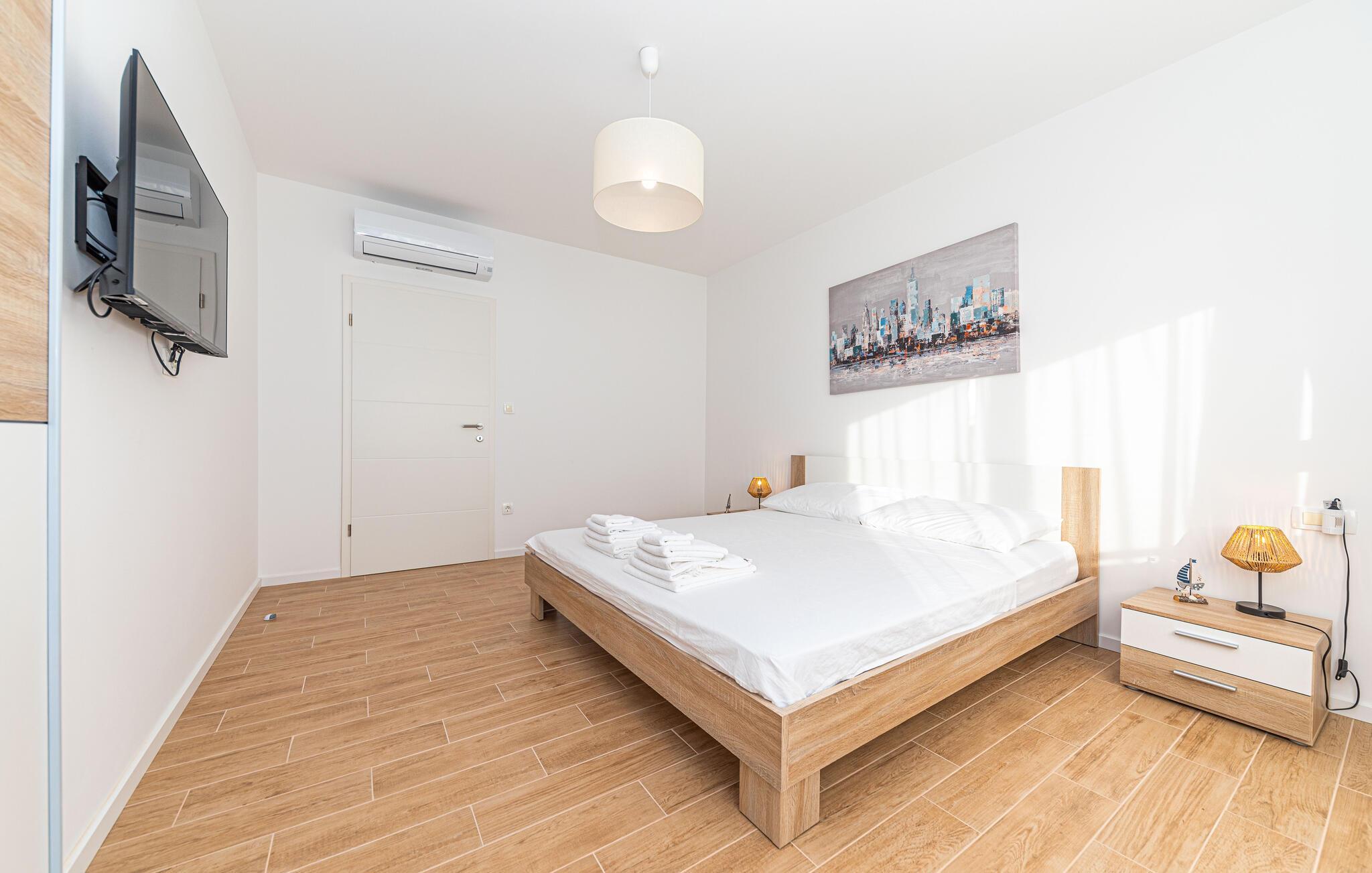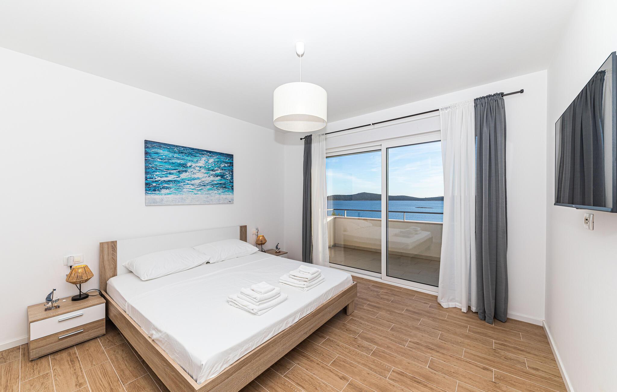 Reisen Sie nach Trogir-Sevid und verbringen einen erholsamen Urlaub in diesem hellen und komfortablen Haus, das keine Ihrer Wünsche offenlässt. Fühlen Sie sich hier wie zuhause und genießen das Ambiente des offenen Wohnraumes, der sich über die Länge des Erdgeschosses zieht und Ihnen Zutritt auf die Terrasse gibt. Im Obergeschoss können Sie die Nachtruhe in den Schlafzimmern genießen und am Morgen langsam auf den Balkonen mit Meerblick aufwachen und Ihren ersten Kaffee trinken. Zum Frühstück können Sie auf der überdachten Terrasse zusammenkommen oder schon die ersten Bahnen im Pool schwimmen.