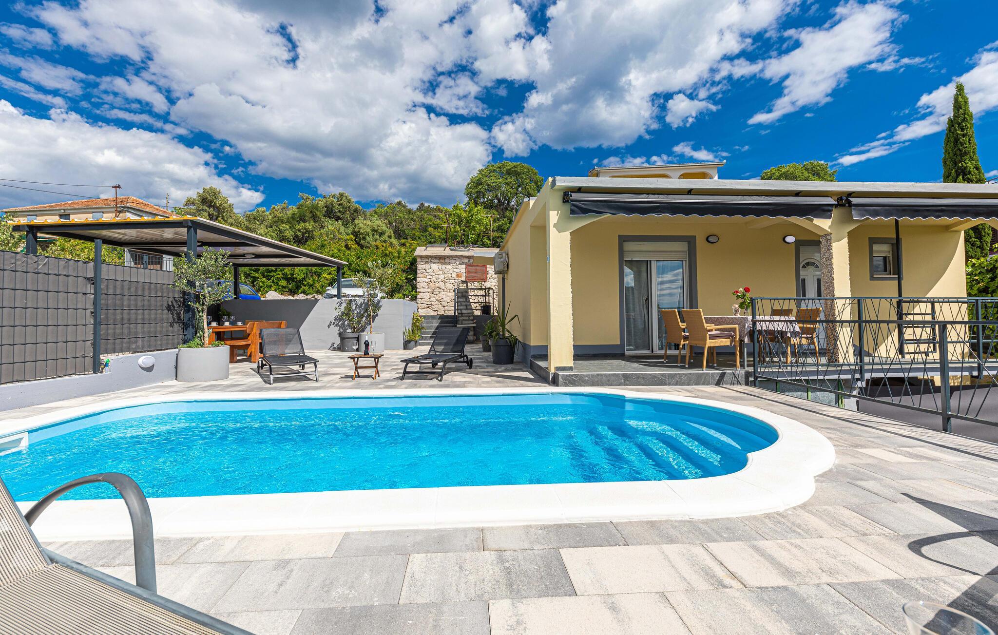 Kommen Sie an und fühlen sich direkt wohl. Die gemütliche Einrichtung mit modernen Akzenten schafft ein behagliches Ambiente. Die liebevoll gestalteten Innenräume bieten Ihnen guten Komfort und laden zum Verweilen ein. Hier finden Sie alles vor, was Sie für Ihren unbeschwerten Urlaub benötigen. Bereiten Sie Ihr Frühstück in der Küche zu und treten damit nach draußen auf die überdachte Terrasse. Die familiäre Atmosphäre des Ferienhauses fügt sich perfekt in diese Umgebung ein. Dank der Lage des Hauses bietet es Ihnen eine traumhafte Panoramaaussicht auf die Bucht, die Sie von der großen Sonnenterrasse aus genießen können. Nutzen Sie den gemauerten Grill für gesellige Abende und entspannen Sie am Pool.