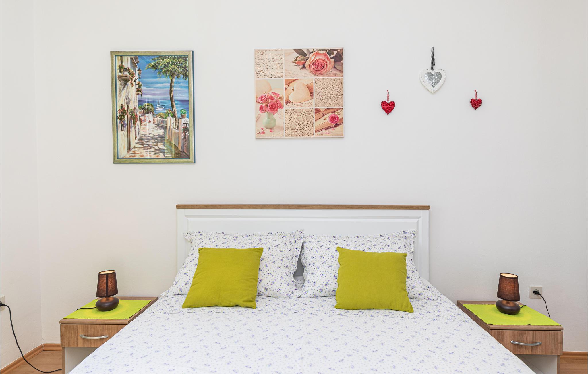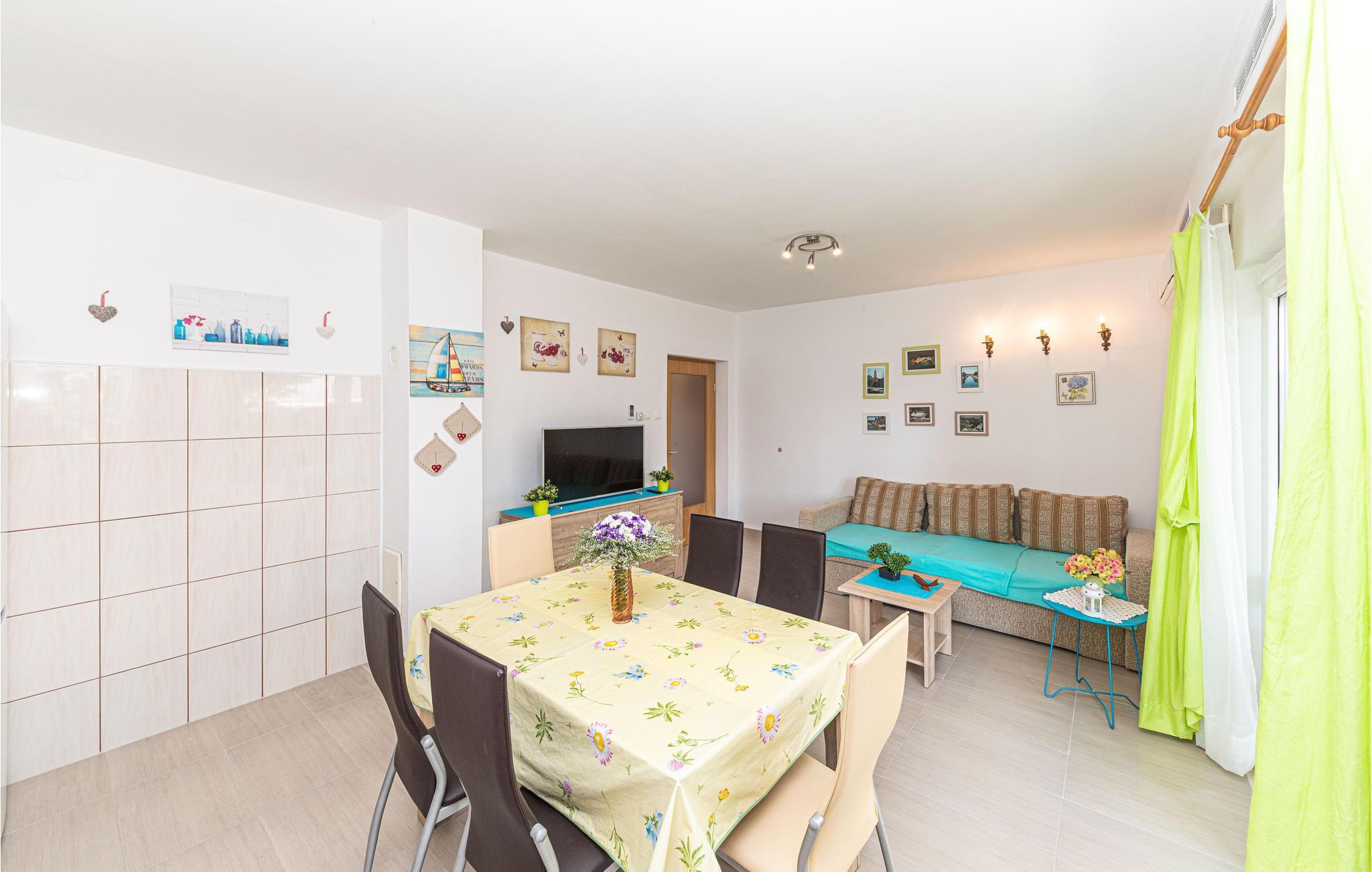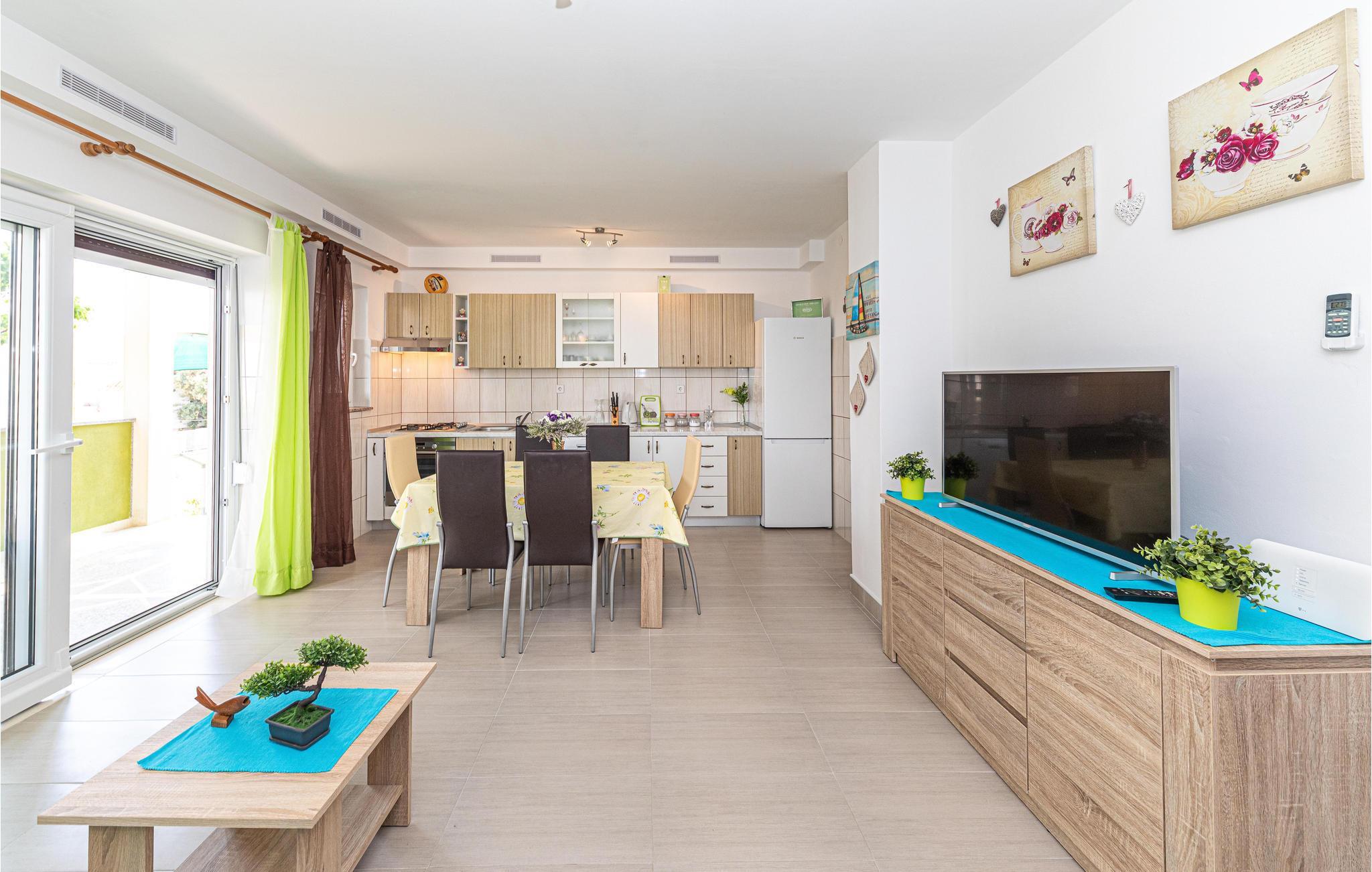 Diese Ferienwohnung befindet sich im Erdgeschoss eines Familienhauses und besteht aus Wohnzimmer, Küche, Bad, zusätzlicher Toilette und zwei Schlafzimmern. Ebenso steht Ihnen eine überdachte Terrasse mit Grill und Gartenmöbeln zu Verfügung. In wenigen Autominuten erreichen Sie den Strand sowie die sehenswerte Altstadt von Trogir, deren romantische Gassen und traumhafte Promenade zum Spazieren und ausgiebigen Bummeln einladen. Sehenswert ist ebenfalls die Altstadt von Split, in der ihre Besucher eine Zeitreise in die Vergangenheit erleben. In den Stadtzentren erwarten Sie viele Restaurants und Tavernen mit ausgezeichneten Fischspezialitäten.