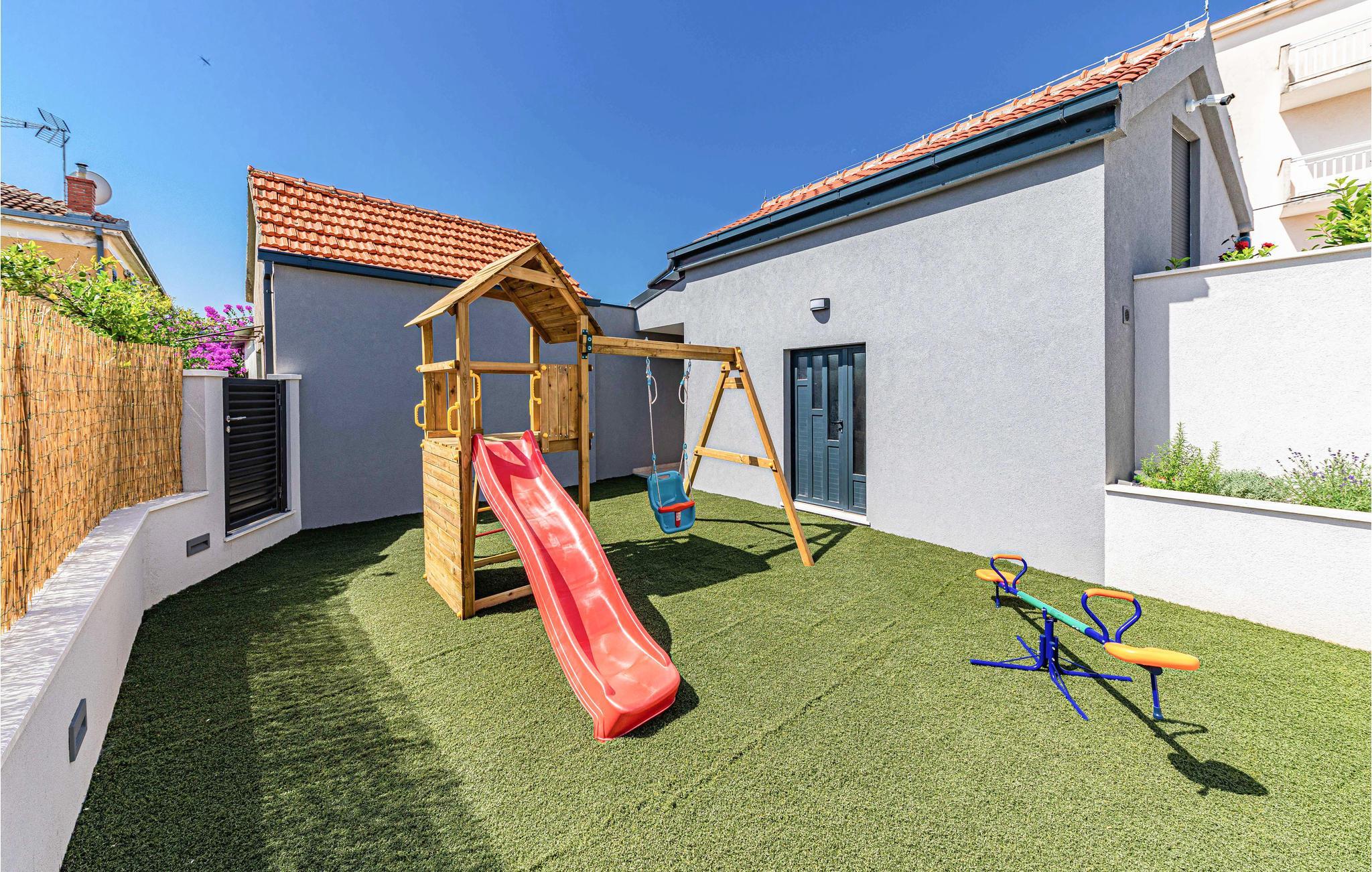 An der Spitze des Hauses haben Sie eine großzügige Dachterrasse mit Außenwhirlpool, in dem Sie sich so richtig entspannen können. Im Erdgeschoss befindet sich der Pool sowie einen Spielplatz mit u.a. einer Schaukel und Rutsche im Anbau für die kleinen Gäste.