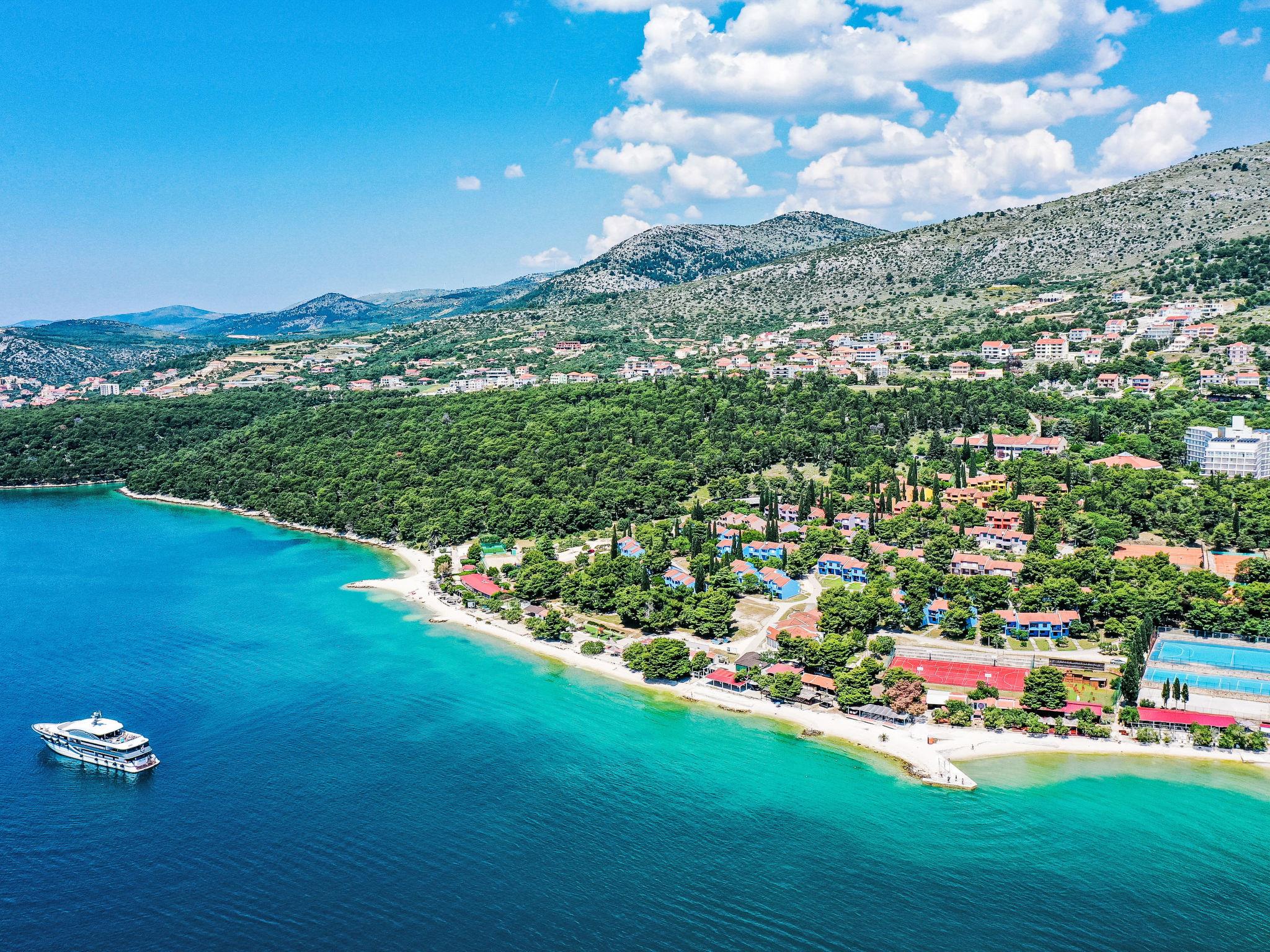 Ferienanlage "Medena". Im Ortsteil Seget Donji, 3 km vom Zentrum von Trogir, 30 km vom Zentrum von Split, direkt am Meer. Zur Mitbenutzung: Grundstück mit Pflanzen und Bäumen, 3 Schwimmbäder (31 m2, 140 cm tief, saisonale Verfügbarkeit: 01.Apr. - 01.Nov.) mit Innentreppe. Kinderbecken, Aussendusche, Tennis (extra), Basketball (extra), Kinderspielplatz. In der Anlage: Empfang, Restaurant, Internetzugang, Wäscherei. Zur Verfügung: Fahrräder (extra). Frühstück Vollpension Halbpension möglich auf Anfrage (extra). Abholservice vom Flughafen (extra). Parkplatz (extra) auf dem Grundstück. Bushaltestelle 650 m. Objekt geeignet für 2 Erwachsene + 2 Kinder. Bitte beachten: Flugplatz 8 km vom Haus. Das Foto ist nur ein Hausbeispiel. Eine Doppel-Schlafsofai m Wohn-/Essbereich ist nur für 2 Kinder bis zu 12 Jahren geeignet.