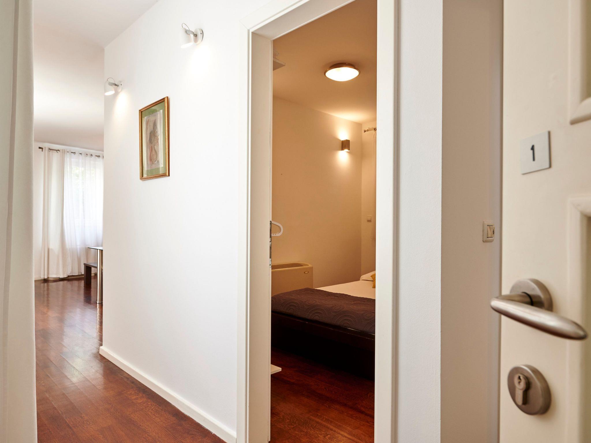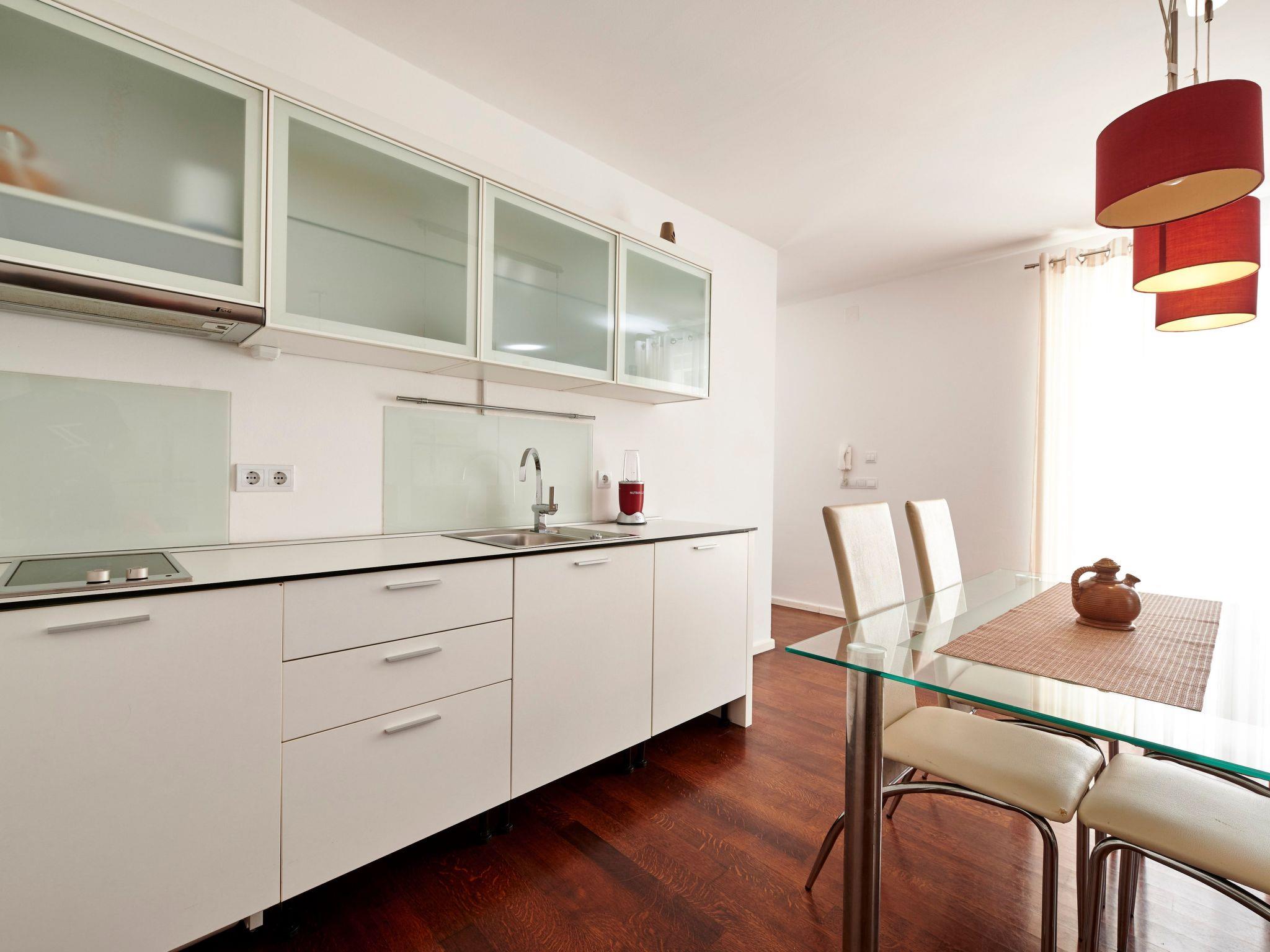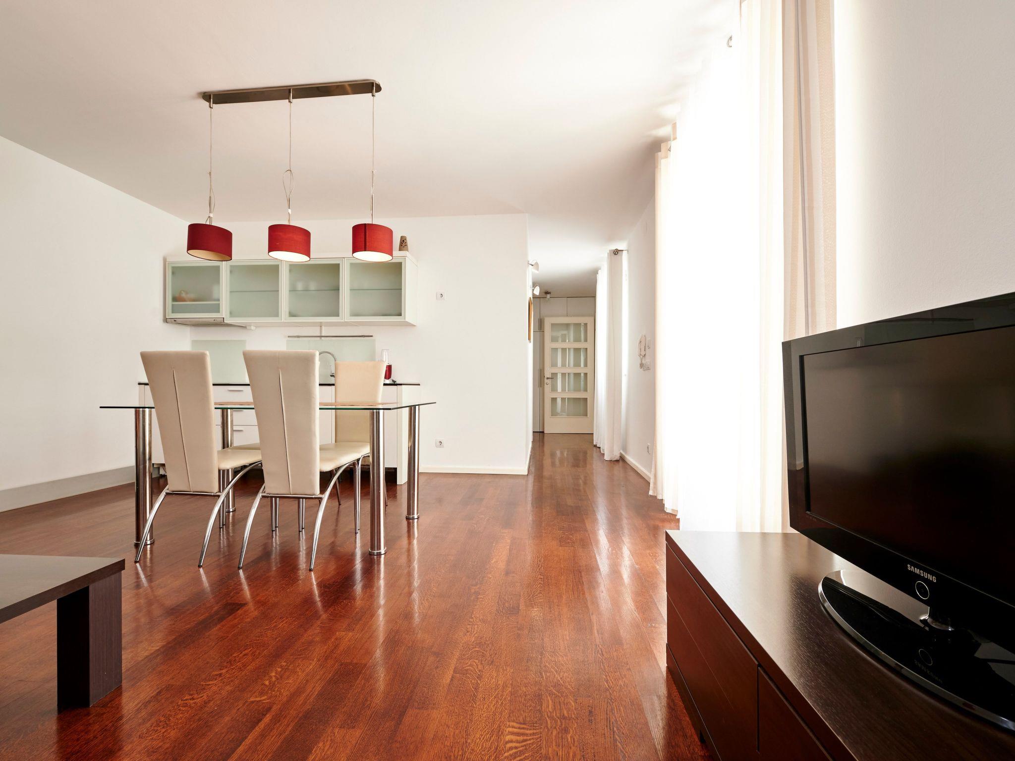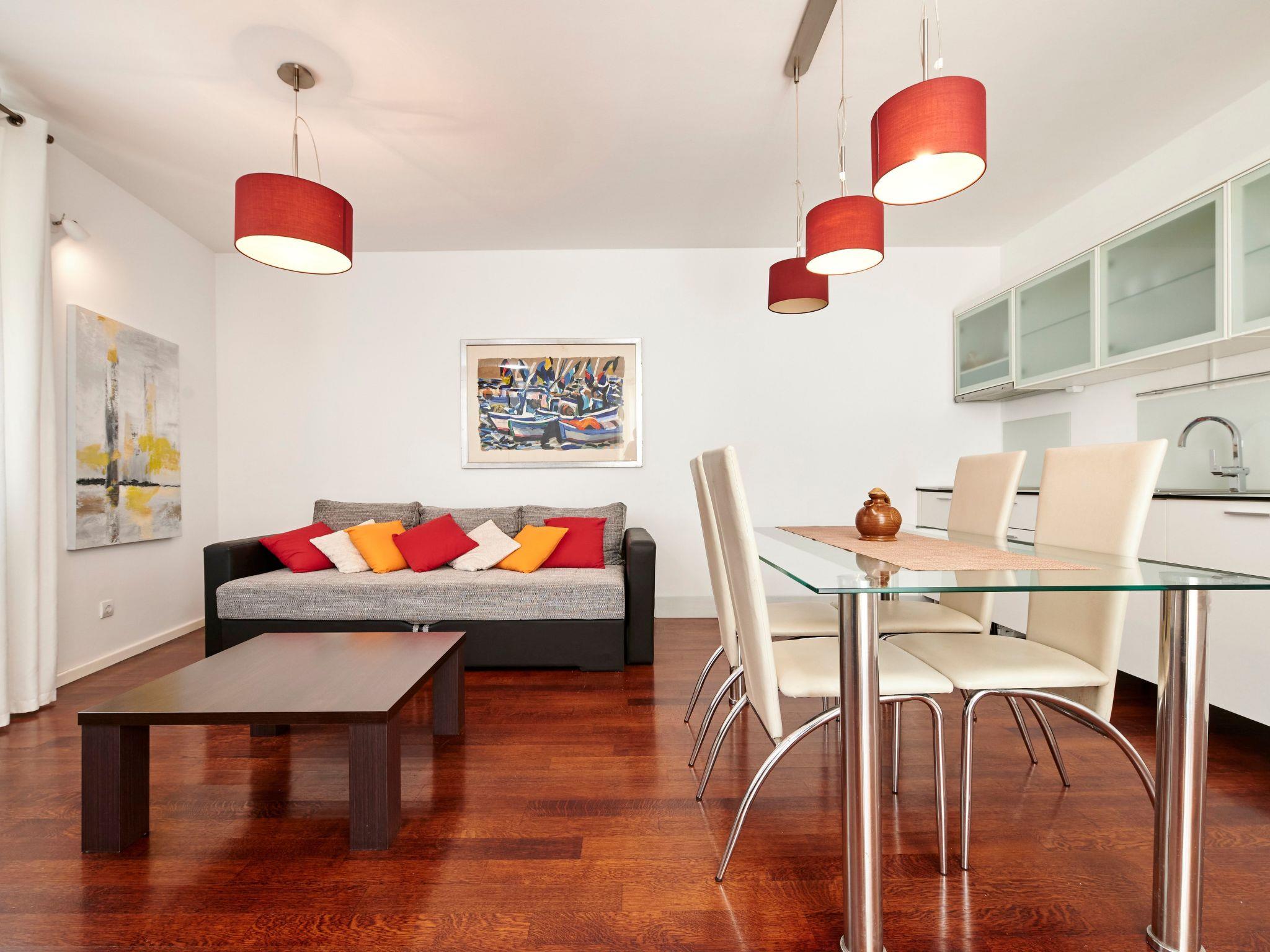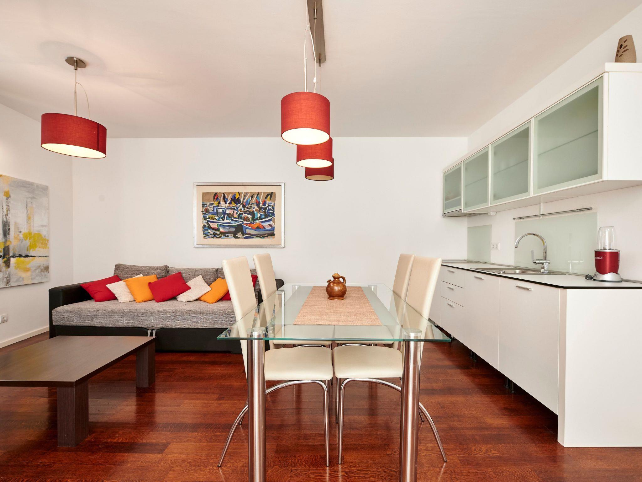 Dies ist eine Einzimmerwohnung mit einem privaten Schlafzimmer. Es ist für 4 Personen geeignet. Es gibt ein Doppelbett im Schlafzimmer (1,60m breit). Wohnzimmer und Esszimmer mit Küche befinden sich im Komplex. Das Sofa im Wohnzimmer bietet Platz für eine dritte Person. Schlafzimmer und Bad sind durch einen Flur mit den anderen Räumen verbunden. Das Badezimmer mit Dusche hat eine Fußbodenheizung. Heizung ist überall in dieser 60m Quadrat Wohnung. Kostenloses Wi-Fi, SAT TV, Bettwäsche und Handtücher werden den Gästen zur Verfügung gestellt.