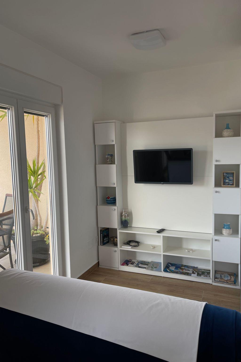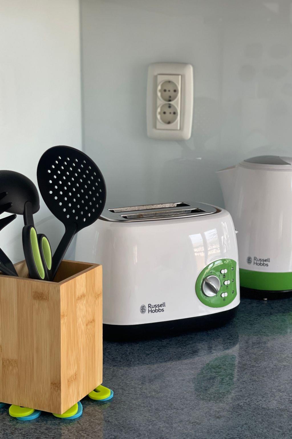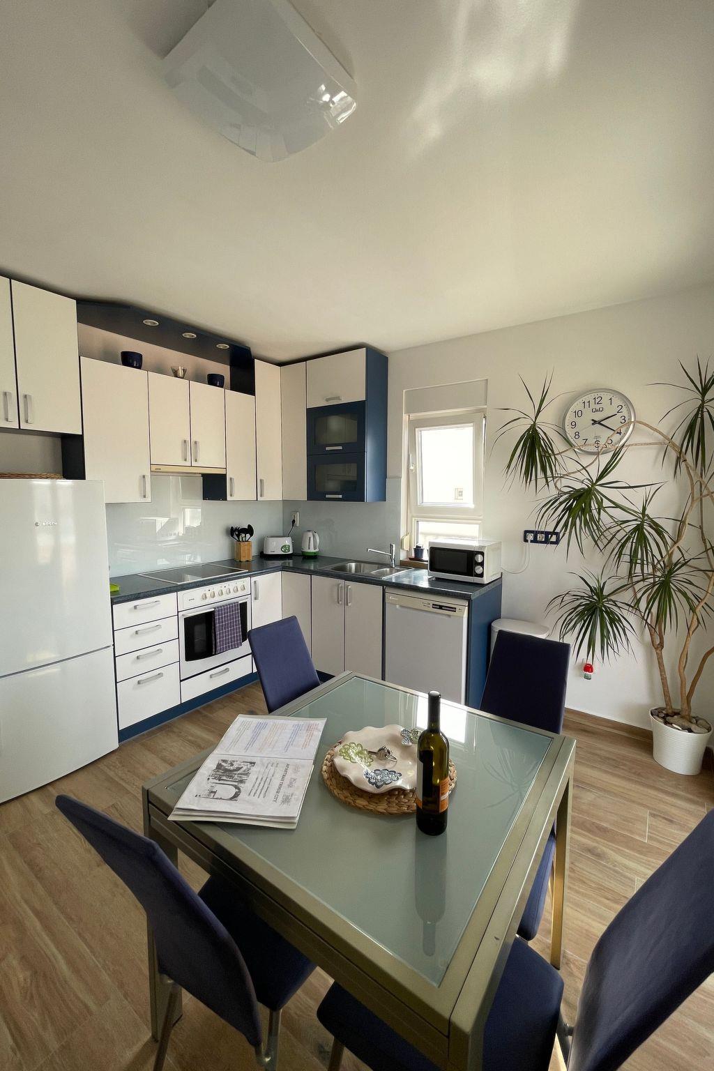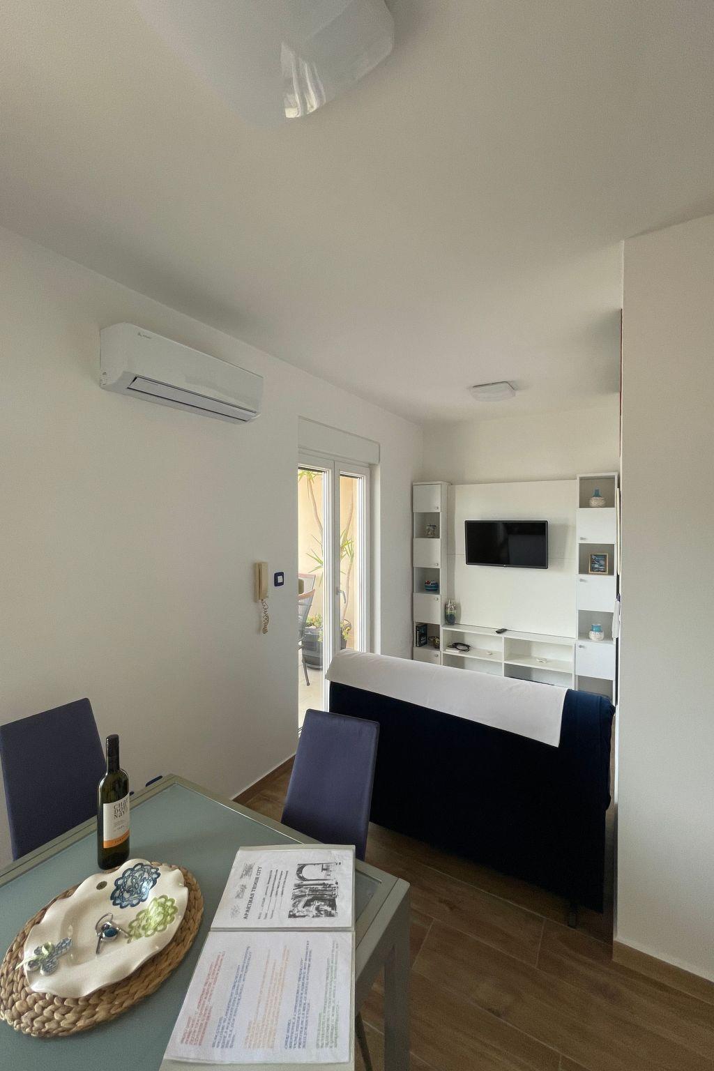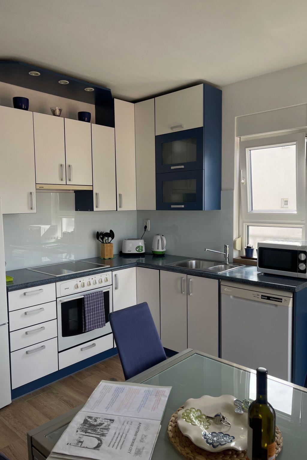 Die Ferienwohnung befindet sich in der zweiten Etage des vierstöckigen Wohnhauses, das 2004 neu gebaut wurde. Sie besteht aus einem hellen Wohn- und Esszimmer mit integrierter, offener Küche, einem Schlafzimmer und einem geräumigen Tageslichtbad. Das klimatisierte (kühl/warm) Wohnzimmer verfügt über ein bequemes Sofa, einen breiten Flachbildfernseher mit Satellitenkanälen, einen USB-Anschluss und ein Home-Entertainment-System, einen CD-Player, ein Radio und einen Glas-Esstisch mit vier Stühlen. Gleich daneben befindet sich die moderne Einbauküche mit Geschirrspüler, Cerankochfeld mit Dunstabzug, Elektrobackofen, Kühlschrank mit Gefrierfach, Mikrowelle, Wasserkocher, Toaster und Kaffeemaschine. Das Schlafzimmer verfügt über ein 150 cm x 200 cm großes Doppelbett, Nachttische mit Leselampen und einen Wandschrank mit viel Stauraum für Ihre Kleidung und Ihr Gepäck. Das Sofa im Wohnzimmer kann zu einem zusätzlichen, 140 x 200 cm großen Doppelbett für eine weitere Person umgebaut werden. Das Badezimmer verfügt über eine Duschkabine, ein Waschbecken mit Unterschrank und Wandspiegel, einen Haartrockner, eine Toilette und eine Waschmaschine. Bettwäsche und Handtücher sind in ausreichender Menge vorhanden, ebenso wie ein zuverlässiger und kostenloser drahtloser Internetzugang.