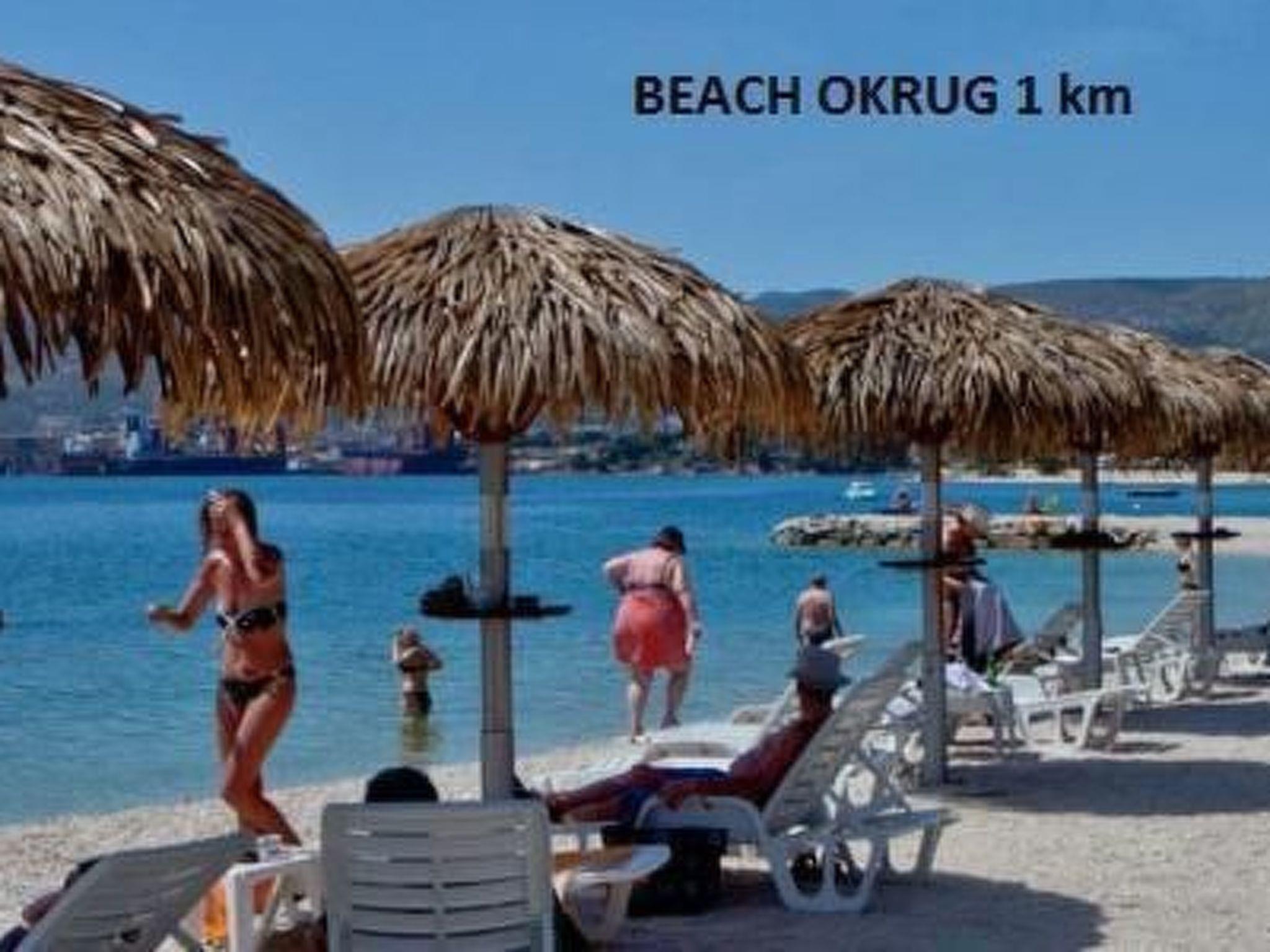 Die Ferienwohnung liegt nur ca. 200 m vom nächsten Betonstrand entfernt, die belebteren Strände Rozac (ca. 800 m entfernt) und Okrug (ca. 1 km entfernt) mit Liegestühlen und Sonnenschirmen. Zum Zentrum der Altstadt mit ihren romantischen Gassen, historischen Sehenswürdigkeiten, interessanten Geschäften, bunten Märkten und einem guten Angebot an Cafés und Restaurants mit internationalen und dalmatinischen Spezialitäten sind es nur etwa 500 Meter.