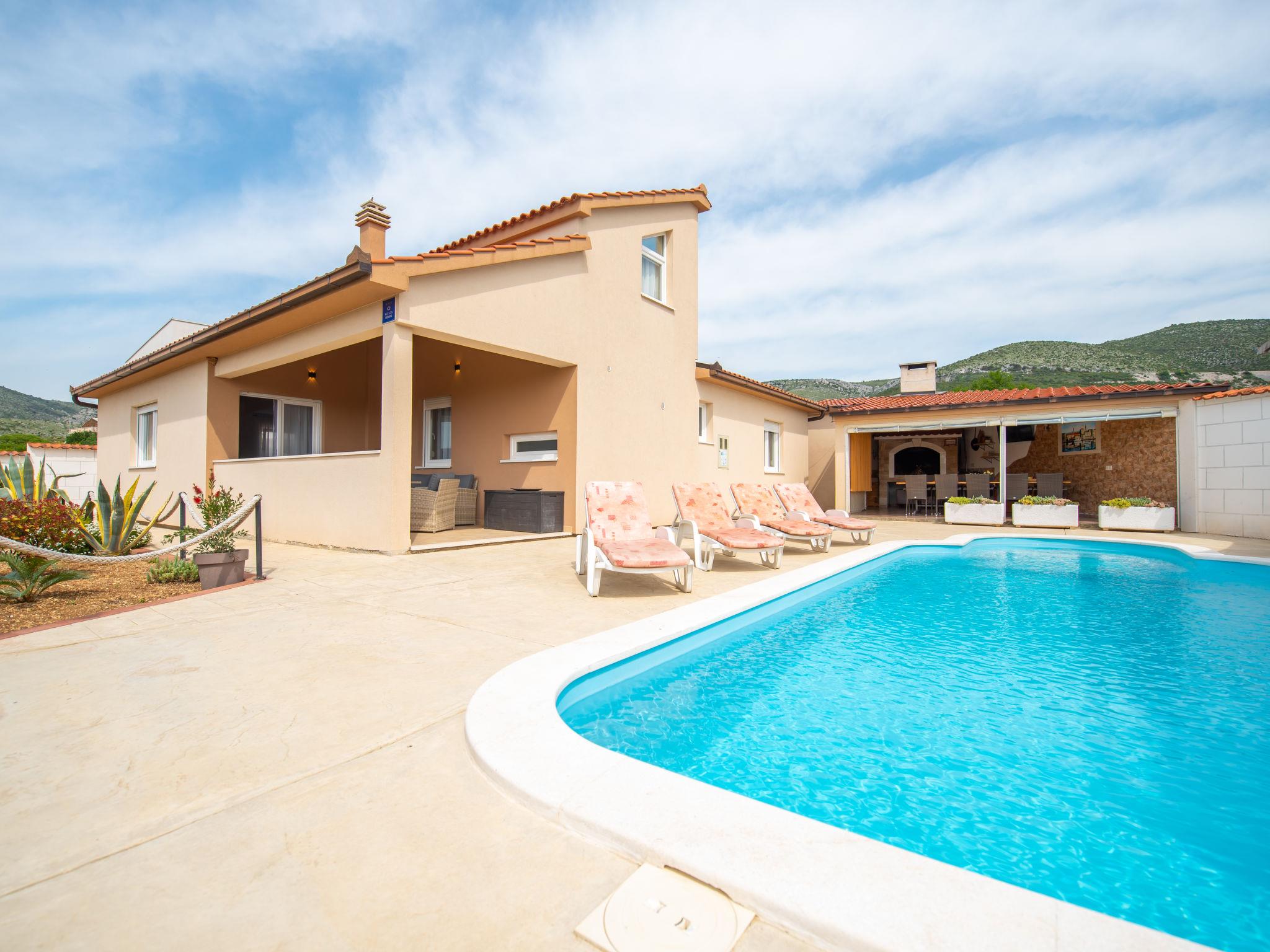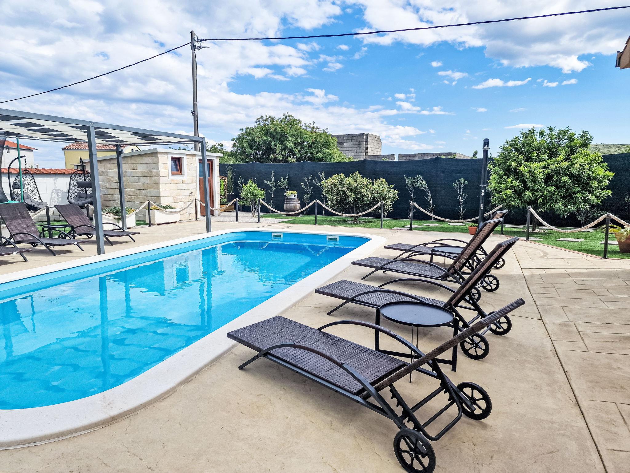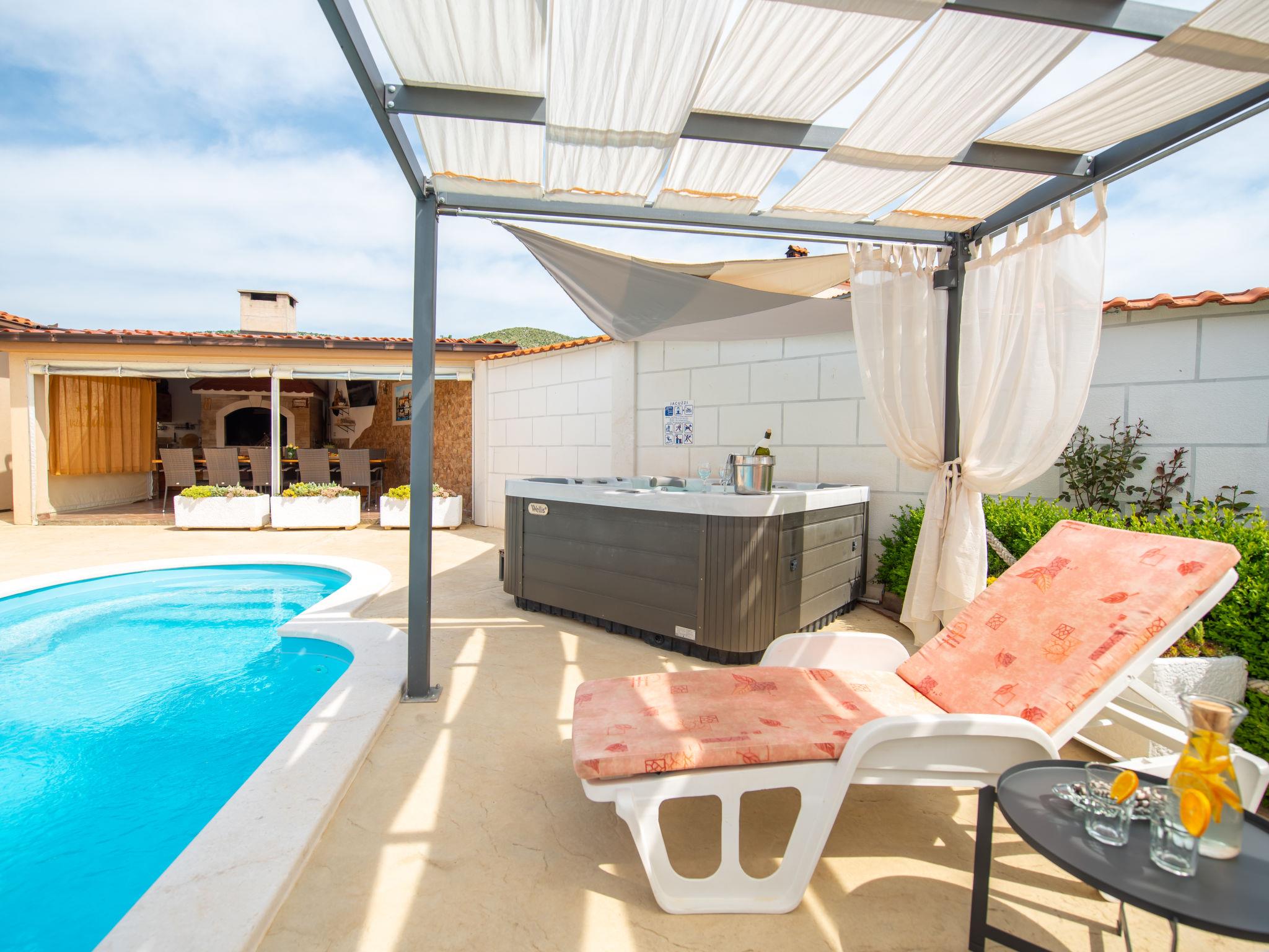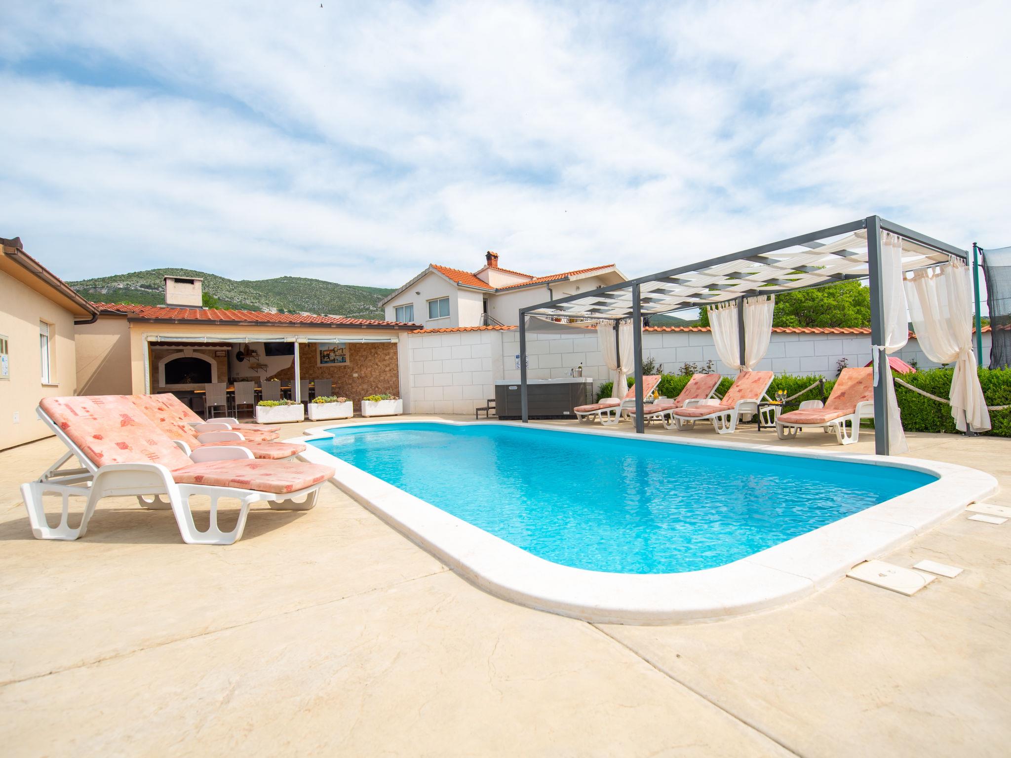 Einfamilienhaus "Luka", auf 2 Stockwerken. Im Weiler Plano, 7 km vom Zentrum von Trogir, 5 km vom Meer. Zur Alleinbenutzung: Grundstück 800 m2 (eingezäunt) mit Pflanzen, Schwimmbad eckig, beheizt (10 x 3 m, 150 cm tief, saisonale Verfügbarkeit: 01.Mai. - 01.Okt.) mit Innentreppe. Aussendusche, Sprudelbad, Poolhaus mit Kühlschrank und Kochherd, Terrasse (50 m2). Im Hause: Internetzugang, Fitnessraum, Tischfussball, Trampolin, Waschmaschine. Parkplatz (für 3 Autos) beim Haus auf dem Grundstück. Einkaufsgeschäft 900 m, Supermarkt 3 km, Restaurant 3 km, Bushaltestelle 350 m, Kieselstrand 5 km. Bitte beachten: Flugplatz 5 km vom Haus.
