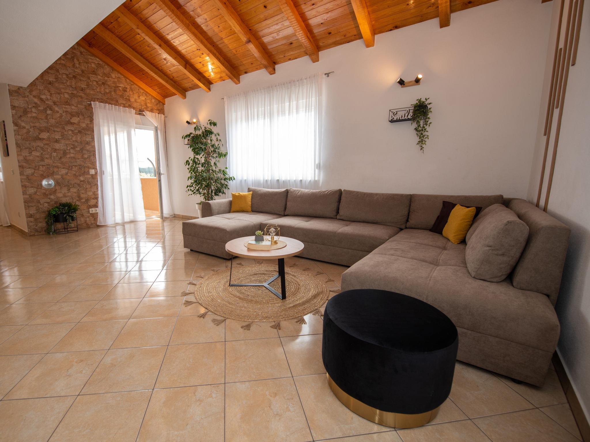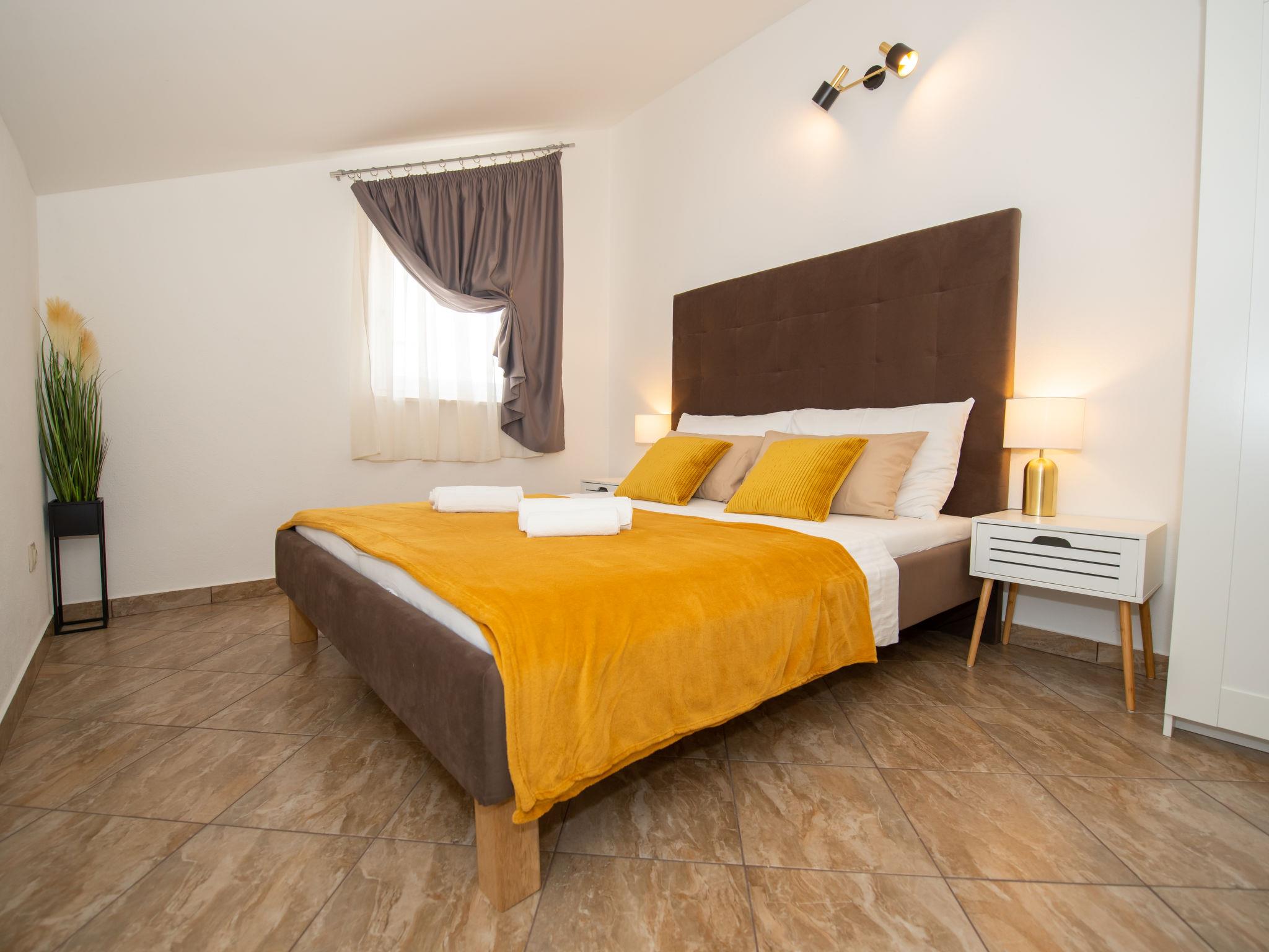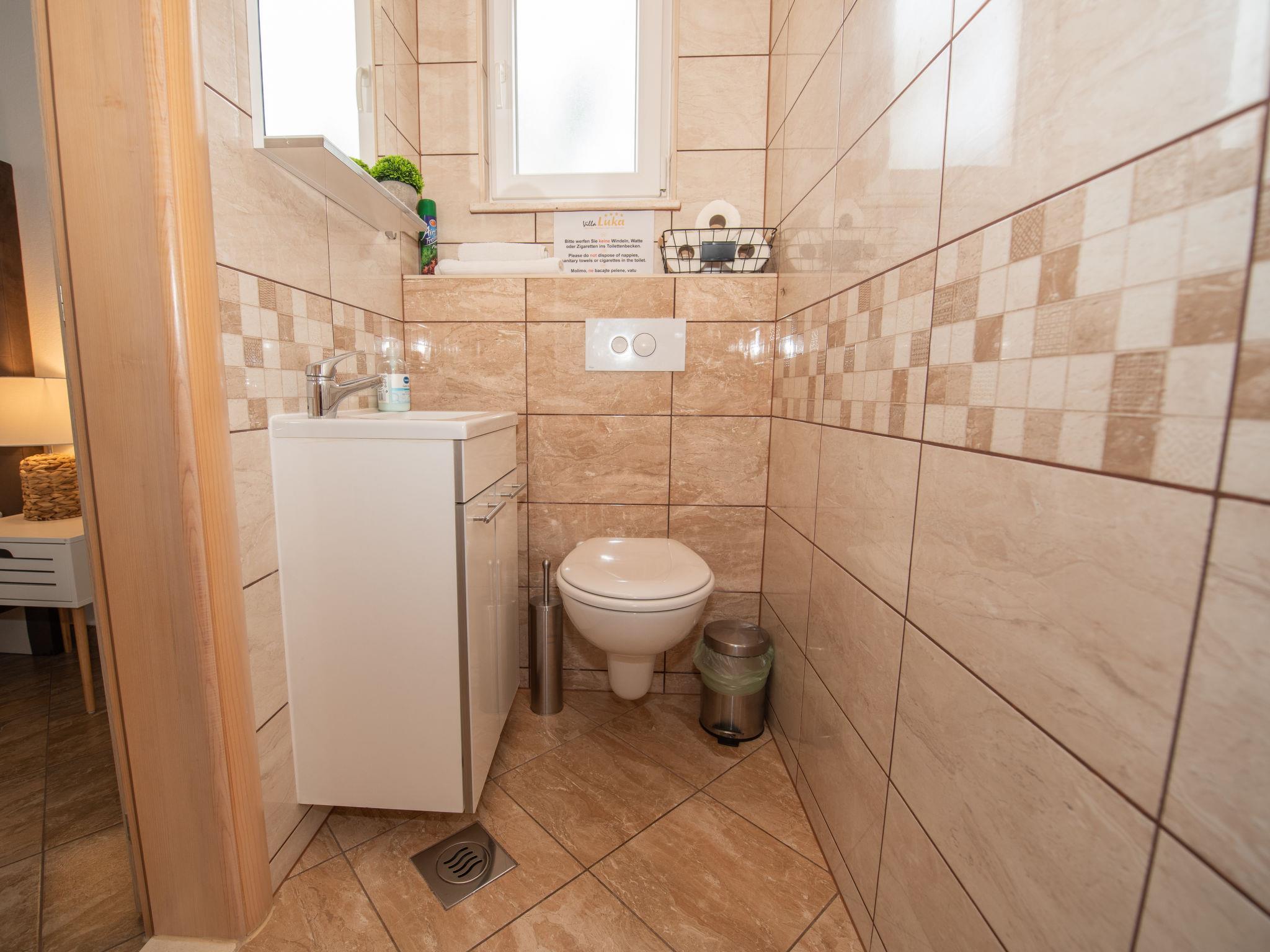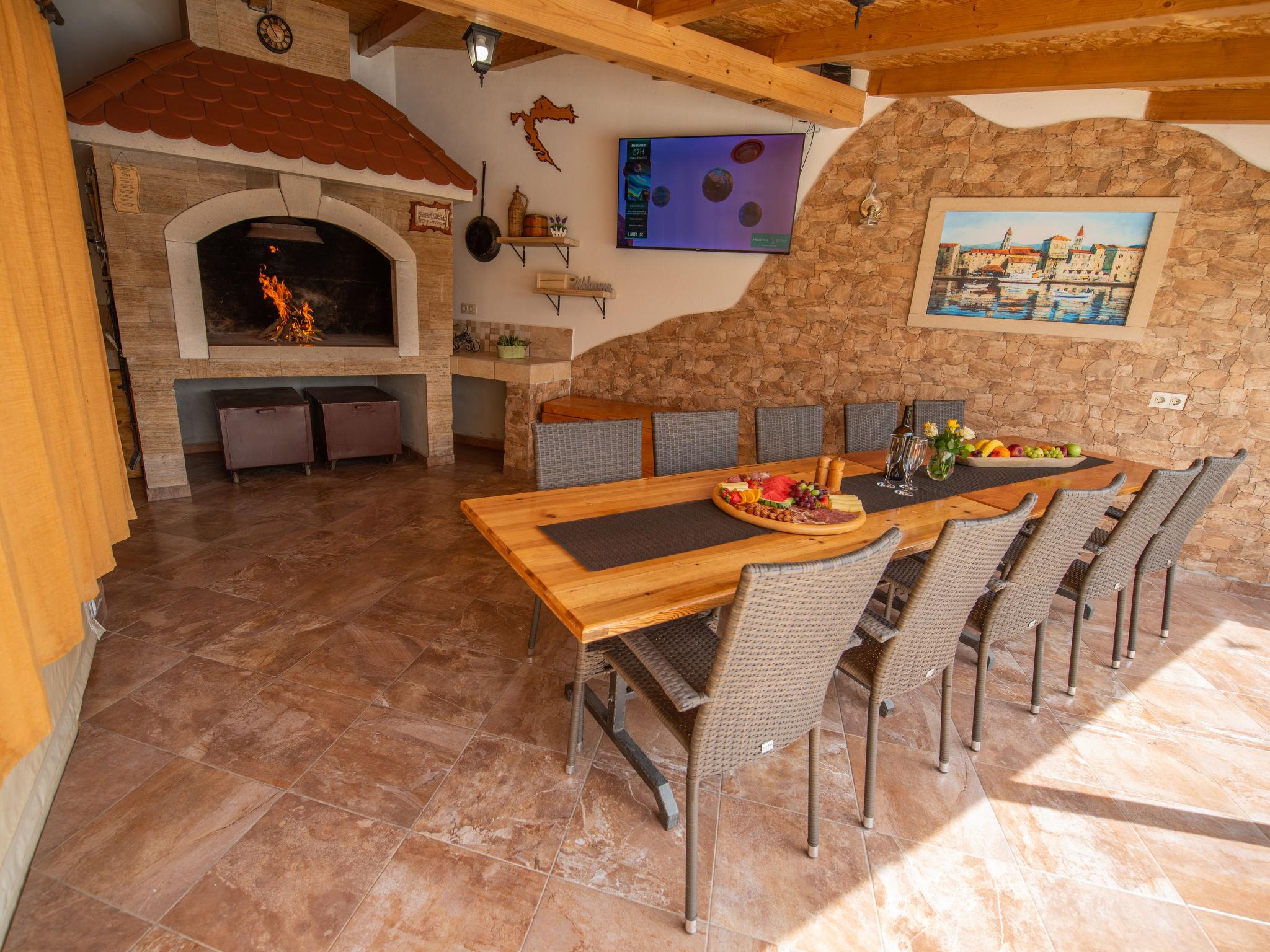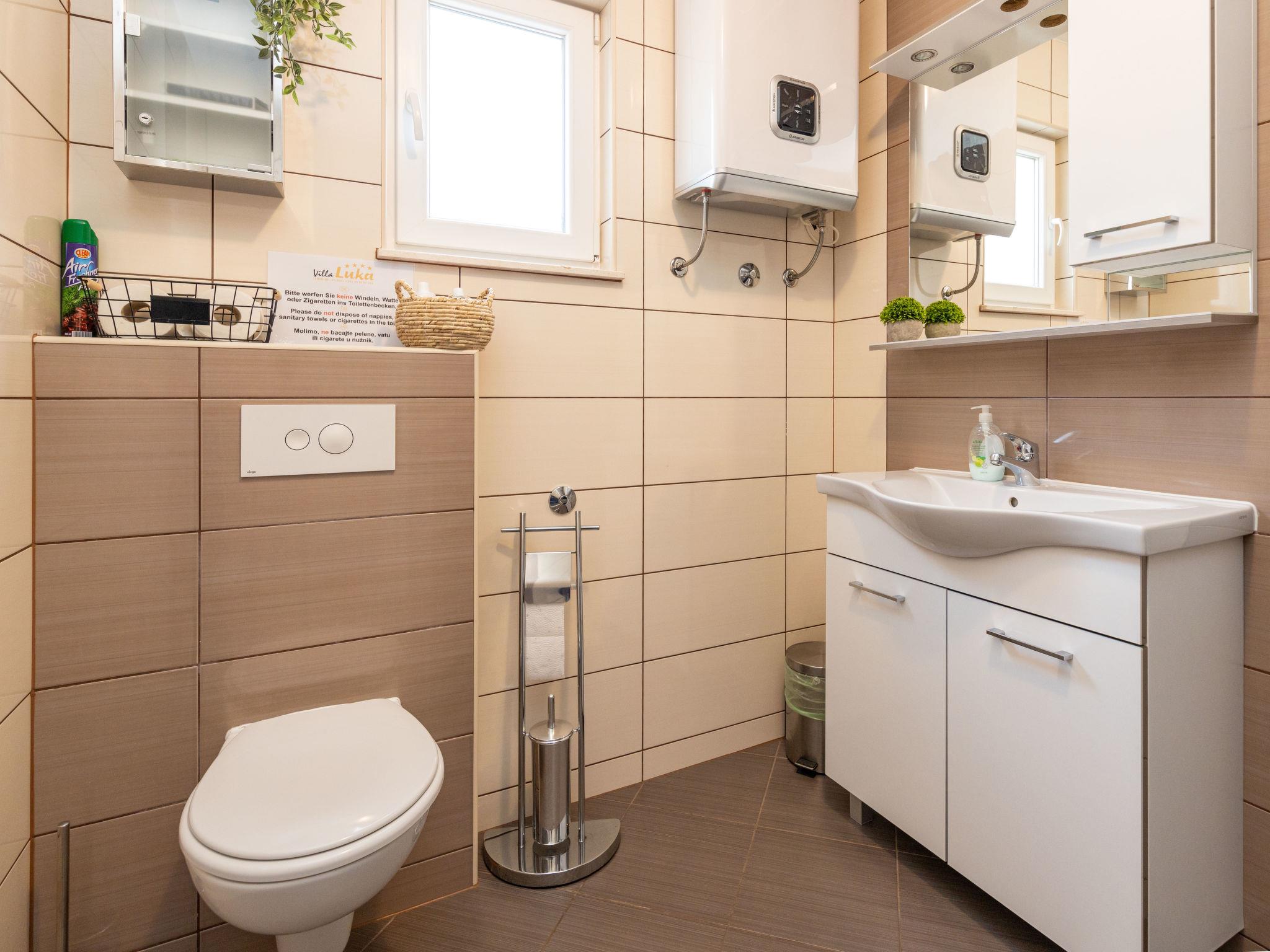 Einfamilienhaus "Luka", auf 2 Stockwerken. Im Weiler Plano, 7 km vom Zentrum von Trogir, 5 km vom Meer. Zur Alleinbenutzung: Grundstück 800 m2 (eingezäunt) mit Pflanzen, Schwimmbad eckig, beheizt (10 x 3 m, 150 cm tief, saisonale Verfügbarkeit: 01.Mai. - 01.Okt.) mit Innentreppe. Aussendusche, Sprudelbad, Poolhaus mit Kühlschrank und Kochherd, Terrasse (50 m2). Im Hause: Internetzugang, Fitnessraum, Tischfussball, Trampolin, Waschmaschine. Parkplatz (für 3 Autos) beim Haus auf dem Grundstück. Einkaufsgeschäft 900 m, Supermarkt 3 km, Restaurant 3 km, Bushaltestelle 350 m, Kieselstrand 5 km. Bitte beachten: Flugplatz 5 km vom Haus.