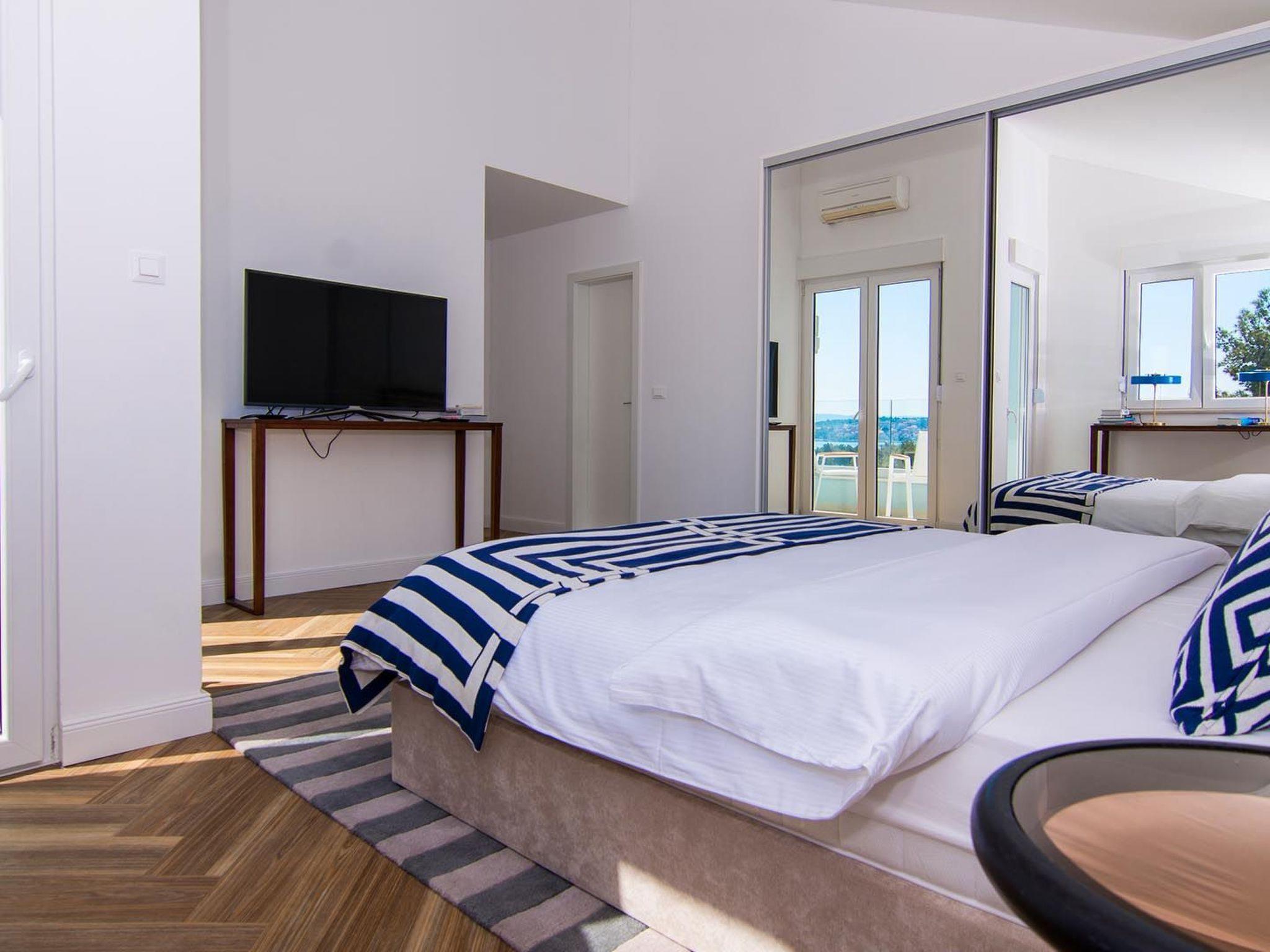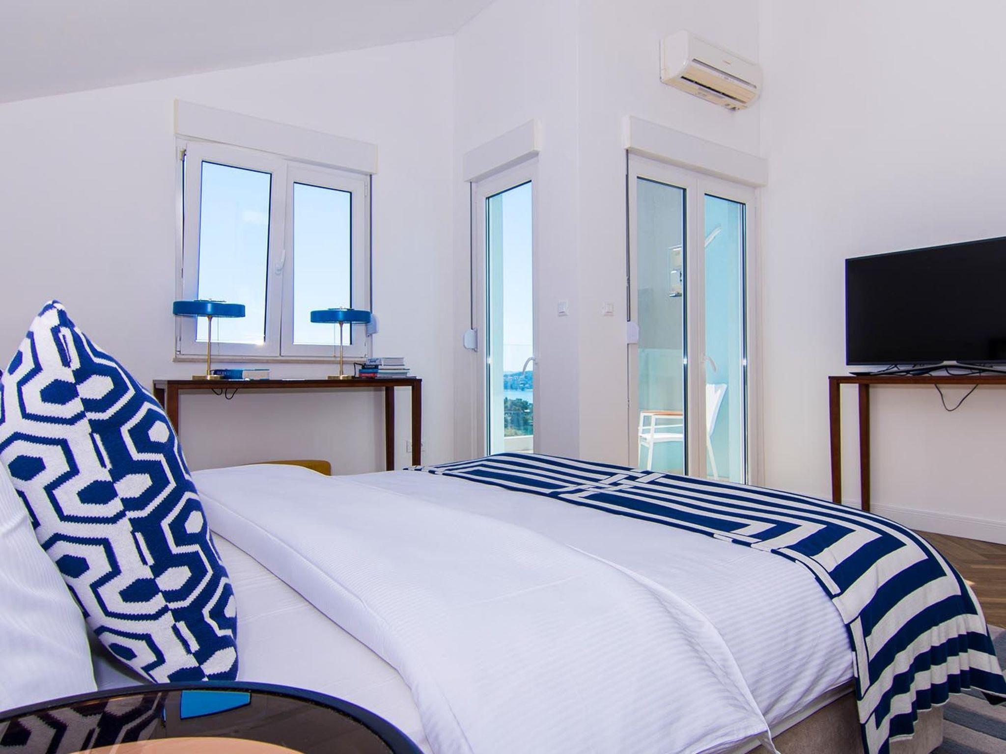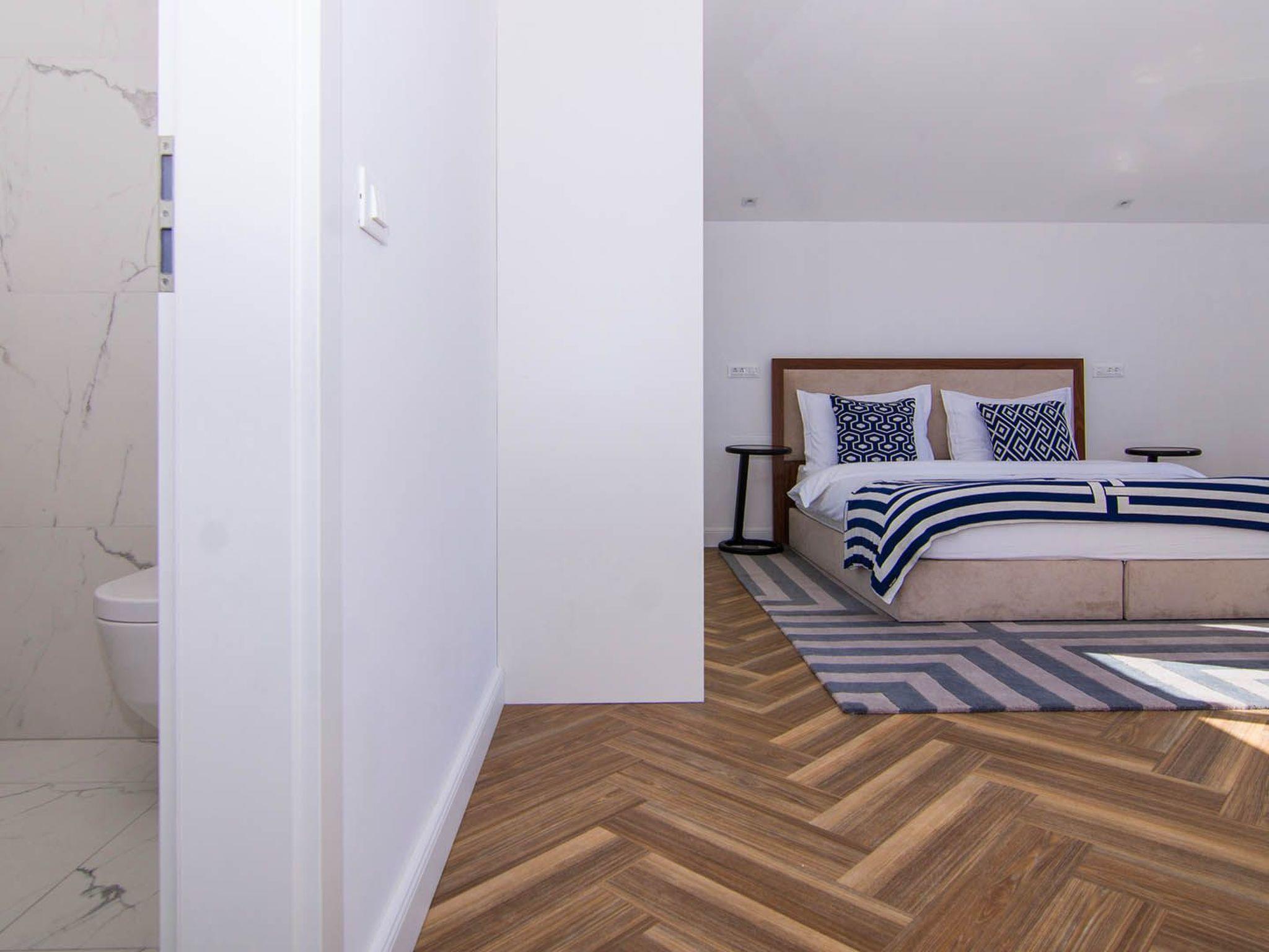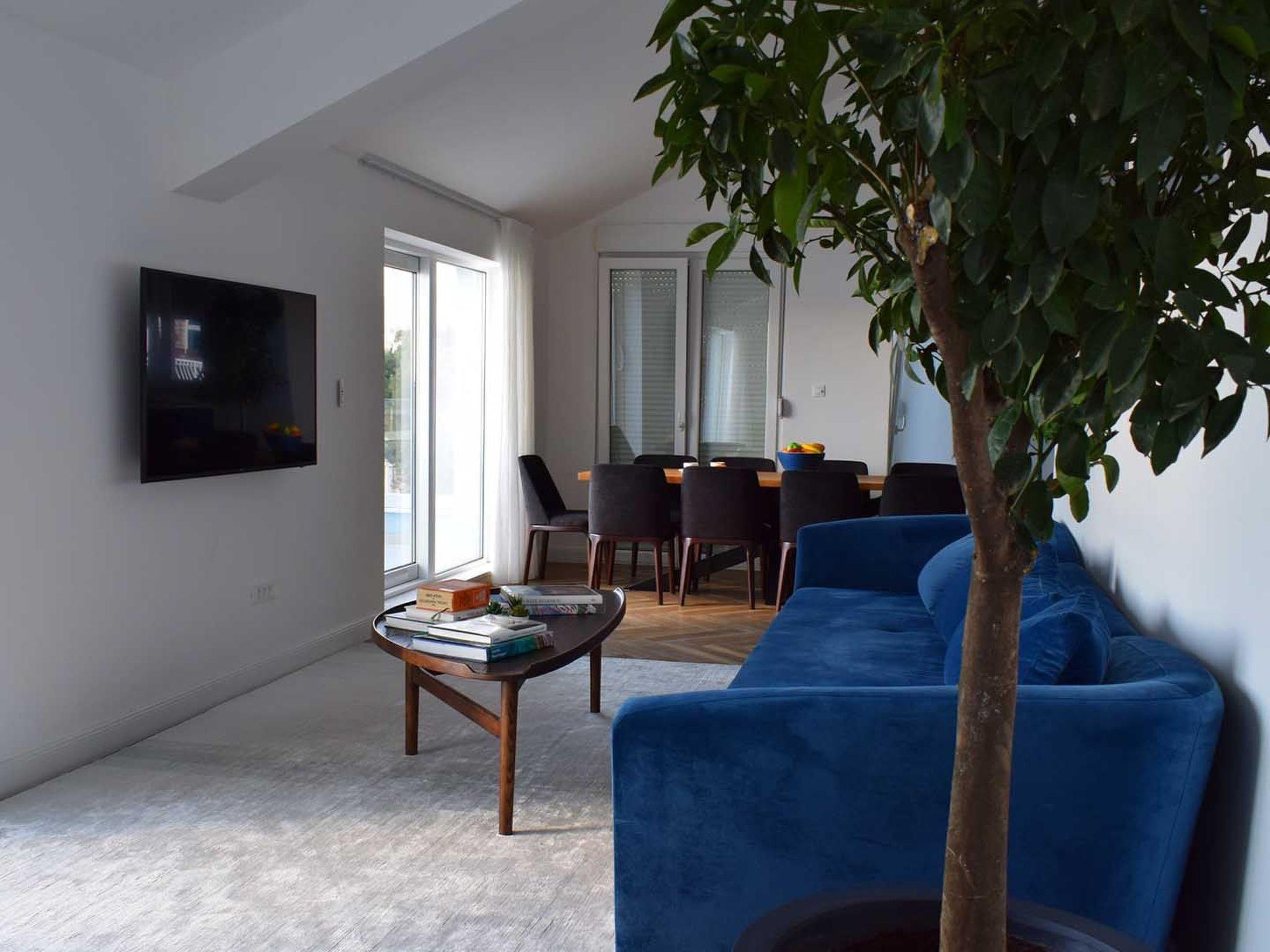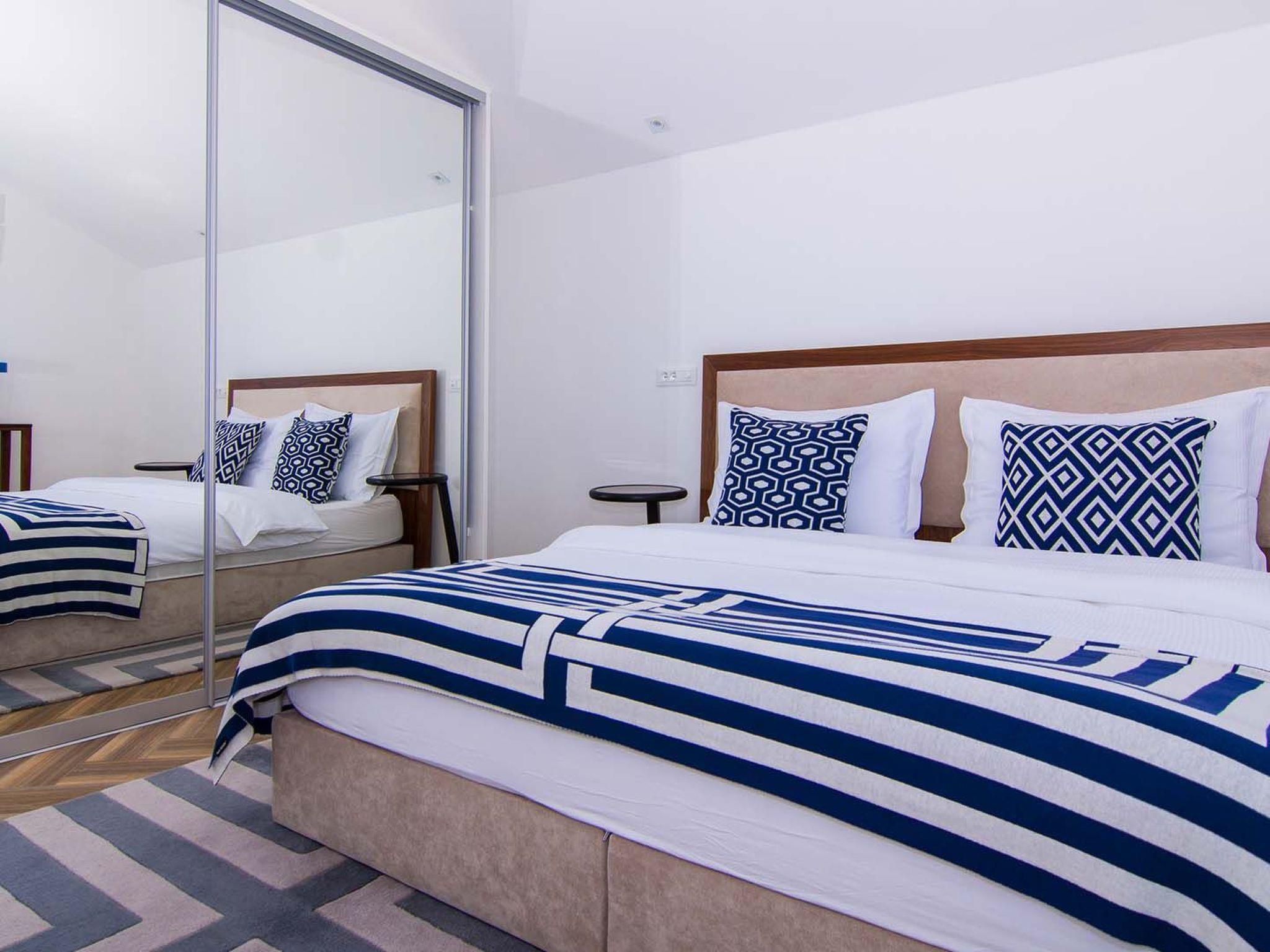 Das Apartment White Sky ist ein Duplex-Apartment. Die Wohnung besteht aus 5 Doppelschlafzimmern mit angrenzenden Bädern, 1 Halbbad, komfortablem und elegant eingerichtetem Wohnzimmer mit Essbereich und komplett ausgestatteter offener Küche. Das Wohnzimmer hat Zugang zu einem geräumigen Balkon mit atemberaubendem Meerblick, der sich über die umliegende Küste erstreckt. Die stilvolle Einrichtung verleiht der gesamten Wohnung einen unverwechselbaren Charakter und Charme. Die Wohnung hat eine Fläche von 200 m2 und zusätzlich einen 60 m2 großen Balkon. Die Wohnung White Sky kann bis zu 11 Personen beherbergen. Penthouse-Wohnung White Sky ist voll klimatisiert und ausgestattet mit Wi-fi, SAT-TV, Bügeleisen und Bügelbrett, Babybett, Hochstuhl, Herd, Backofen, Dunstabzugshaube, großer Kühlschrank mit Gefrierfach, Geschirrspüler, Mikrowelle (auf Anfrage erhältlich), Wasserkocher, Kaffeemaschine, Waschmaschine und Haartrockner. Das Grundstück bietet kostenlose Parkplätze. Genießen Sie Ihren Aufenthalt in der luxuriösen Wohnung mit Meerblick White Sky und verbringen Sie einen unvergesslichen Urlaub auf der Insel Ciovo!