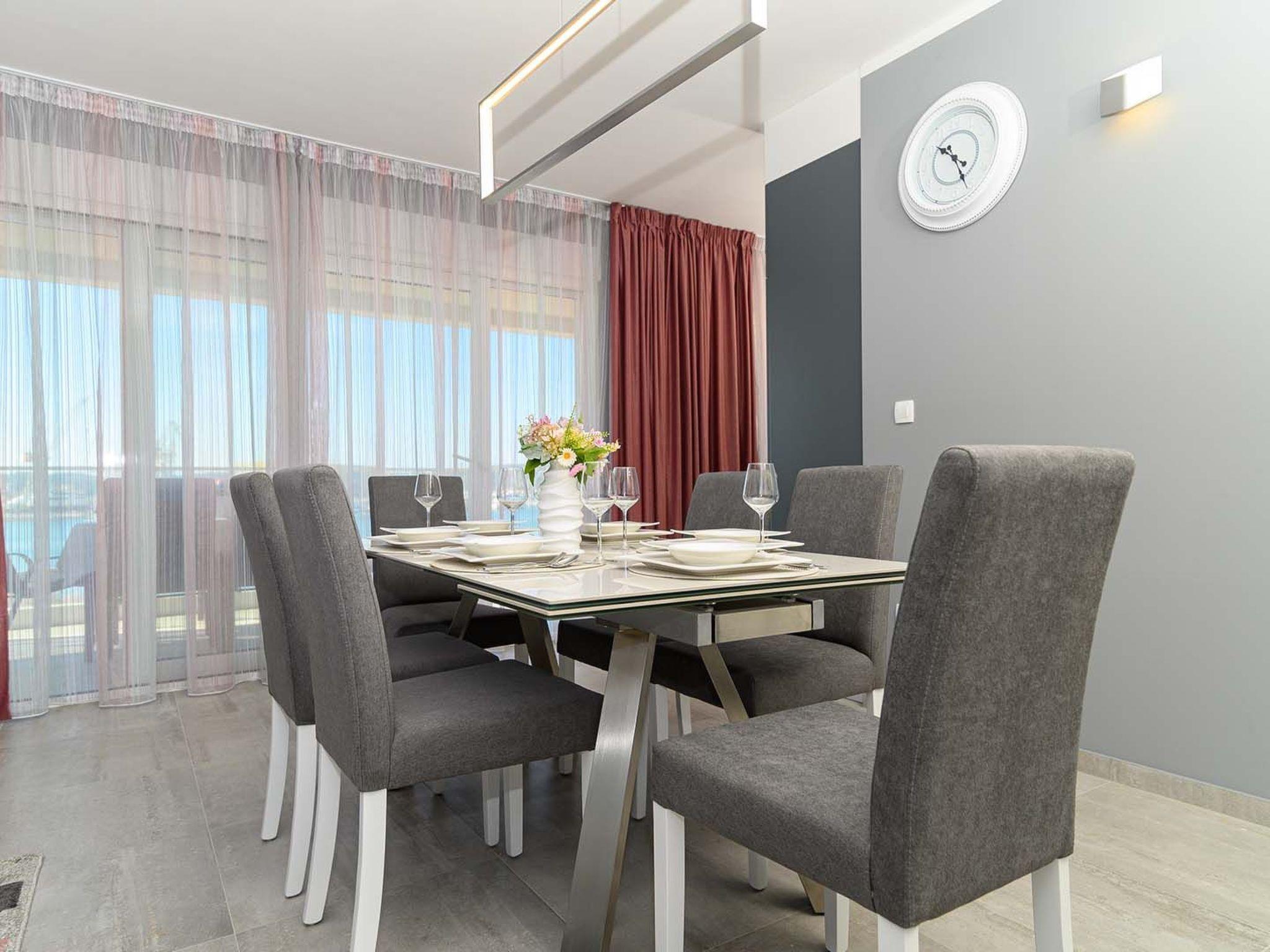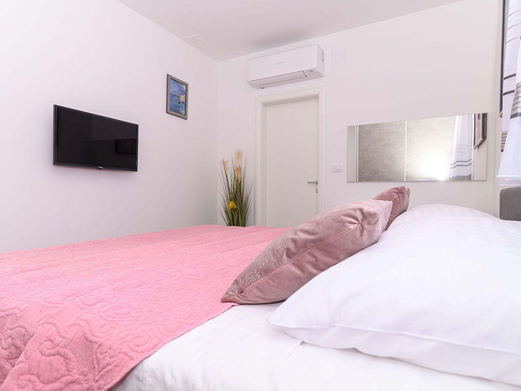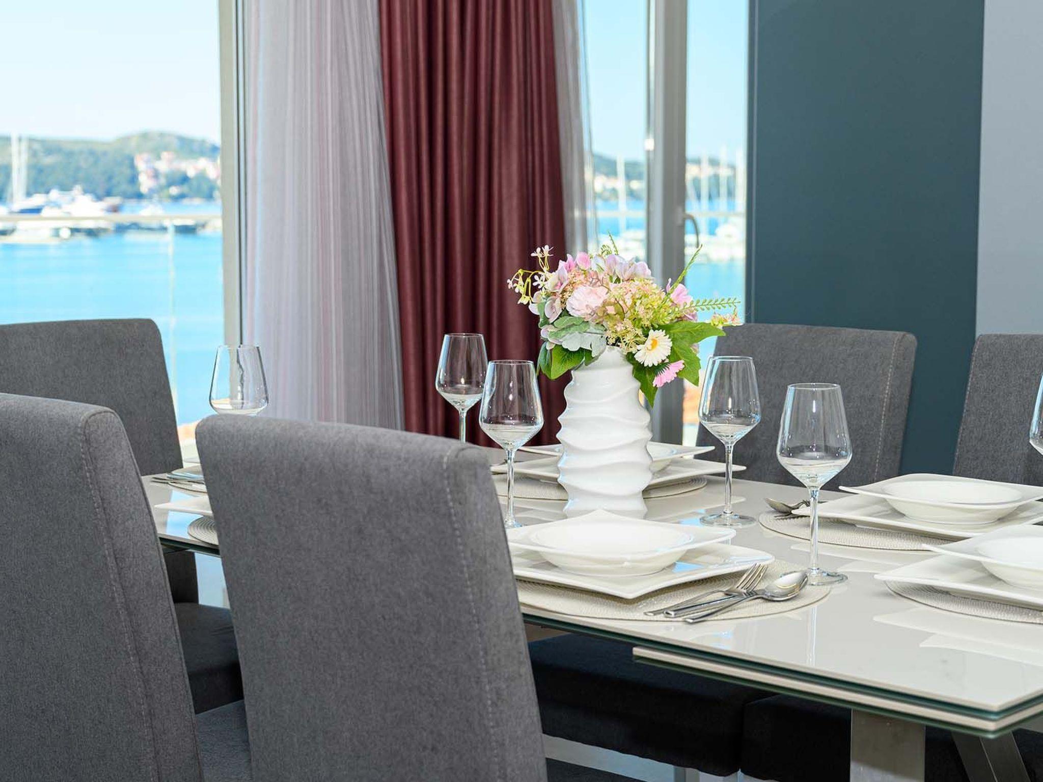 Diese stilvolle und luftige Wohnung befindet sich im dritten Stock eines Mehrfamilienhauses und ist über eine Treppe oder einen Aufzug erreichbar. Die Wohnung besteht aus zwei elegant eingerichteten Schlafzimmern mit Klimaanlage, SAT-TV und Doppelbetten (ein Bett kann in zwei Einzelbetten getrennt werden), zwei Badezimmern mit Dusche, einer voll ausgestatteten Küche, einem Wohnzimmer mit Essbereich und einem überdachten Balkon mit Meerblick, der durch eine große Glasschiebetür zugänglich ist. Der atemberaubende Blick vom Balkon über die nahegelegene Insel Ciovo und den Yachthafen verleiht diesem Apartment einen besonderen Charme und das Gefühl, eine wahre Oase der Ruhe und Entspannung zu sein.Apartment Style ist voll klimatisiert und ausgestattet mit SAT-TV, Wi-Fi-Internet, Bügeleisen und Bügelbrett, Babybett, Hochstuhl, Safe, Moskitonetze, Elektroherd, Backofen, Dunstabzugshaube, Kühlschrank mit Gefrierfach, Geschirrspüler, Mikrowelle, Wasserkocher, Kaffeemaschine (Filter), Toaster, Grillausrüstung, Grill im Freien, Waschmaschine, Trockner und Haartrockner. Das Anwesen bietet Parkplätze, 1 im Freien und 1 in der Garage, kostenlos.