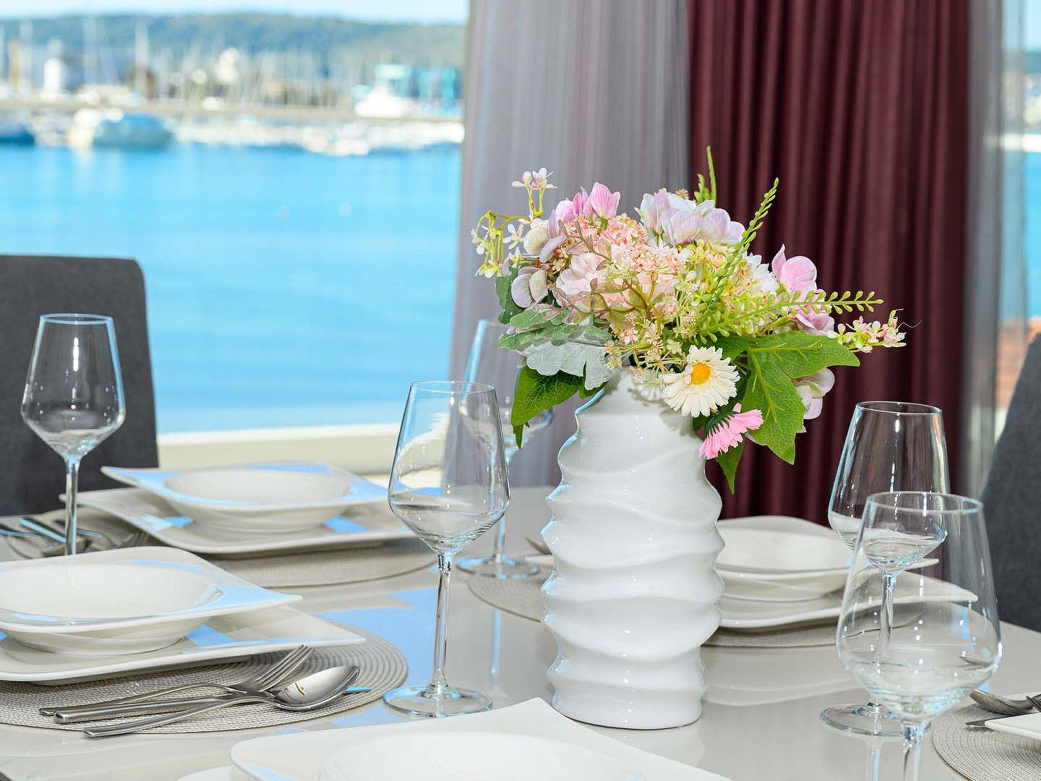 Ein Esstisch mit Stühlen im Freien bietet den Gästen die Möglichkeit, mit ihren Lieben zu frühstücken oder zu Abend zu essen und dabei die Aussicht und die Düfte der Adria zu genießen.