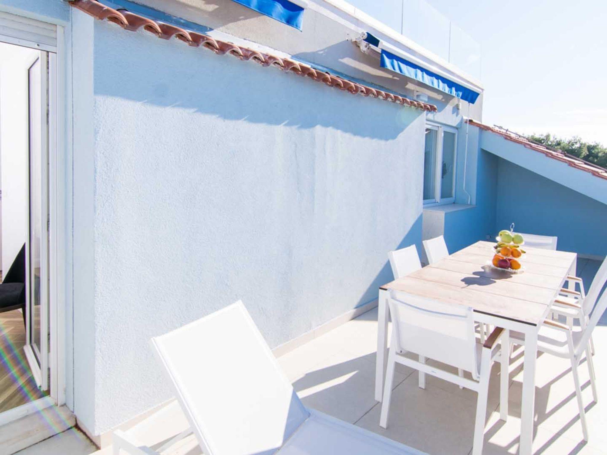 -Gartenmöbel auf dem überdachten Balkon mit Meerblick