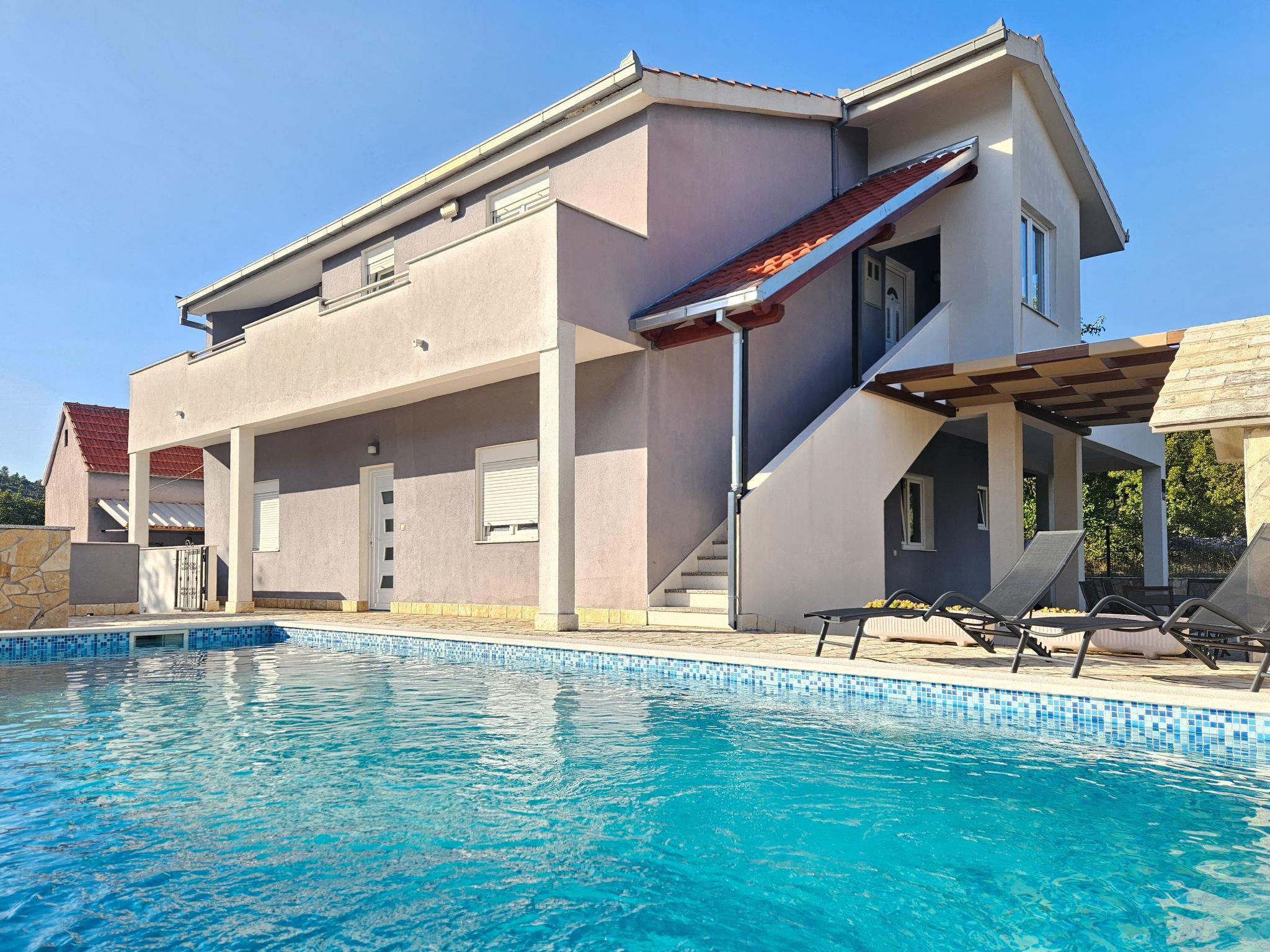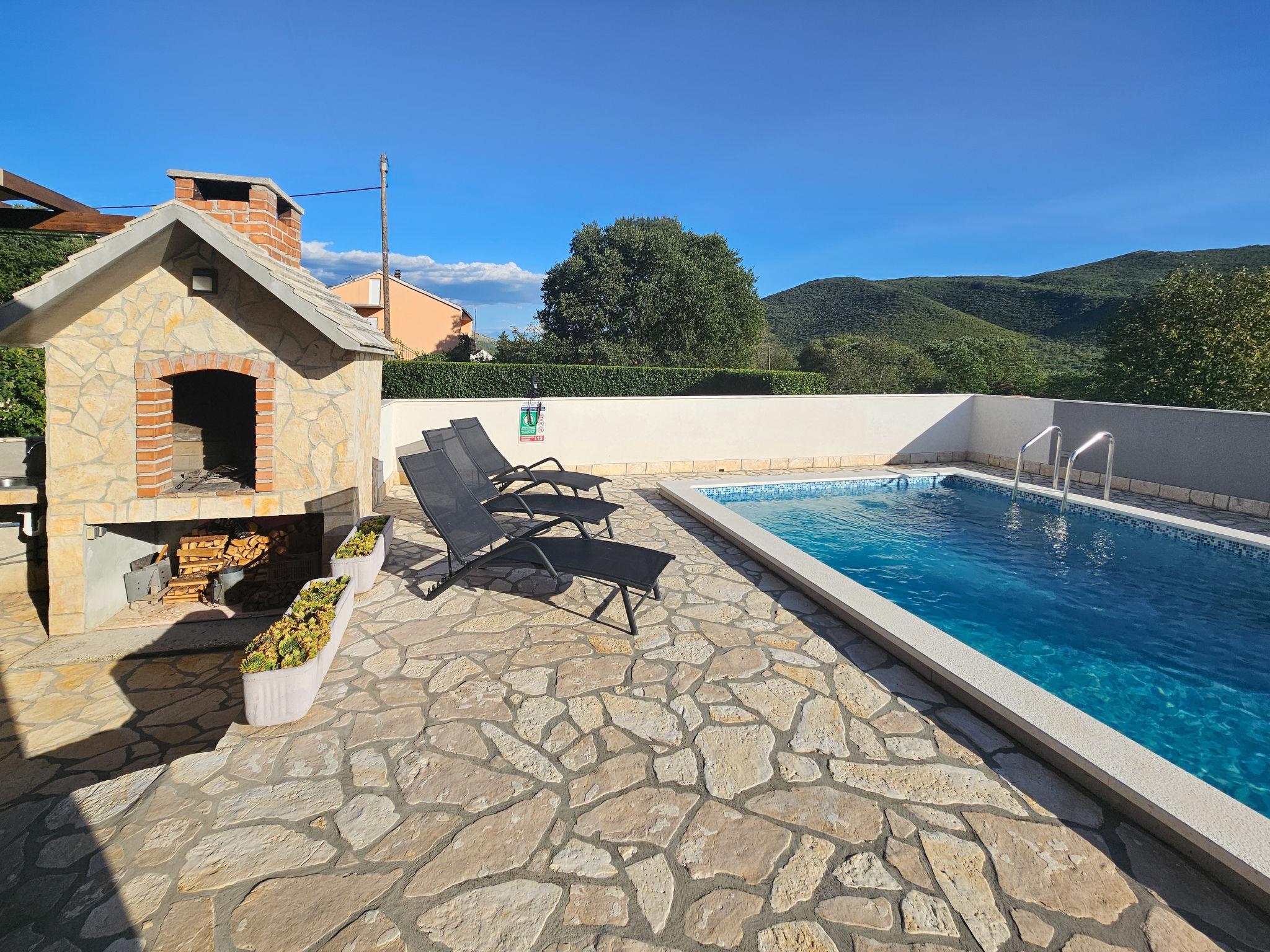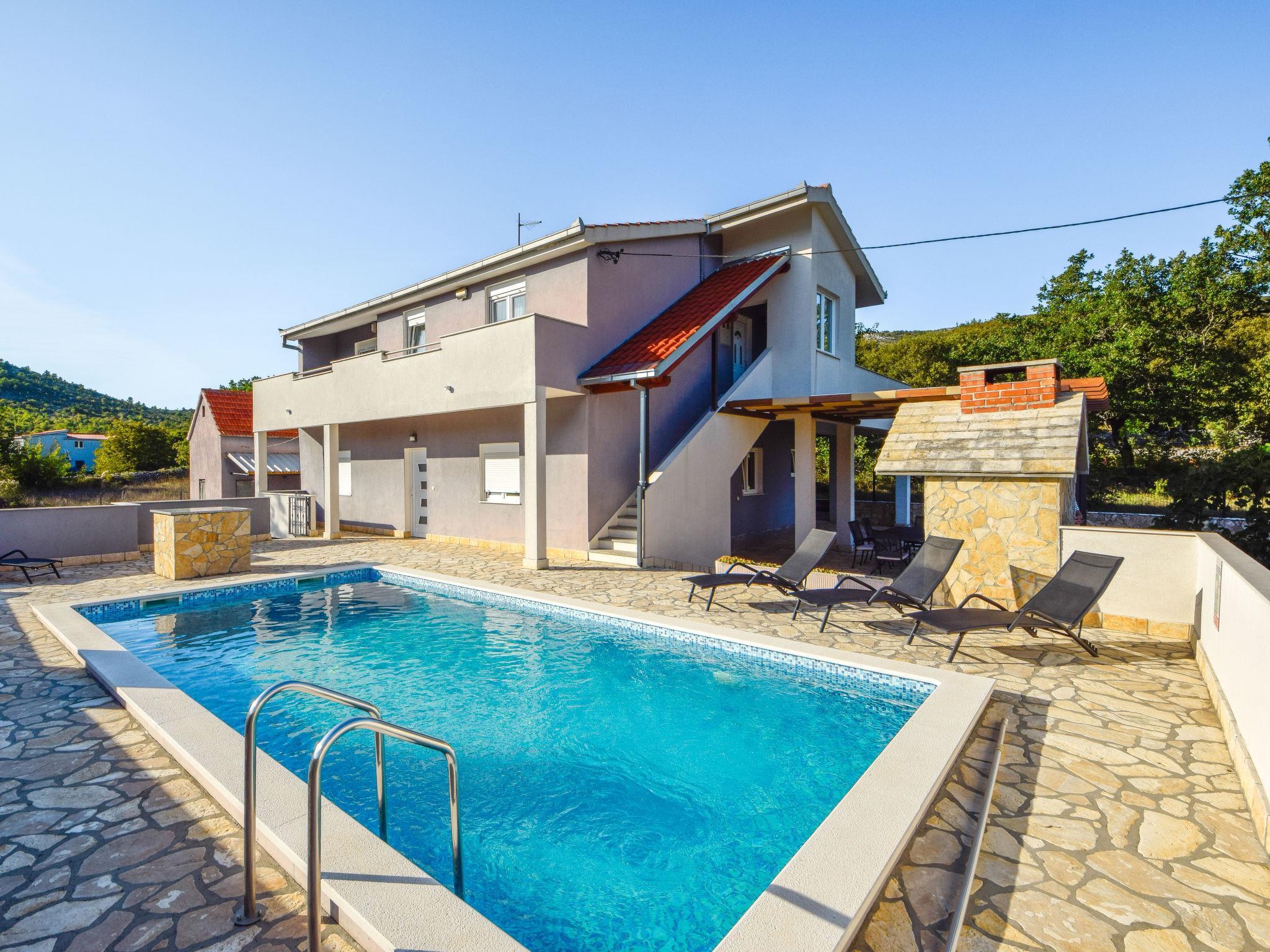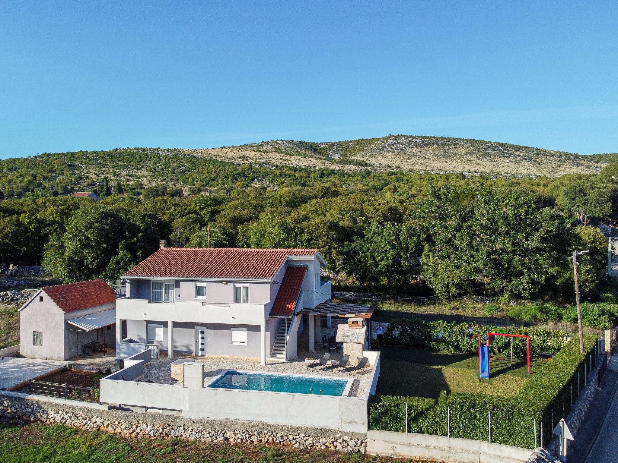 Primorski Dolac: Haus "Marija". 24 km vom Zentrum von Trogir, ruhige, sonnige Lage, 23 km vom Meer. Zur Alleinbenutzung: Grundstück 870 m2 (eingezäunt), Schwimmbad eckig (8 x 4 m, 150 cm tief, saisonale Verfügbarkeit: 01.Jun. - 01.Okt.). Aussendusche, Grill, Kinderspielplatz (Rutschbahn, Schaukel), Poolpflege durch den Besitzer/Gärtner. Im Hause: Internetzugang, Waschmaschine. Parkplatz (für 2 Autos, überdacht) beim Haus auf dem Grundstück. Einkaufsgeschäft 60 m, Einkaufszentrum 20 km, Restaurant 11 km, Bushaltestelle 50 m, Bahnstation 950 m, Kieselstrand 23 km. Der Besitzer akzeptiert keine Jugendgruppen. Bitte beachten: Ein Teil des Hauses ist geschlossen und nicht bewohnt. Flugplatz 23 km vom Haus. Die Nachbarschaft ist sehr lärmempfindlich. Ruhe und gutes Benehmen wird erwartet.