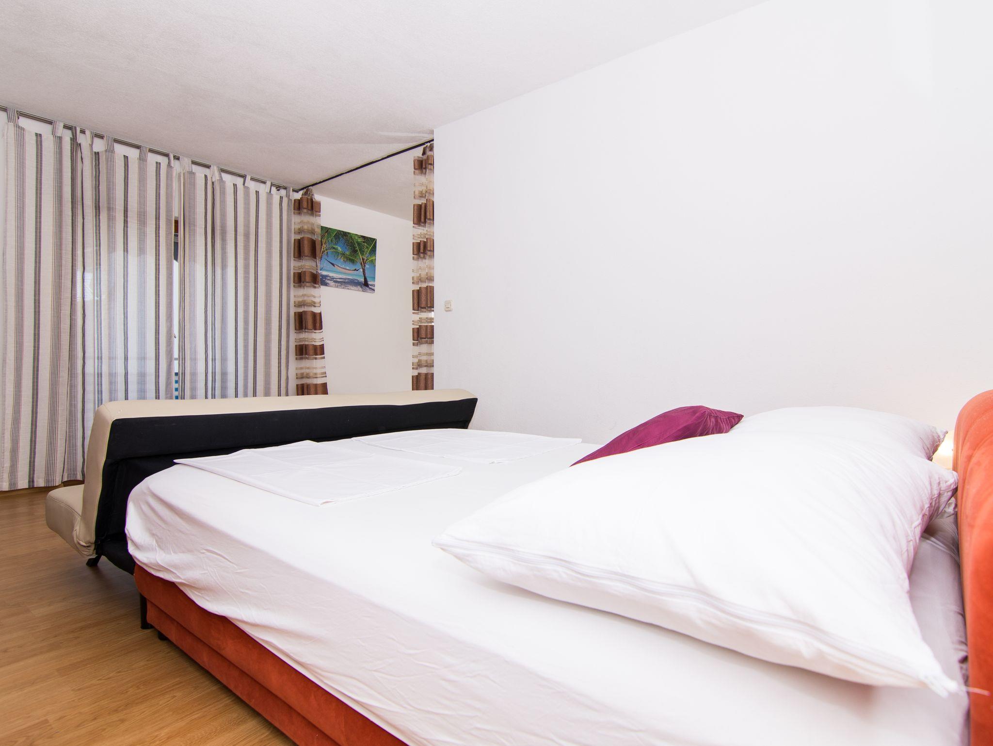 Studio bietet Platz für 3 Gäste. Die Betten sind in Schlafzimmern, die es 1 gibt, innerhalb einer Gesamtfläche von 24m2, angeordnet. Die Gäste haben einen eigenen Balkon zur Verfügung, auf der sie in warmen Sommernächten genießen können. Das Studio-Apartment bietet Meerblick. Es ist erlaubt, Speisen auf dem Gemeinschafts-Grill vorzubereiten. IM PREIS INBEGRIFFEN: Kurtaxe, Endreinigung, Klimatisierung, Parkplatz, Internet, Wäschewaschen, Bügeleisen, Bügelbrett, Föhn. Die Verfügbarkeit zusätzlicher Dienstleistungen in Ihrem reservierten Termin und die Preise derselben (falls nicht aufgeführt) müssen im Voraus überprüft werden. Zusätzliche Dienstleistungen die in der Zahlungsaufforderung nicht aufgeführt sind werden direkt beim Vermieter bezahlt, angenommen der Gast nutzt auch diese. Ermäßigung auf den Grundpreis: Gratistag 14=13 (bei einem Aufenthalt von 14 Tagen oder mehr erhalten Sie einen Gratistag für den Aufenthalt bis 31.12.26).