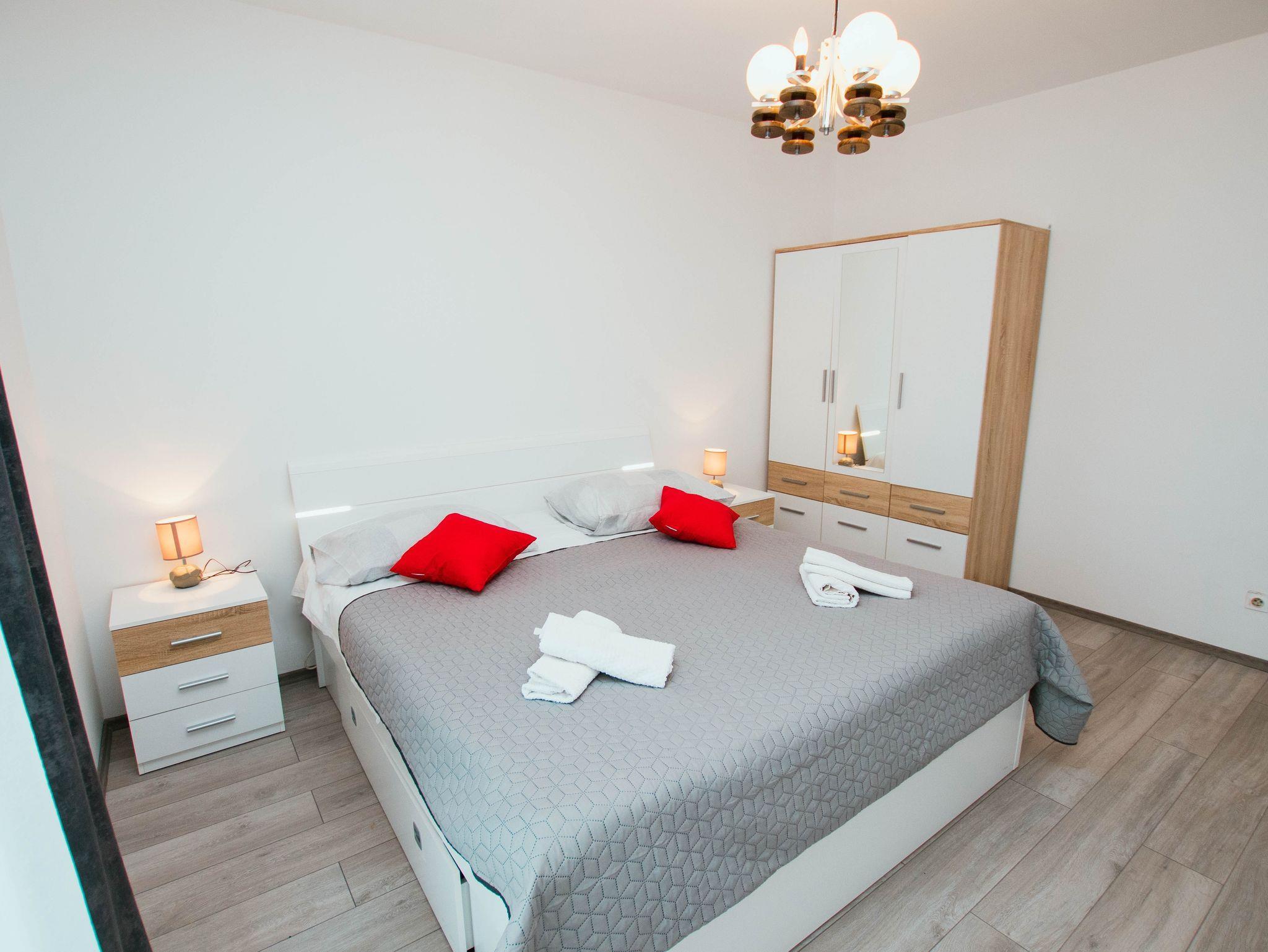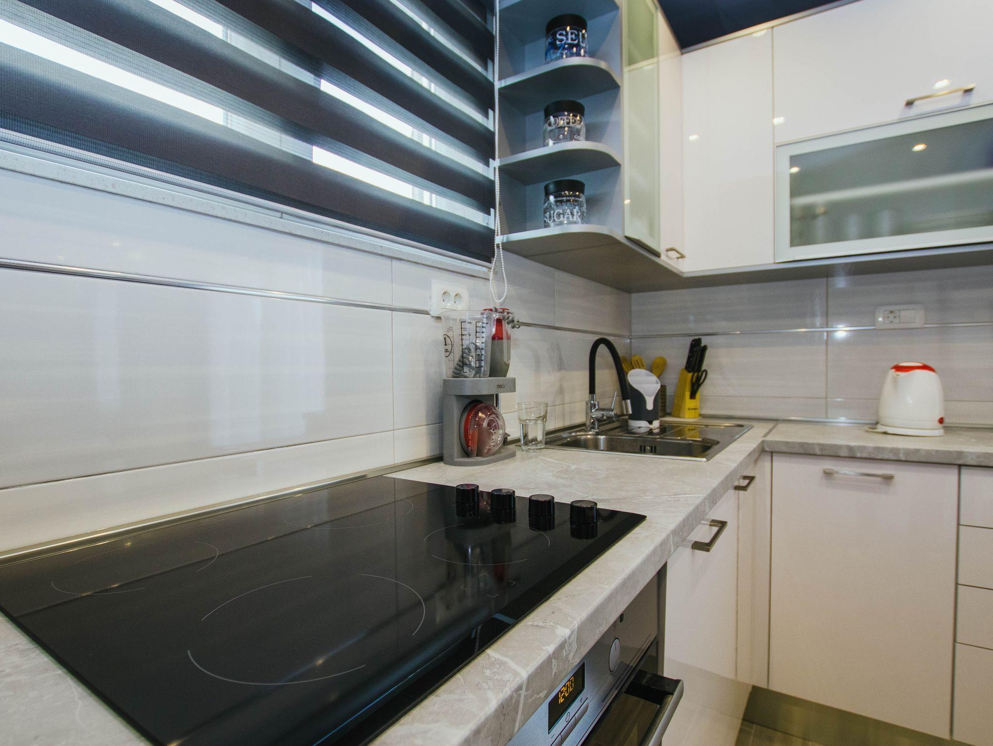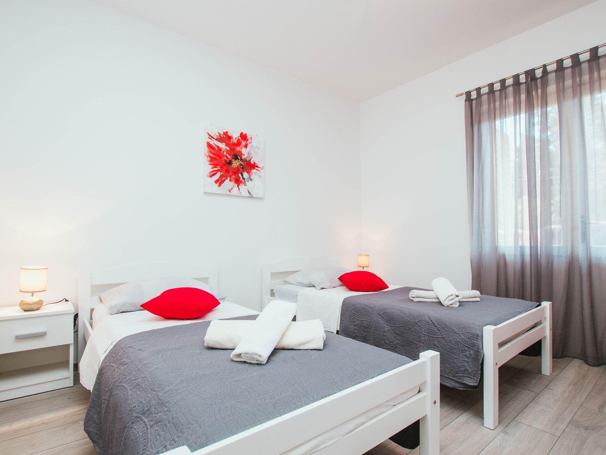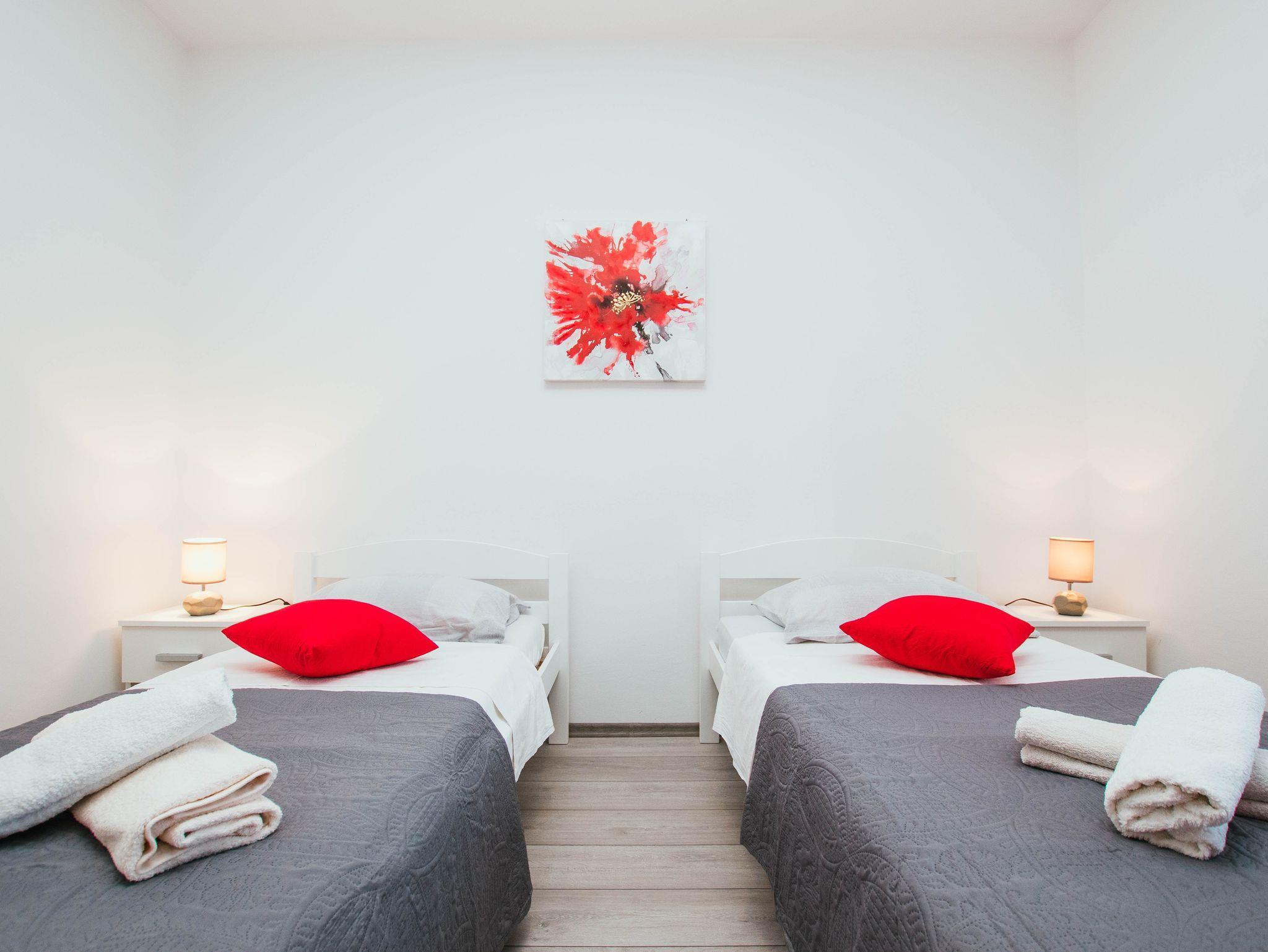 Ferienwohnung bietet Platz für 4 Gäste. Die Betten sind in Schlafzimmern, die es 2 gibt, innerhalb einer Gesamtfläche von 78m2, angeordnet. Die Gäste haben eine eigene Terrasse zur Verfügung, auf der sie in warmen Sommernächten genießen können. Das Apartment bietet Meerblick. Es ist erlaubt, Speisen auf dem Gemeinschafts-Grill vorzubereiten. IM PREIS INBEGRIFFEN: Kurtaxe, Endreinigung, Klimatisierung, Parkplatz, Garage, Internet, Bügeleisen, Bügelbrett. VERBINDLICHE ZUSÄTZLICHE KOSTEN: Aufzahlung für Kurzaufenthalte (prozentualer Zuschlag pro Nächtigungsanzahl: 30% - 1, 20% - 2, 10% - 3). Die Verfügbarkeit zusätzlicher Dienstleistungen in Ihrem reservierten Termin und die Preise derselben (falls nicht aufgeführt) müssen im Voraus überprüft werden. Zusätzliche Dienstleistungen die in der Zahlungsaufforderung nicht aufgeführt sind werden direkt beim Vermieter bezahlt, angenommen der Gast nutzt auch diese.