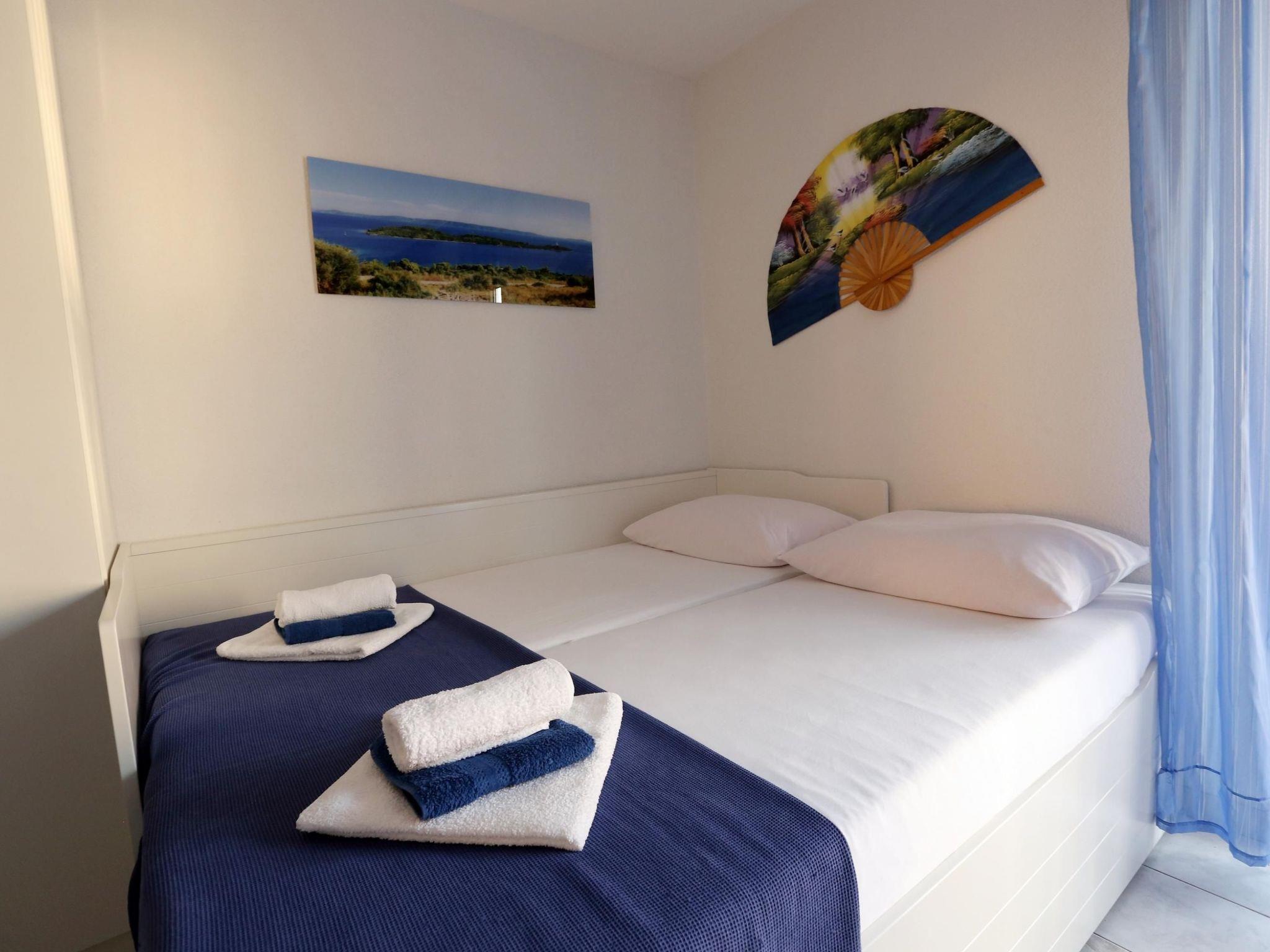 Angeboten wird eine Ferienwohnung mit Balkon, Schlafzimmer mit Doppelbett, Küche, Wohnbereich mit Tagesbett (140 x 200) und Bad mit Dusche. Das Appartement ist voll ausgestattet. Balkon bietet Sitzgelegenheit mit Sicht auf das Meer und die Nachbarsinsel Solta.