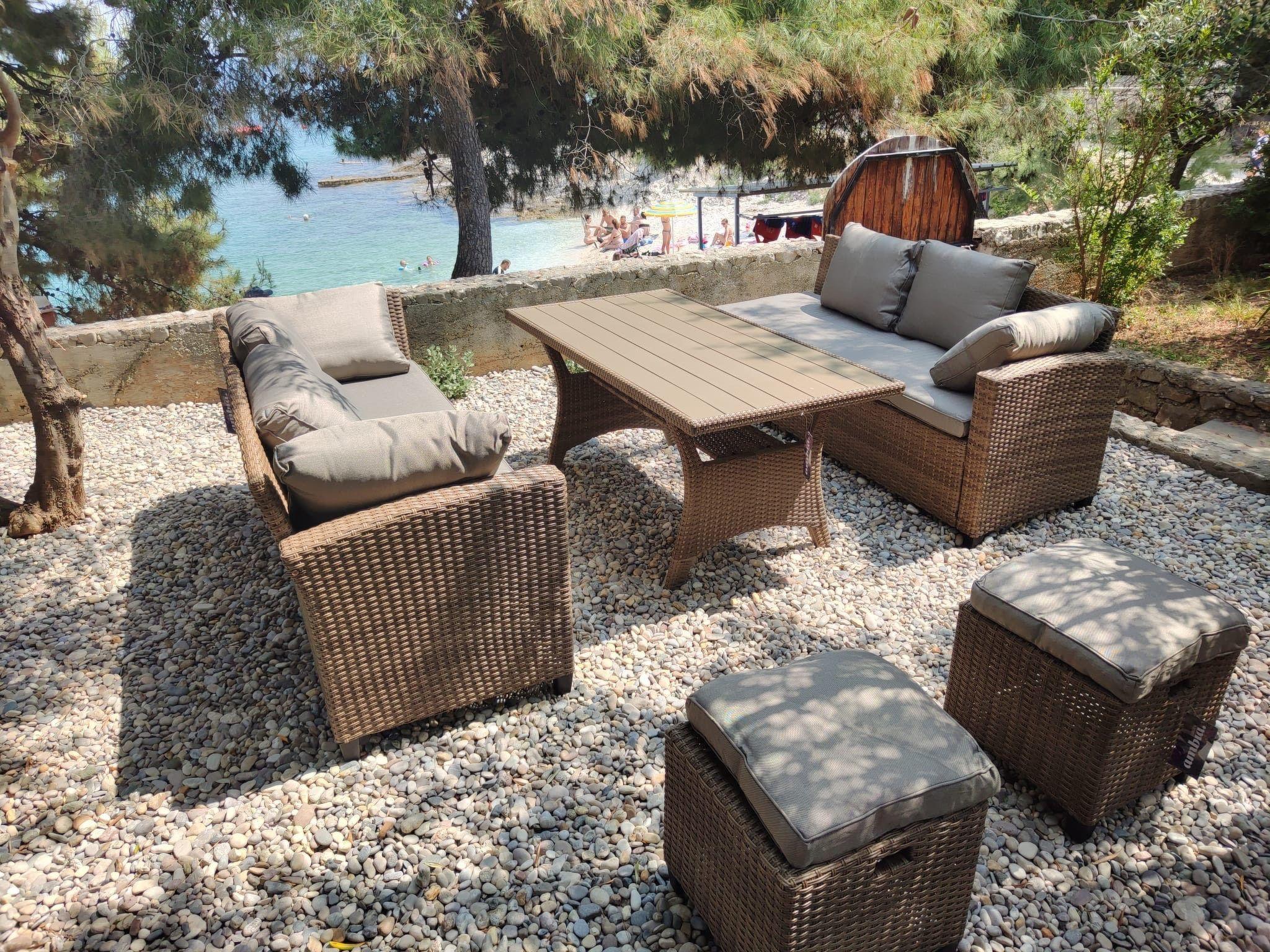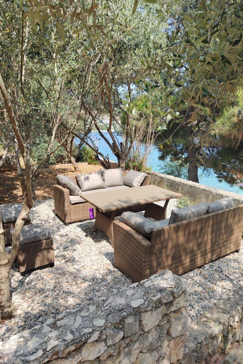 Das Wohnzimmer führt hinaus auf eine große Terrasse (30 m²) mit einer schönen Aussicht auf das Meer und den Garten. Ausgestattet ist die Terrasse mit Gartenmöbeln, Sonnenschirm und zwei Teak-Liegen. Genießen Sie die freie Aussicht und die Sonne. Das Haus verfügt über einen Garten mit mediterranen Kräutern sowie einen Außengrillplatz. Auf dem Grundstück ist auch ein Parkplatz für drei bis vier Autos vorhanden.