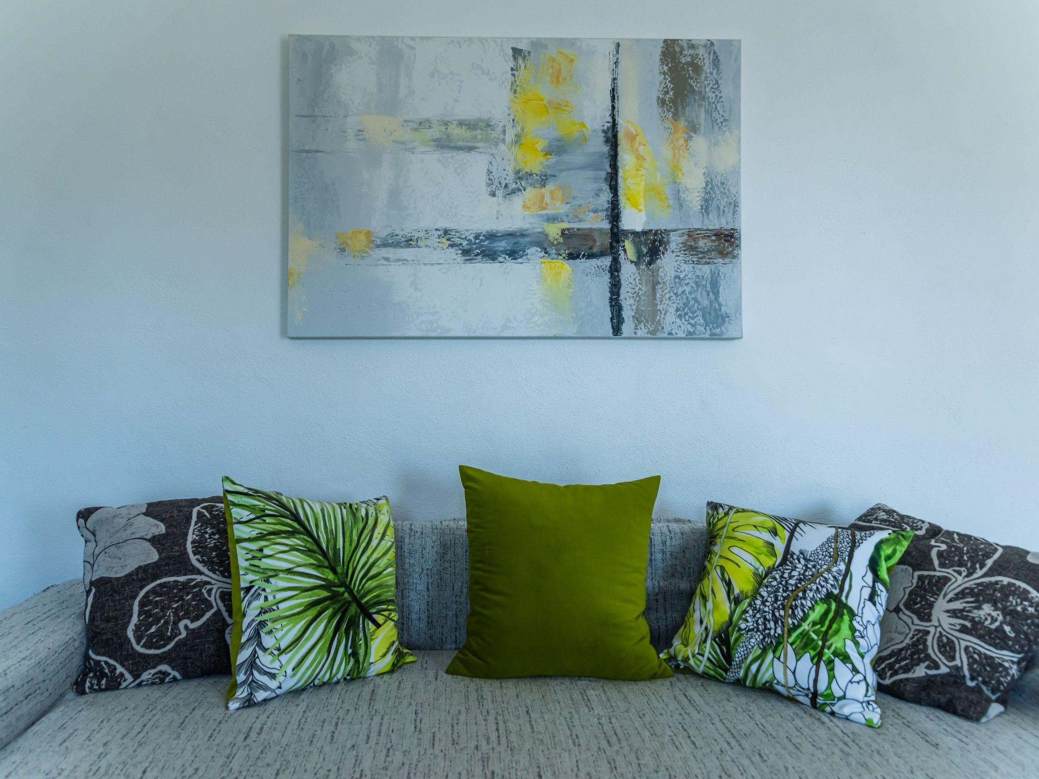 Ihr Ferienhaus hat eine Wohnfläche von 140 m² und ist für bis zu neun Personen ausgelegt. Das 30 m² große, klimatisierte Wohn-/Esszimmer im Erdgeschoss ist mit einem Dreisitzersofa (Schlaffunktion), zwei ausziehbaren Sesseln, einem Fernseher (Sat.-TV) und einem Essplatz eingerichtet. Des Weiteren gibt es im Erdgeschoss ein großes Badezimmer mit Dusche, WC und Waschmaschine sowie eine voll ausgestattete Küche. Die vier 15 m² großen Schlafzimmer befinden sich im oberen Stock. Drei Schlafzimmer liegen nach Süden und bieten einen herrlichen Blick auf das Meer und auf die große Terrasse. Die Zimmer sind alle identisch mit einem Doppelbett (160 x 200 cm) und einer Klimaanlage eingerichtet. Das vierte Schlafzimmer mit zwei 90 cm breiten Einzelbetten und Blick auf den Parkplatz dient als Kinderzimmer und hat Zugang zu einem eigenen Balkon (4 m²). Auf der oberen Etage gibt es ebenfalls ein großes Bad mit WC.