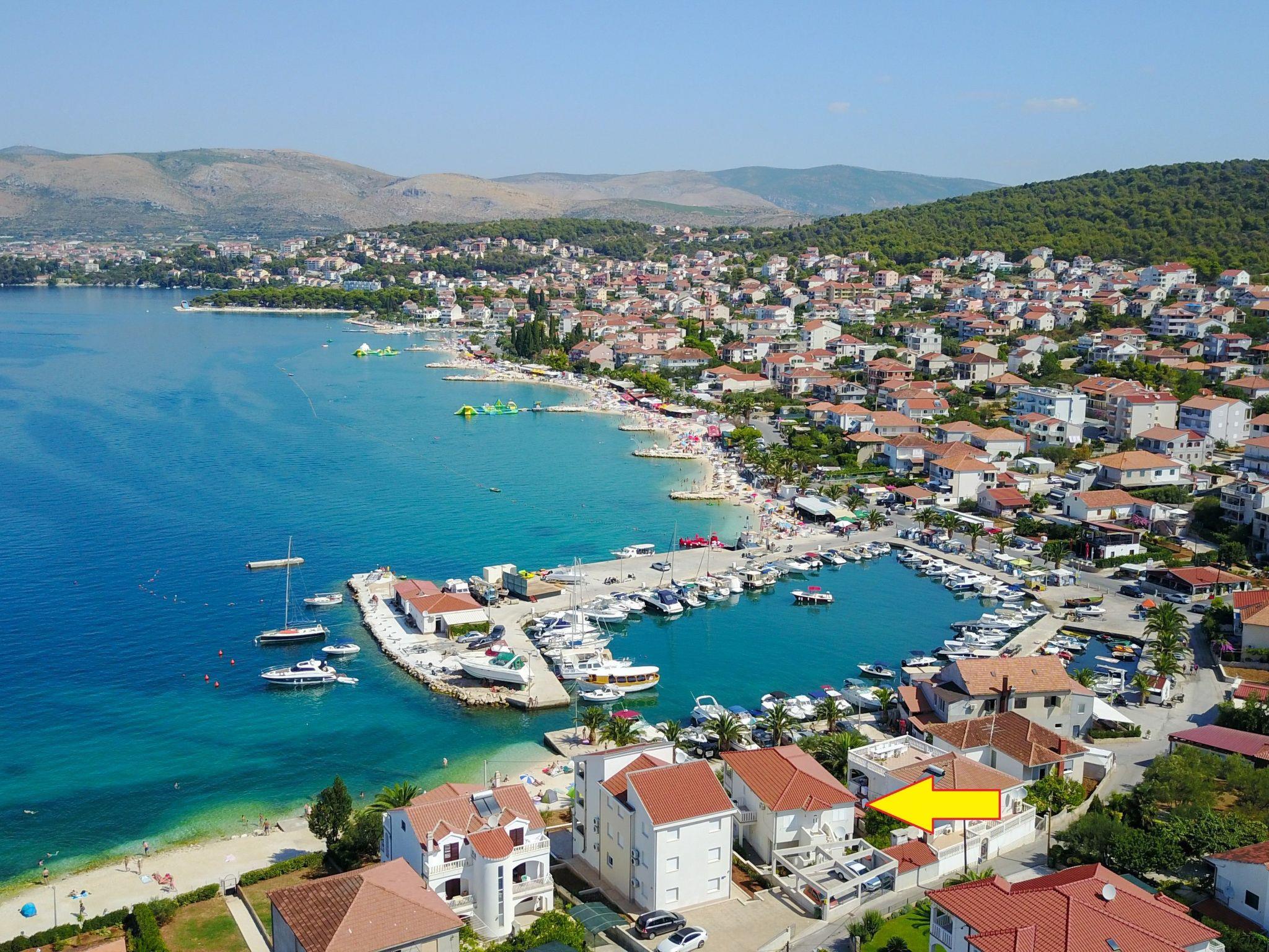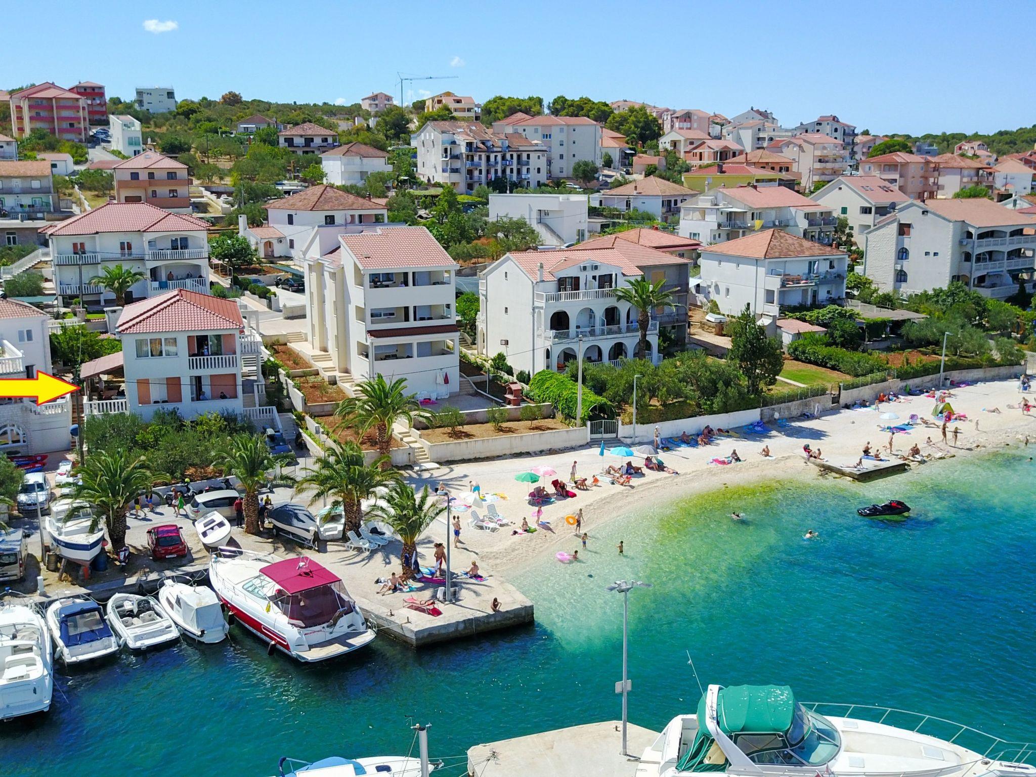 Die beneidenswerte Lage der Wohnung bedeutet, dass das schimmernde Meer nur 20 Meter entfernt ist und die Gäste zu einem gemütlichen Bad oder einem morgendlichen Spaziergang entlang des Kieselstrandes einlädt. Darüber hinaus ist das lebhafte Zentrum von Okrug Gornji nur 100 Meter entfernt, wo Sie lokale Geschäfte, Restaurants und wichtige Dienstleistungen finden können. Wenn Sie tiefer in die Geschichte der Region eintauchen möchten, ist die historische Stadt Trogir nur 6-7 Autominuten entfernt und bietet einen Einblick in die reiche kulturelle Vielfalt Kroatiens.