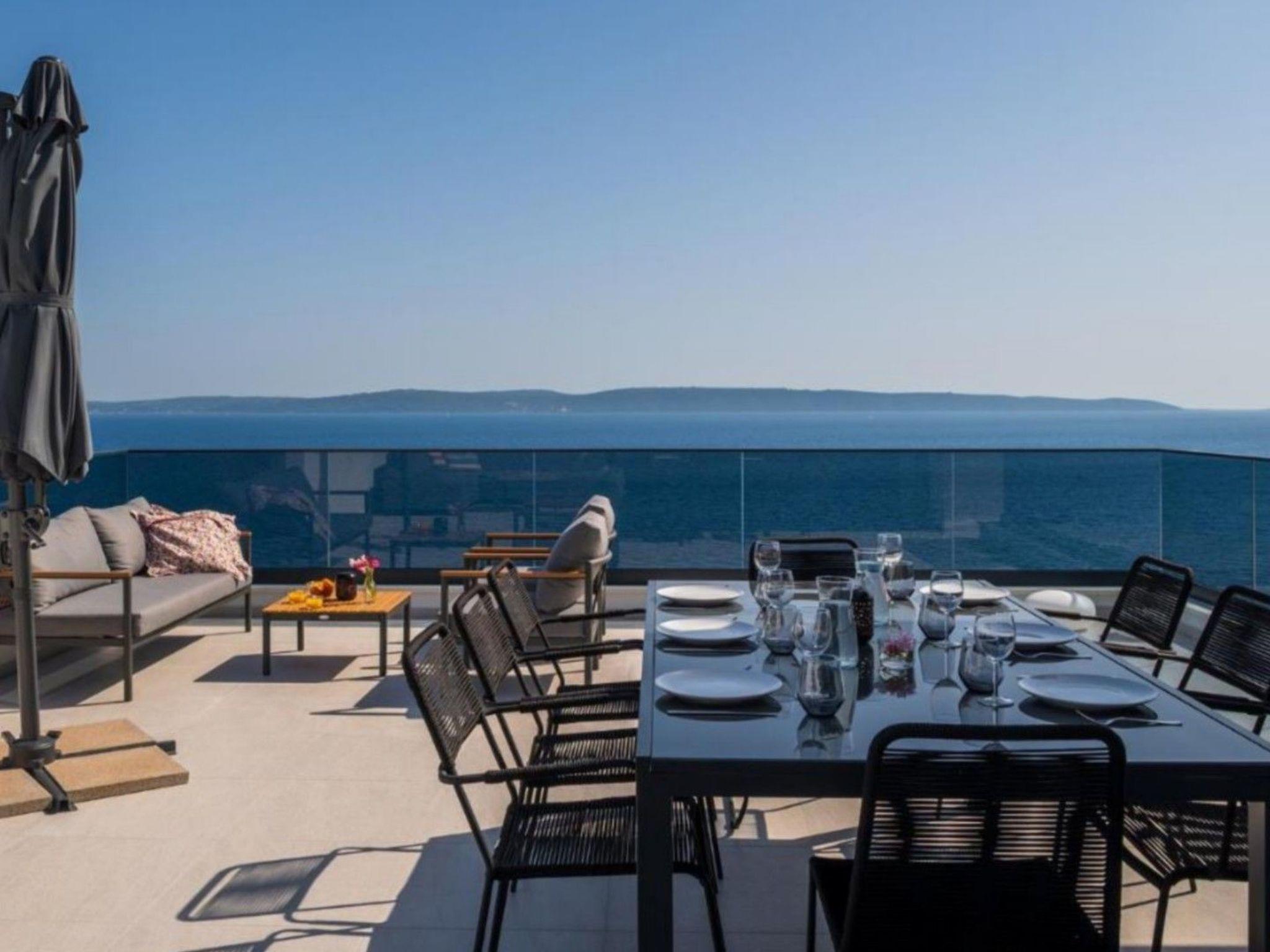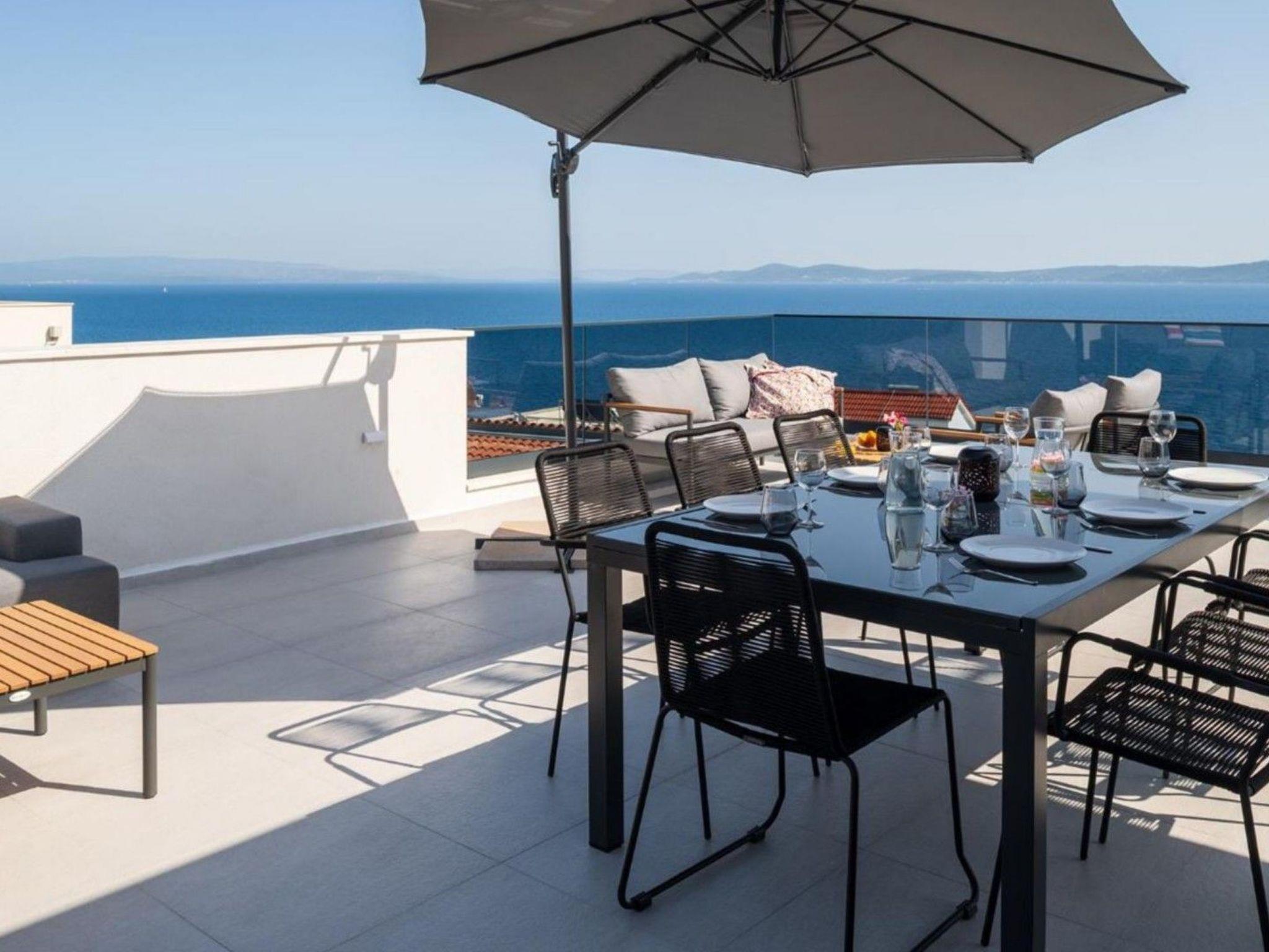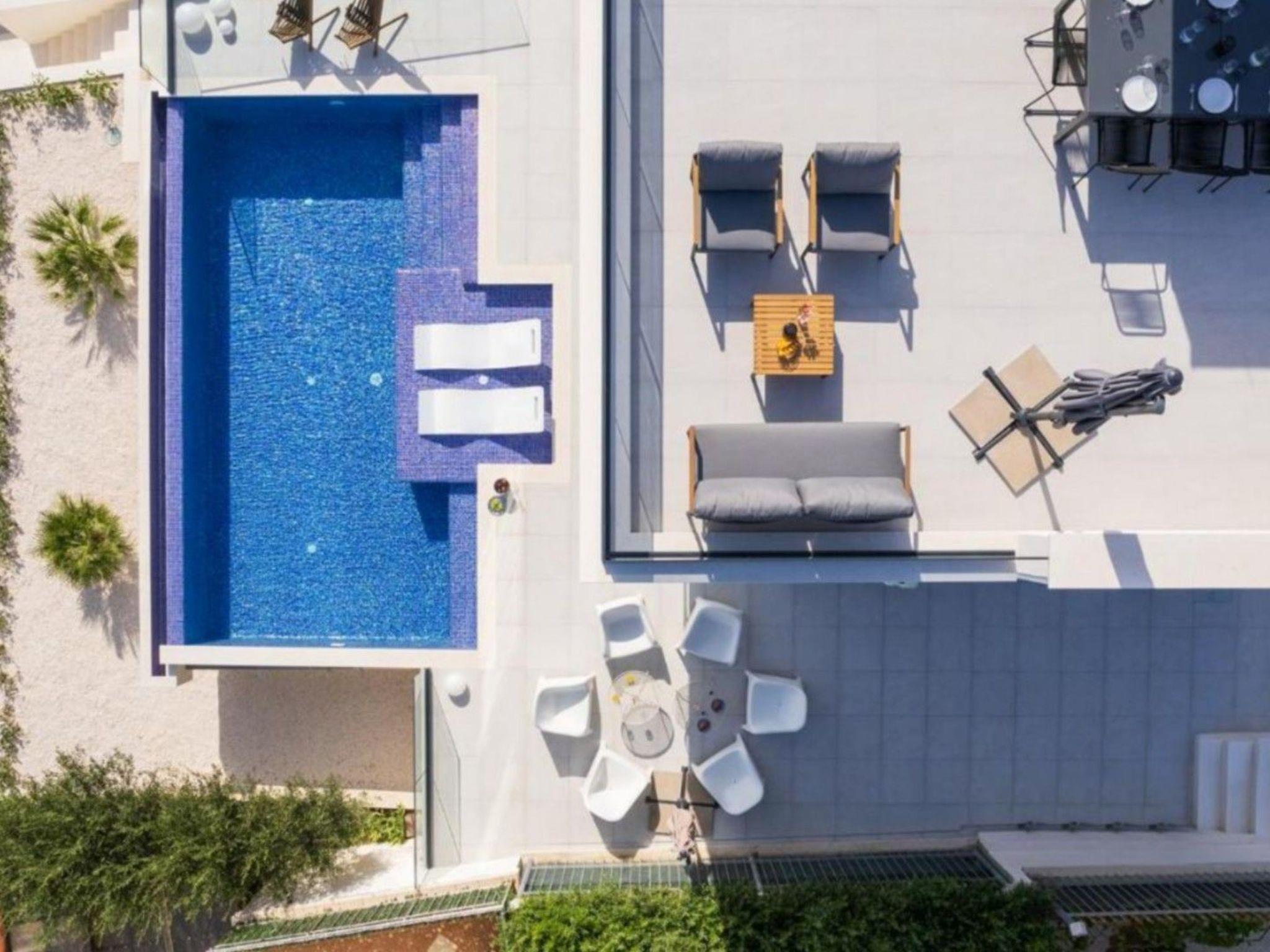 Über eine Treppe gelangt man auf die Dachterrasse, wo ein Esstisch und ein Grill für die Zubereitung von Mahlzeiten zur Verfügung stehen, während man den Blick aufs Meer genießt. Im Außenbereich befindet sich ein privater beheizter Pool (30 m²), der von Sonnenliegen umgeben ist und in dem man sich an heißen Sommertagen entspannen kann. Der Poolbereich ist außerdem mit einer Außendusche, einem Sonnenschirm, einem Tisch und Stühlen ausgestattet.