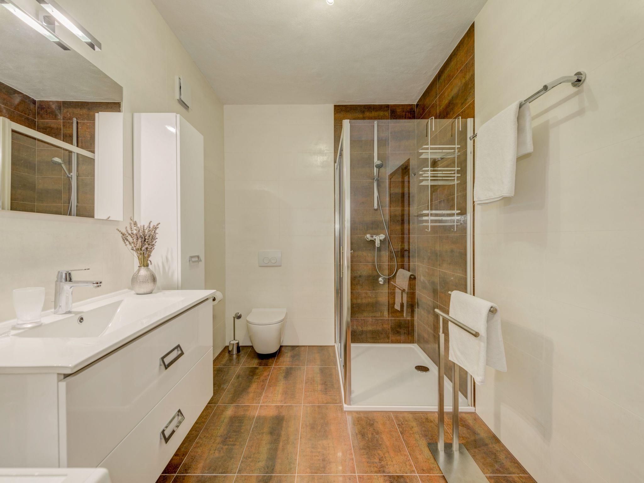Das komfortabel eingerichtete Apartment erstreckt sich über eine Wohnfläche von 90 m² und liegt im Erdgeschoss des zweistöckigen Hauses, unterhalb der Wohnung der deutschsprachigen Eigentümer. Der klimatisierte Innenraum unterteilt sich in eine sehr gut ausgestattete Küche mit Esszimmer, ein geselliges Wohnzimmer, sowie zwei separate Schlafzimmer und ein geräumiges Badezimmer. Im ersten Schlafzimmer schlafen Sie in einem komfortablen Doppelbett der Maße 160 cm x 200 cm, das von zwei Nachttischkommoden mit Leselampen umgeben ist. Ein großzügiger Kleiderschrank mit Schiebetüren sorgt für Verstauungsmöglichkeiten Ihrer Reisegarderobe. Im zweiten Schlafzimmer sind ein Doppelbett der Maße 160 cm x 200 cm sowie ein großer Kleiderschrank und ein Smart-Flachbild-Fernseher mit Sat.-TV vorhanden. Vor dem Einschlafen Sie können gemütlich im Bett liegend das Fernsehprogramm Ihrer Wahl genießen. Dieses zweite Schlafzimmer hat einen direkten Ausgang zur großen Terrasse. Nach einem Tagesausflug nehmen Sie im stilvollen und mit exklusivem Mobiliar ausgestattetem Wohnzimmer Platz. Für Unterhaltung sorgt auch ein Smart-Flachbildfernseher mit Sat.-TV. Die vollständig ausgestattete Küche ermöglicht eine umfangreiche Selbstversorgung inklusive Geschirrspülmaschine, einer Kühl- und Gefrierschrankkombination, Vierzonen-Herd mit Backofen und vielem mehr. Der beistehende Esstisch mit sechs Stühlen bietet ausreichend Platz für ausgedehnte Mahlzeiten. Aus der Küche und dem Wohnzimmer gelangen Sie zudem kurzerhand ins Freie. Das neu gestaltete Badezimmer sorgt mit hellen Fliesen und einem modernen Fußbodenbelag für ein angenehmes Ambiente. Neben einer ebenerdigen Dusche, einem WC, einem großen Handwaschbecken ist hier eine Waschmaschine selbstverständlich. Ablage- und Verstaumöglichkeiten runden das Angebot ab.