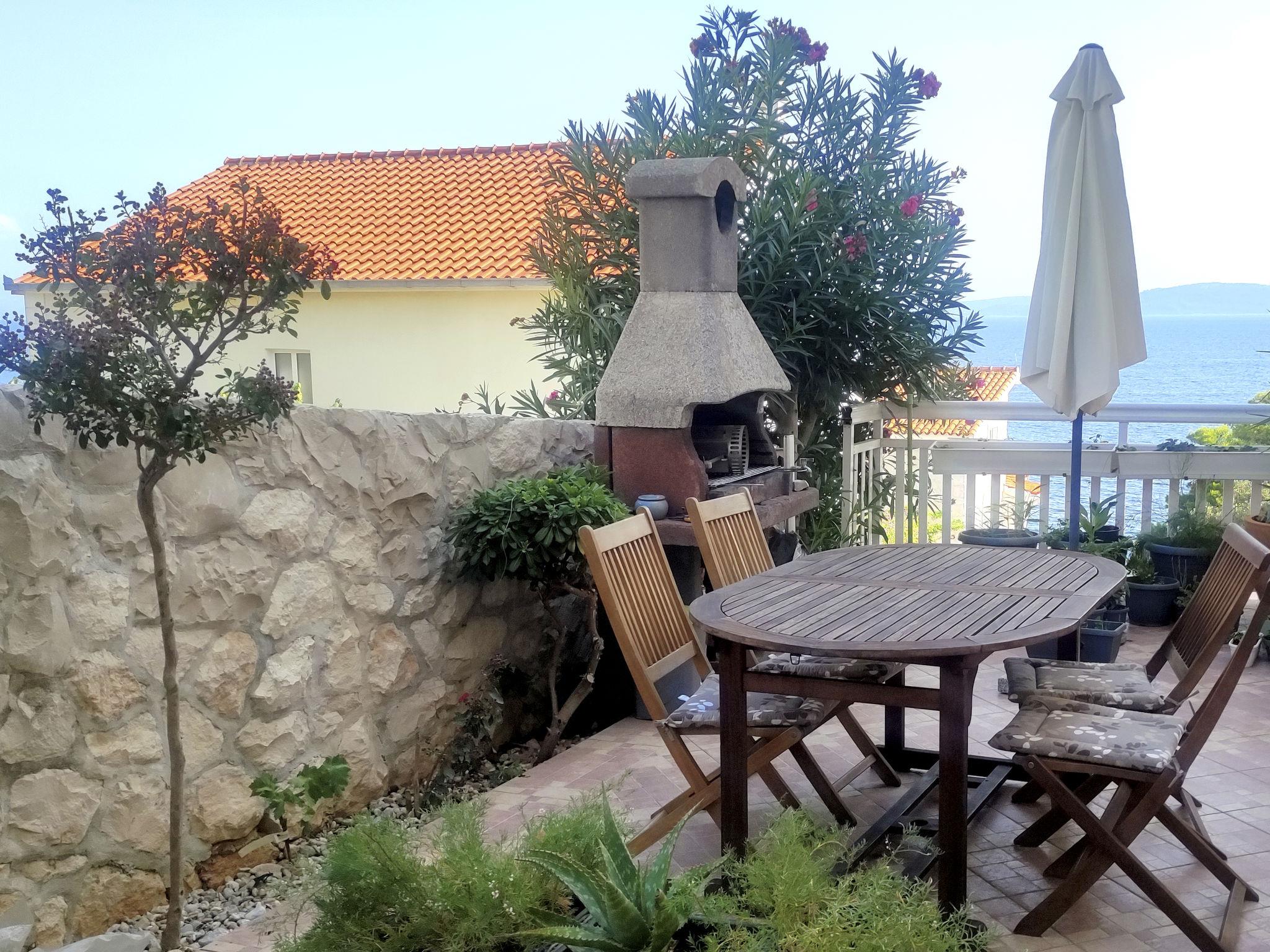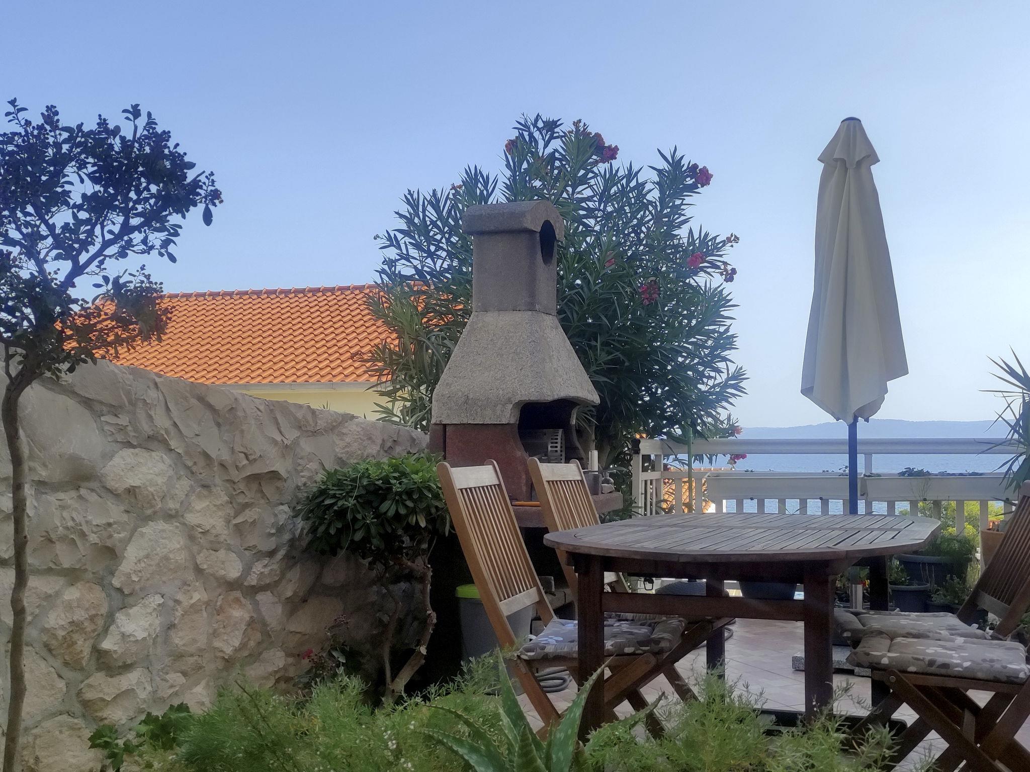 Außerdem gibt es einen Grillplatz neben dem Haupteingang des Hauses, der von unseren Gästen und Gastgebern frei genutzt werden kann. Er hat einen großen Esstisch und einen Betongrill. Er hat auch einen schönen Blick auf das Meer, viele Pflanzen, Sichtschutz von der Straße und angenehmen natürlichen Schatten am Nachmittag.