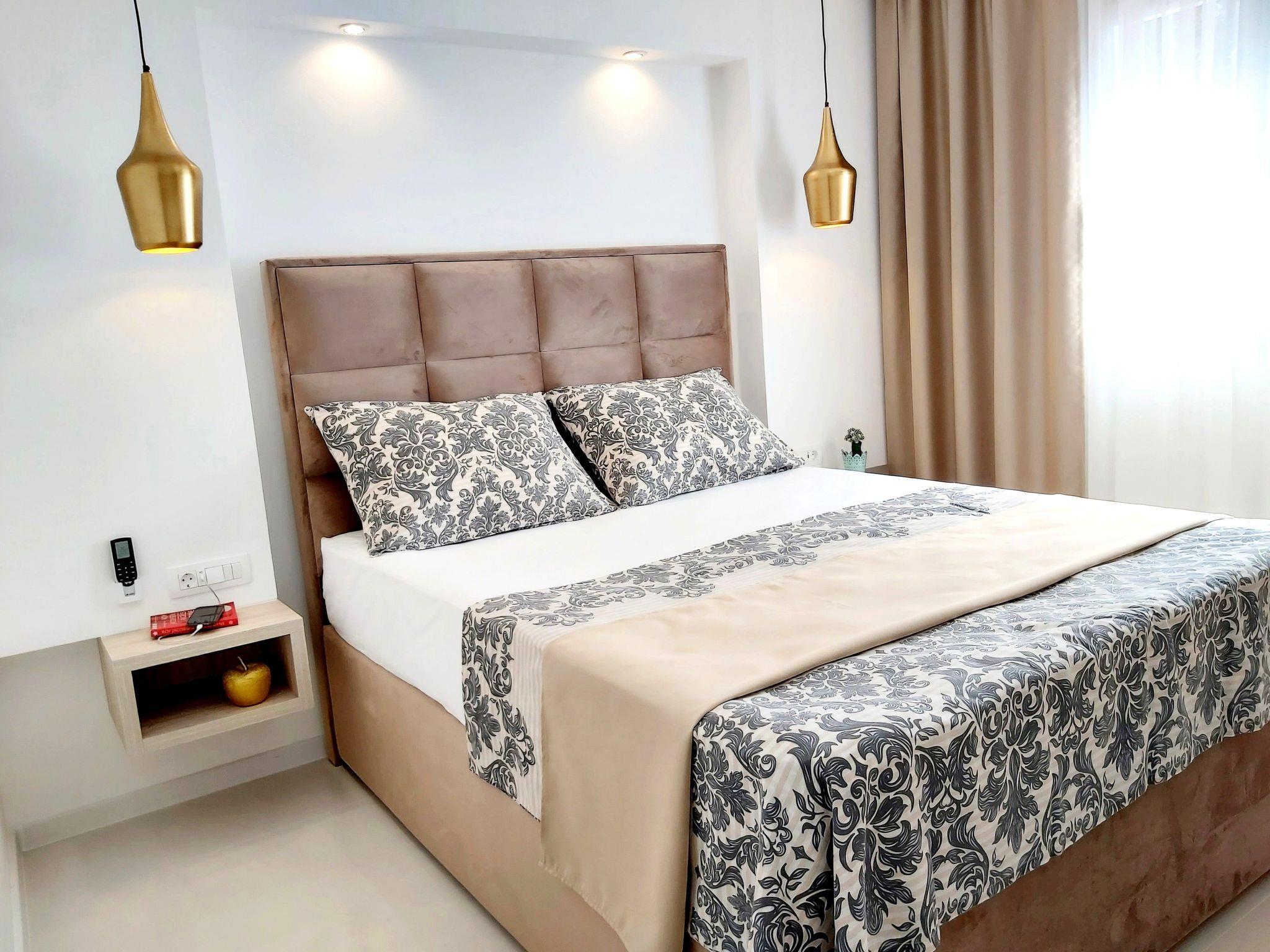 Diese 55 m² große, neu eingerichtete Ferienwohnung befindet sich im ersten Stock des Gebäudes und verfügt über einen Wohn-/Essbereich mit integrierter, voll ausgestatteter Küche, zwei Schlafzimmer und ein Badezimmer. Das klimatisierte Wohnzimmer ist mit einem Sofa und einem Satellitenfernseher ausgestattet. Der Essbereich bietet einen großen Holztisch mit passenden Stühlen. Neben dem Essbereich befindet sich die Küche, die mit Herd, Backofen, Kühlschrank, Gefrierfach, Geschirrspüler, Mikrowelle und Wasserkocher ausgestattet ist. Eines der beiden Schlafzimmer ist mit einem 160 cm x 200 cm großen Doppelbett ausgestattet, das andere Schlafzimmer hat zwei 90 cm x 190 cm große Einzelbetten, die zu einem Doppelbett zusammengeschoben werden können. Das Badezimmer ist mit einer Dusche, einem Waschbecken und einer Toilette ausgestattet. Ein zuverlässiger 5G-WLAN-Zugang wird kostenlos angeboten. Privater schattiger Parkplatz, Schwimmbad vom 20.04. bis 15.10. geöffnet.