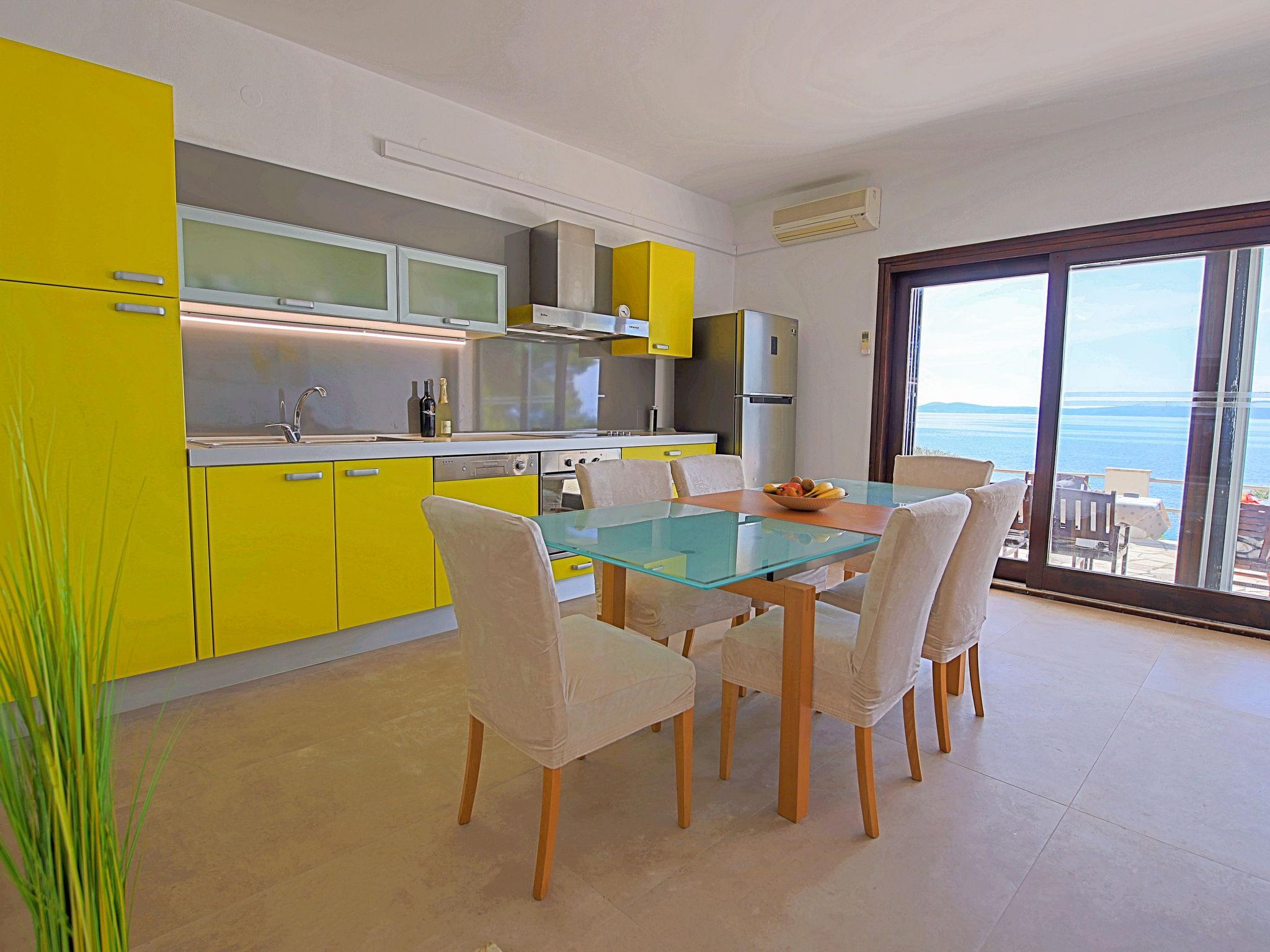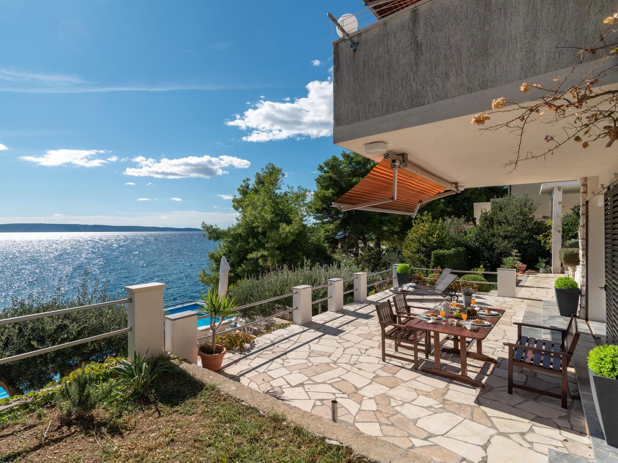 Okrug Gornji (Ciovo), 6 km von Trogir: Schönes, gemütliches Mehrfamilienhaus "Villa Pinia". Ausserhalb des Ortes, 1.5 km vom Zentrum von Okrug Gornji, ruhige, sonnige, erhöhte Lage, 20 m vom Meer, 20 m vom Strand, im Grünen. Zur Mitbenutzung: Garten mit Pflanzen, Schwimmbad eckig (11 x 4 m, 120 - 140 cm tief, saisonale Verfügbarkeit: 25.Apr. - 12.Sep.) mit Meerwasser und Innentreppe. Aussendusche, Sitzplatz, Grill. Im Hause: Internetzugang, Waschmaschine. Steile Zufahrt bis zum Haus. Parkplatz beim Haus auf dem Grundstück. Einkaufsgeschäft 250 m, Restaurant 1.5 km, Bushaltestelle 1.9 km, Kieselstrand 100 m, Felsstrand 20 m. Bitte beachten: Weitere Unterkünfte sind buchbar.