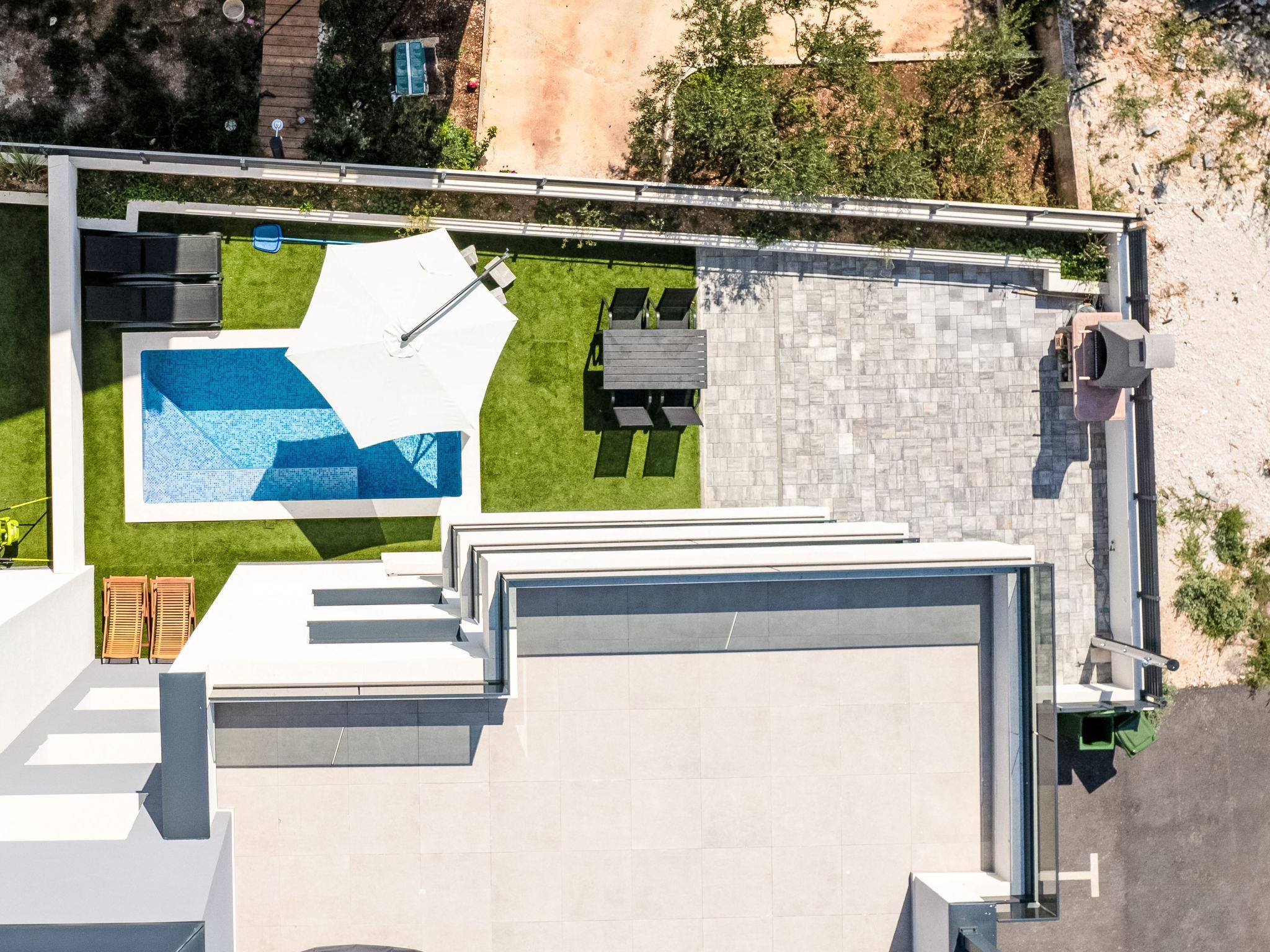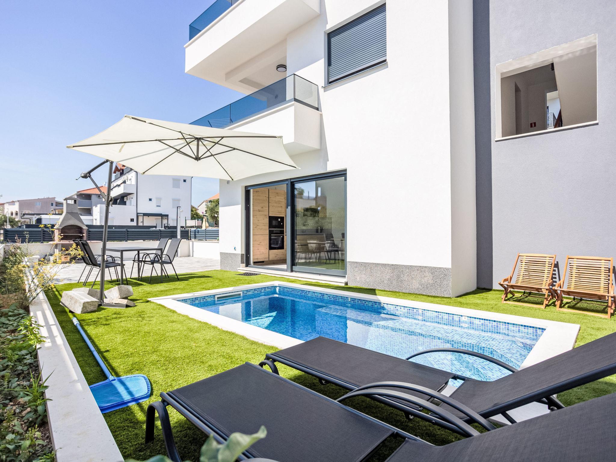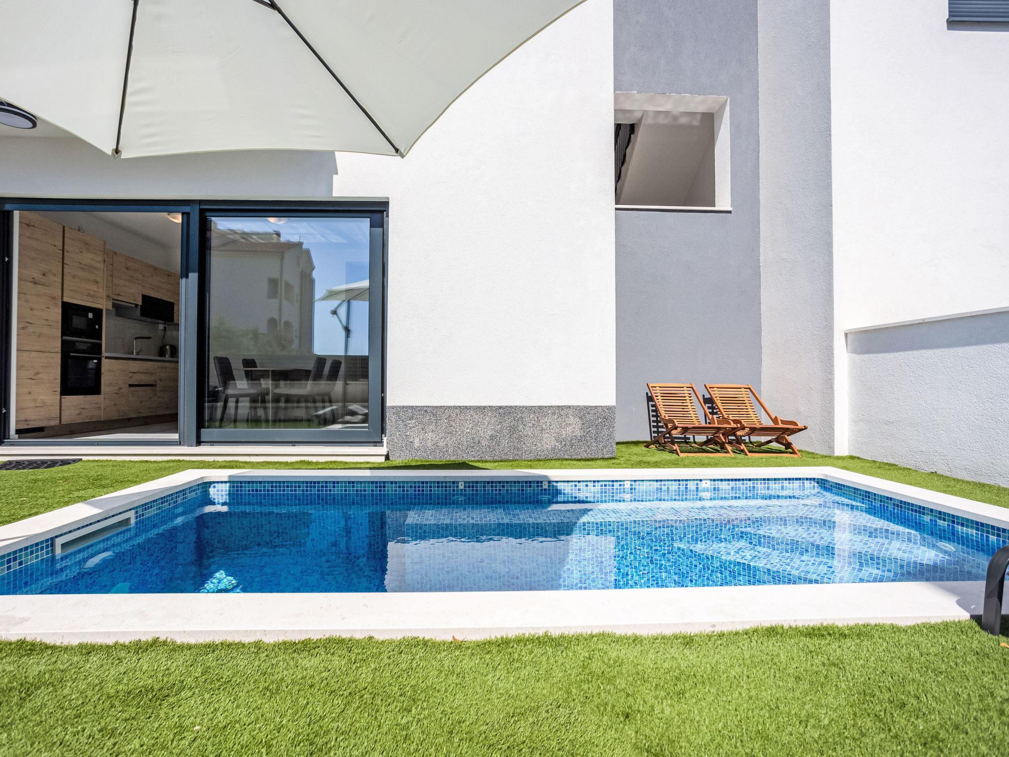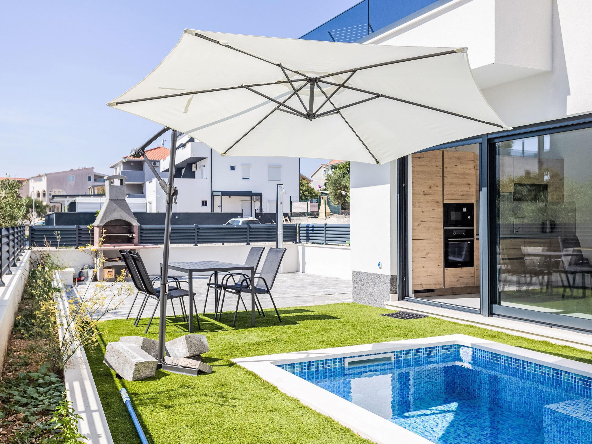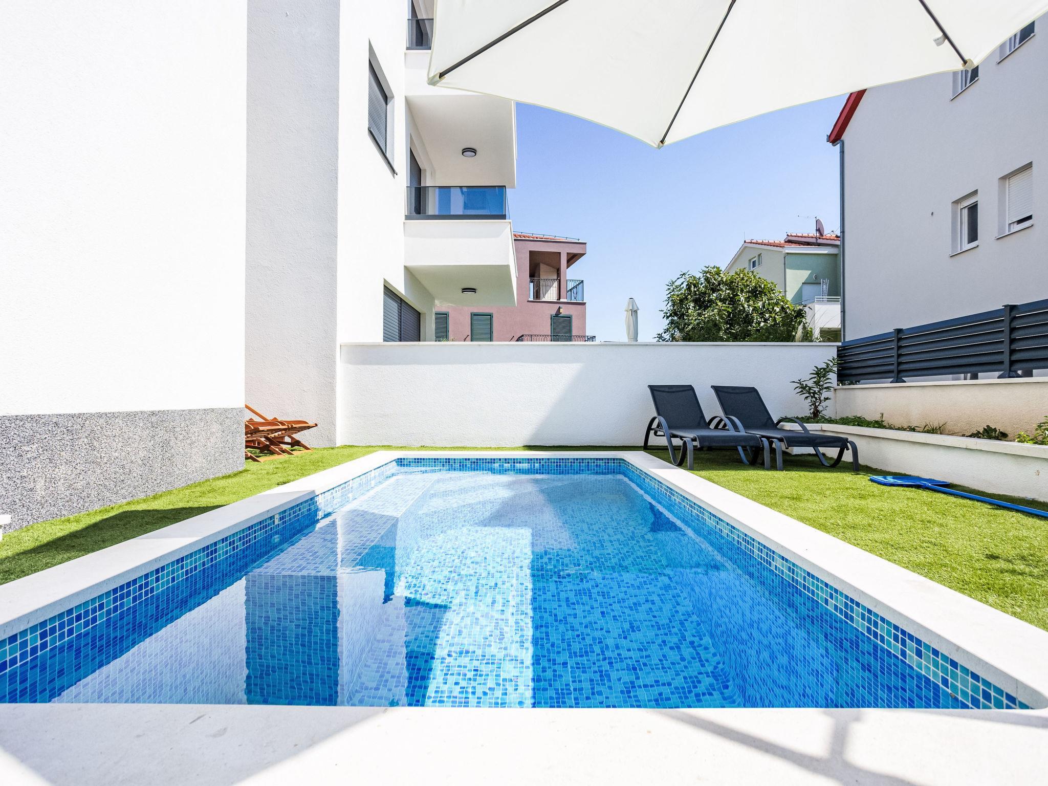Okrug Gornji: Residenz auf 3 Stockwerken, Baujahr 2022. 6 km vom Zentrum von Trogir, 2 km vom Zentrum von Okrug Gornji, sonnige Lage in einem Wohnquartier, 500 m vom Meer, 500 m vom Strand. Zur Alleinbenutzung: Grundstück 80 m2 (eingezäunt), Schwimmbad eckig (9 m2, 150 cm tief, saisonale Verfügbarkeit: 01.Jun. - 01.Okt.) mit Innentreppe. Aussendusche. Im Hause: Internetzugang. Parkplatz Nr. 1 beim Haus auf dem Grundstück. Einkaufsgeschäft, Restaurant 500 m, Bushaltestelle 1 km, Kieselstrand 1 km. Bitte beachten: Flugplatz 7 km vom Haus.