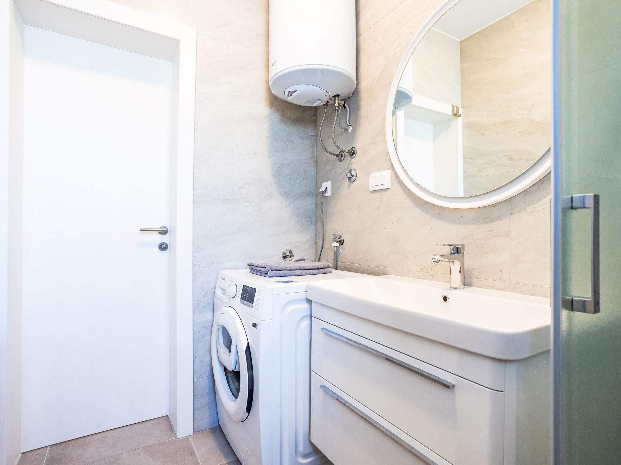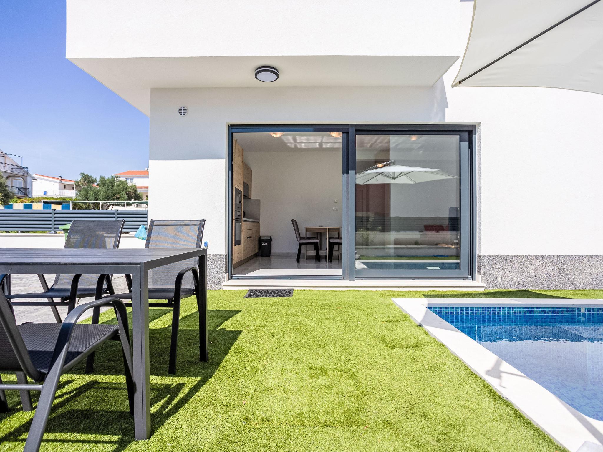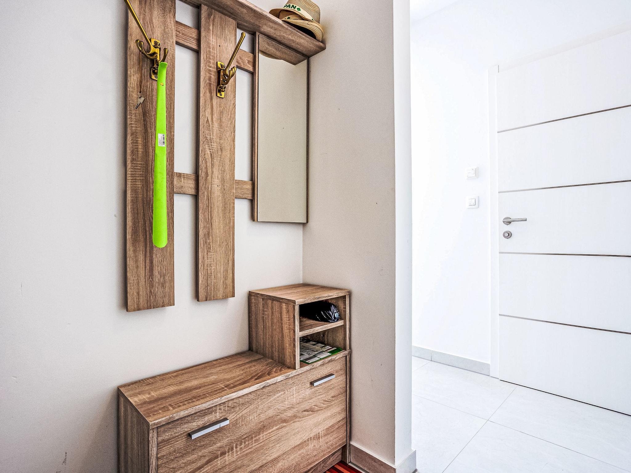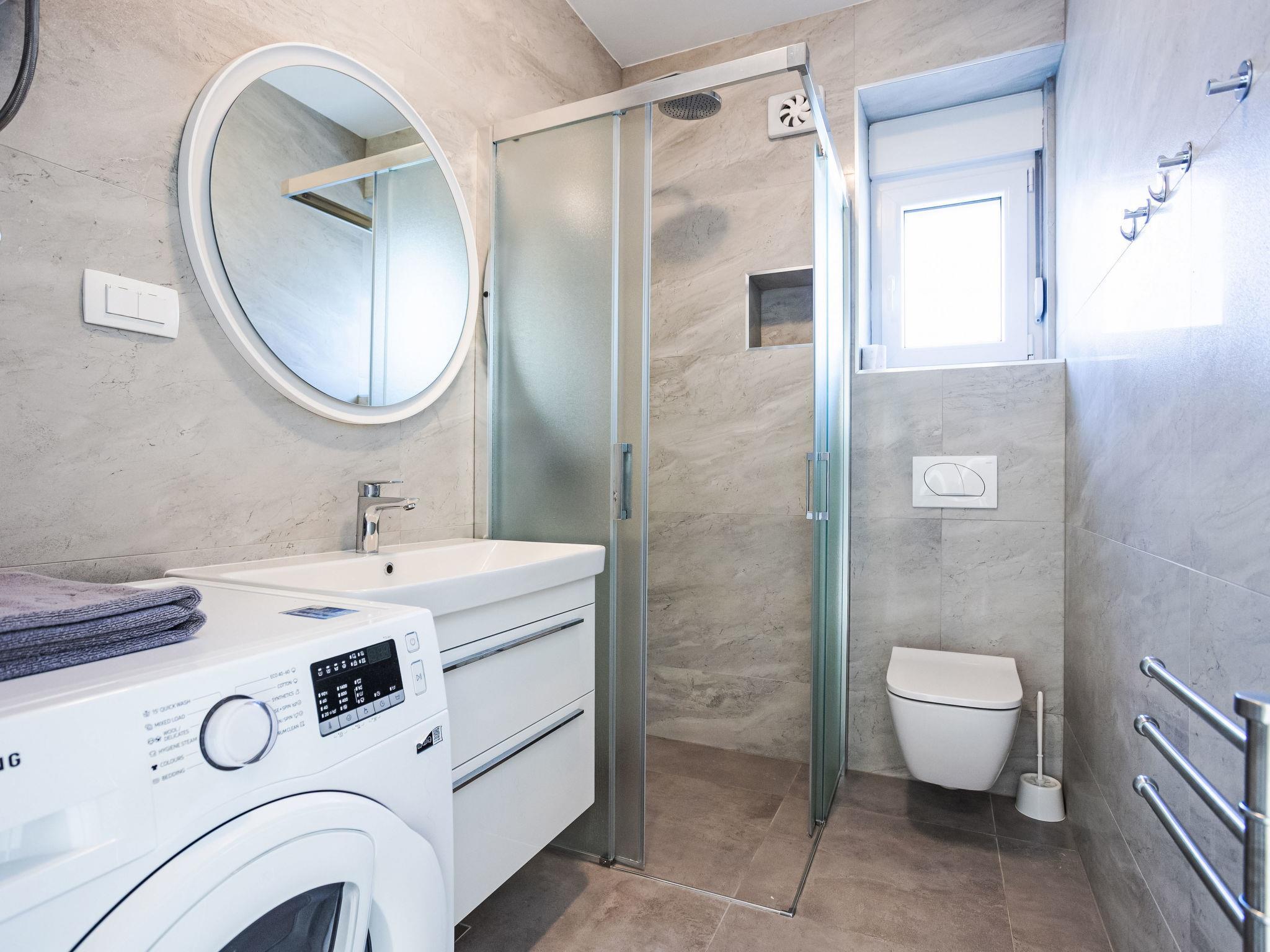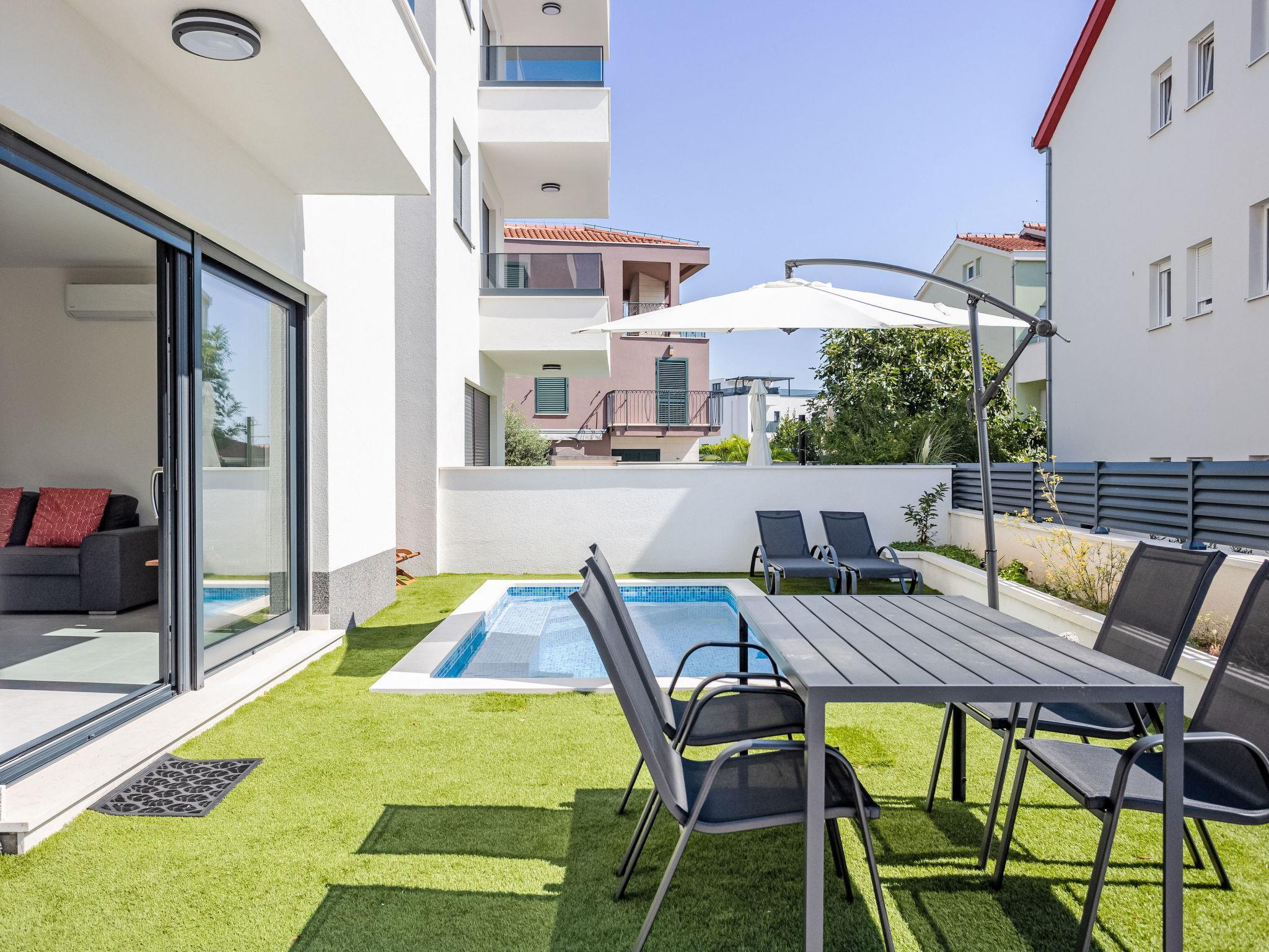 Okrug Gornji: Residenz auf 3 Stockwerken, Baujahr 2022. 6 km vom Zentrum von Trogir, 2 km vom Zentrum von Okrug Gornji, sonnige Lage in einem Wohnquartier, 500 m vom Meer, 500 m vom Strand. Zur Alleinbenutzung: Grundstück 80 m2 (eingezäunt), Schwimmbad eckig (9 m2, 150 cm tief, saisonale Verfügbarkeit: 01.Jun. - 01.Okt.) mit Innentreppe. Aussendusche. Im Hause: Internetzugang. Parkplatz Nr. 1 beim Haus auf dem Grundstück. Einkaufsgeschäft, Restaurant 500 m, Bushaltestelle 1 km, Kieselstrand 1 km. Bitte beachten: Flugplatz 7 km vom Haus.