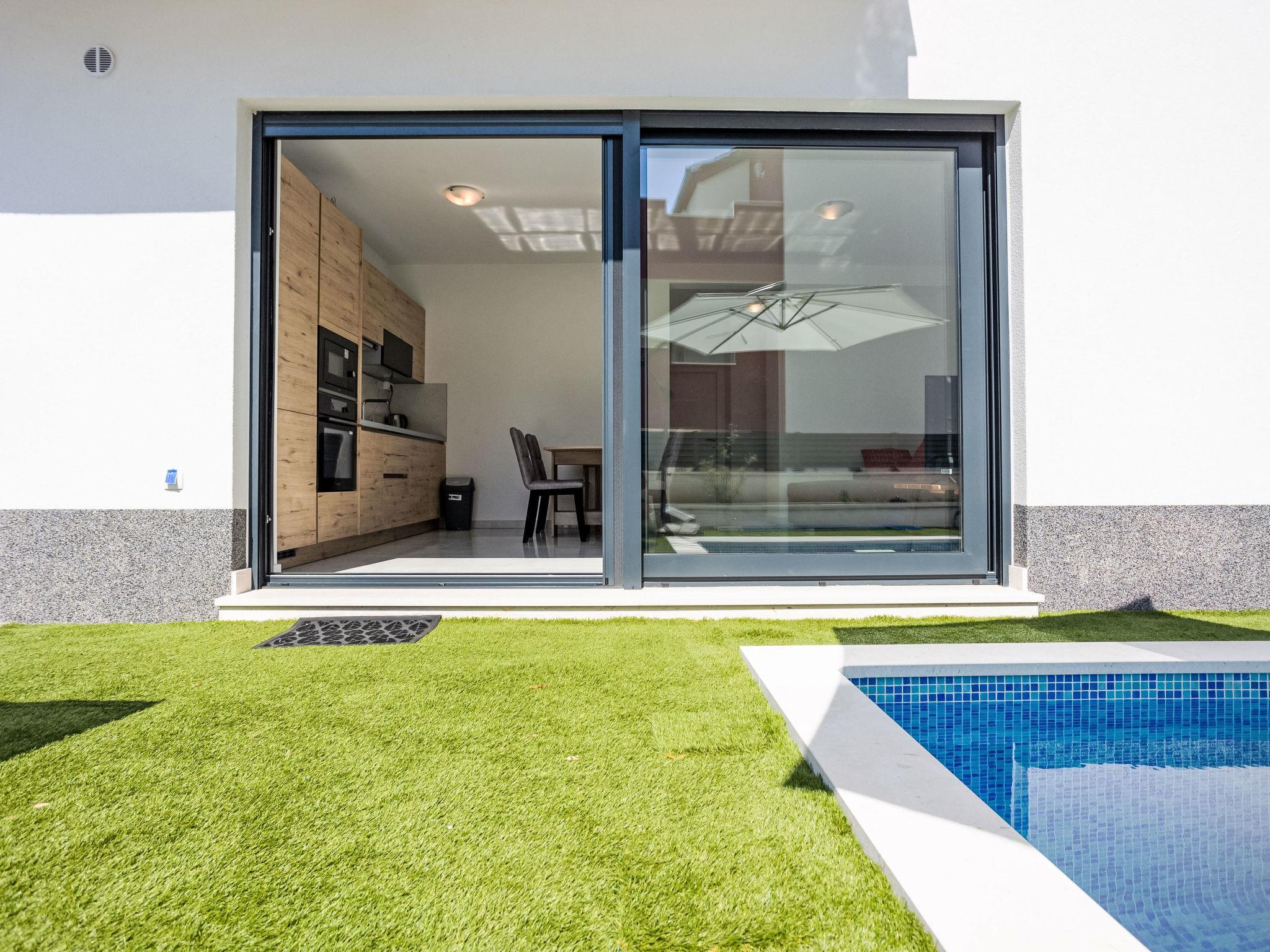 "Sunny Pool", 3-Zimmer-Wohnung 51 m2, im Erdgeschoss, Südlage. Wohn-/Esszimmer mit 1 Diwanbett (120 cm, Länge 200 cm), Sat-TV (Flachbildschirm), Klimaanlage. Ausgang zur Terrasse, zum Schwimmbad. 1 Zimmer mit 1 franz. Bett (160 cm, Länge 200 cm), Klimaanlage. 1 Zimmer mit 2 Betten (90 cm, Länge 200 cm), Klimaanlage. Offene Küche (Backofen, Geschirrspüler, 4 Glaskeramikplatten, Mikrowelle, Tiefkühler, elektrische Kaffeemaschine). Dusche/WC. Klimaanlage, Bodenheizung. Terrasse 20 m2. Gartengrill, Liegestühle. Eingeschränkte Sicht auf das Meer. Zur Verfügung: Waschmaschine, Fliegengitter. Internet (Wireless LAN, gratis).