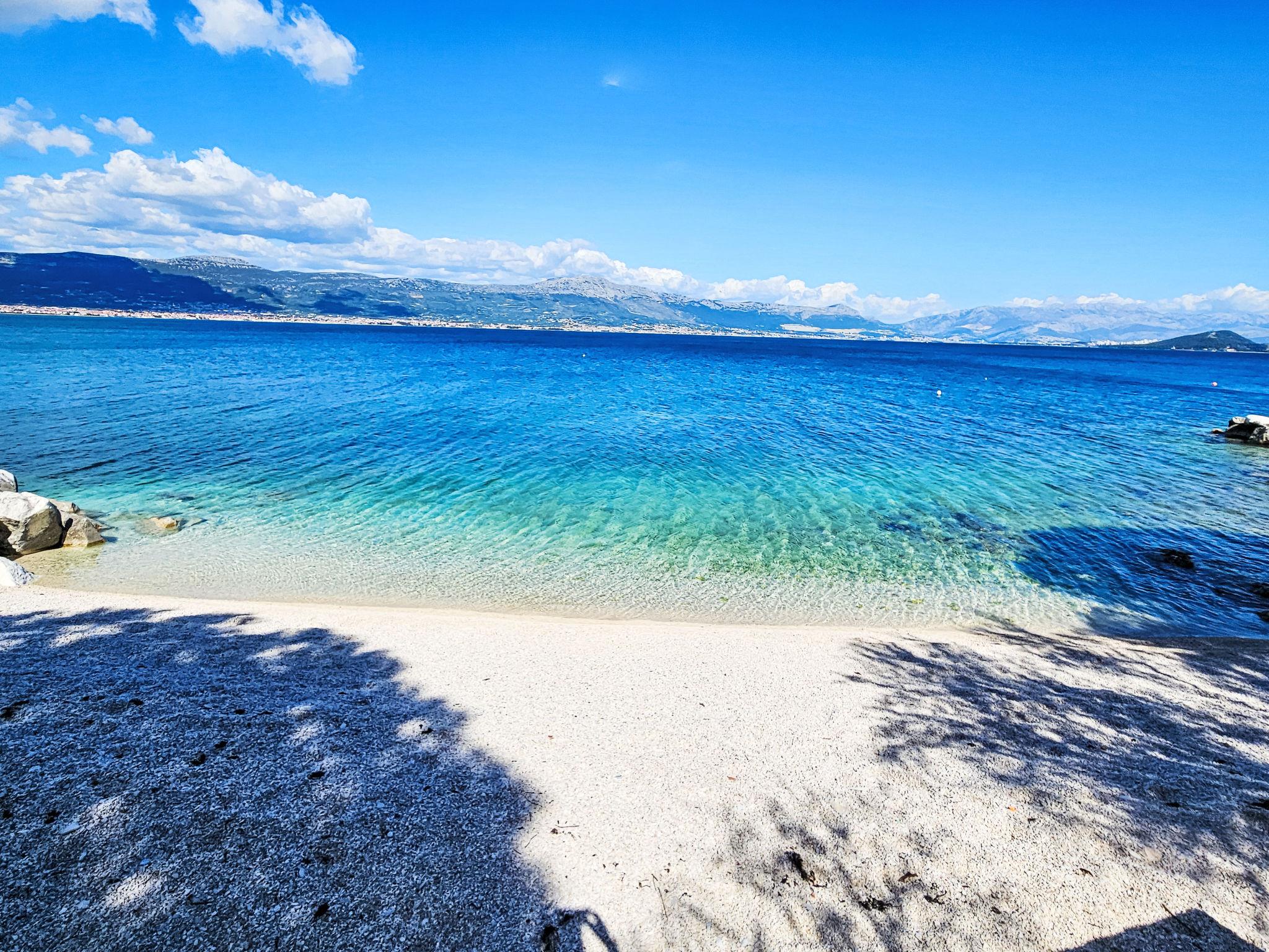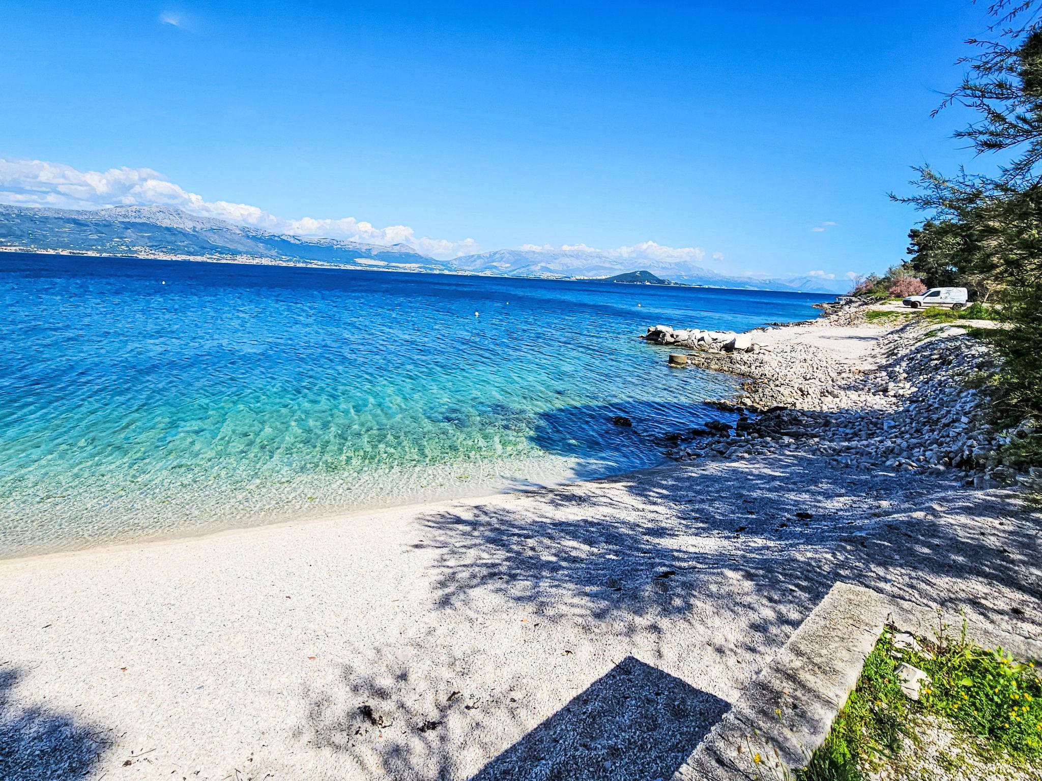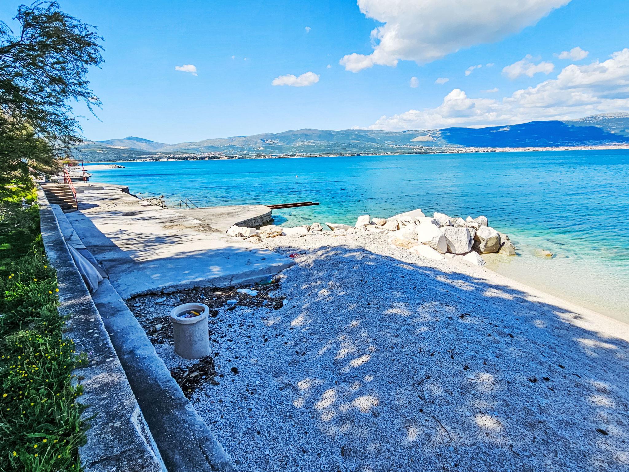 Slatine (Ciovo) 6 km von Trogir: Einfamilienhaus "Robert", auf 2 Stockwerken. Sonnige, erhöhte Lage, 30 m vom Meer, 30 m vom Strand, Strasse zu überqueren, Richtung Norden. Zur Mitbenutzung: Grundstück 800 m2 (eingezäunt), Garten. Zur Alleinbenutzung: Aussendusche, Terrasse (5 m2), Gartenmöbel, Grill. Im Hause: Internetzugang. Parkplatz (für 3 Autos) beim Haus auf dem Grundstück. Einkaufsgeschäft 550 m, Restaurant 350 m, Bushaltestelle 94 m, Steinstrand 30 m, Felsstrand 50 m. Bitte beachten: Flugplatz 9 km vom Haus.