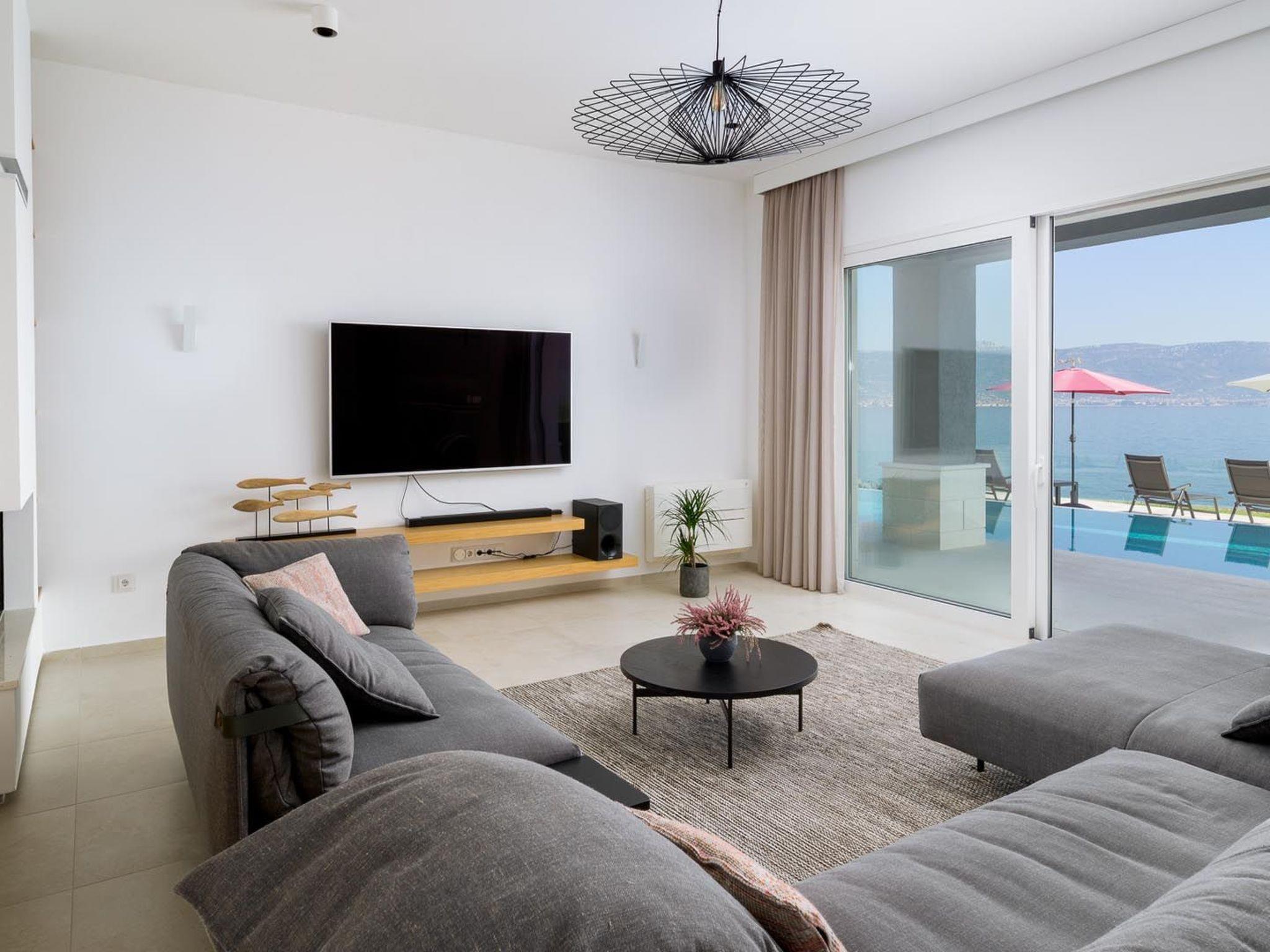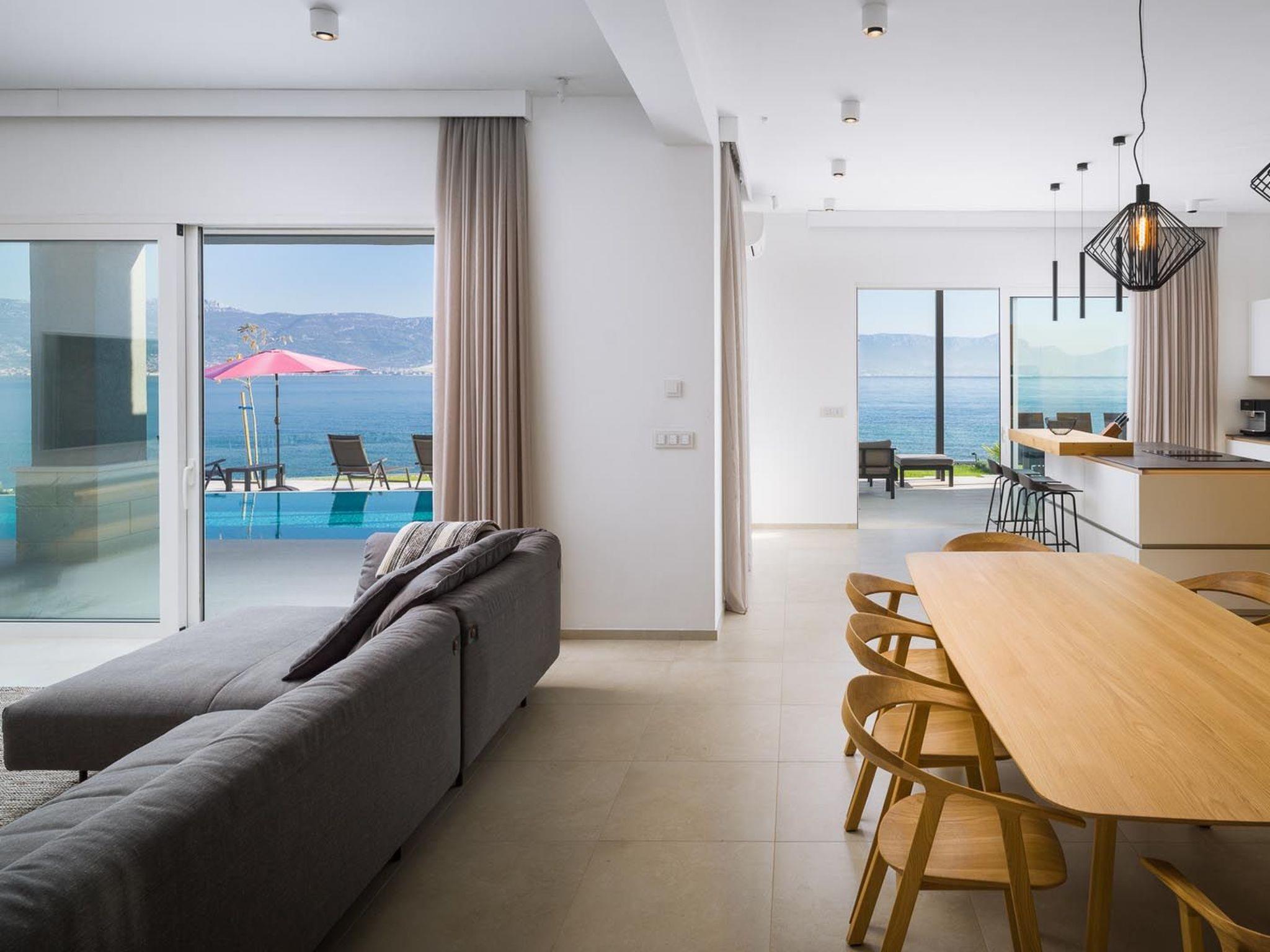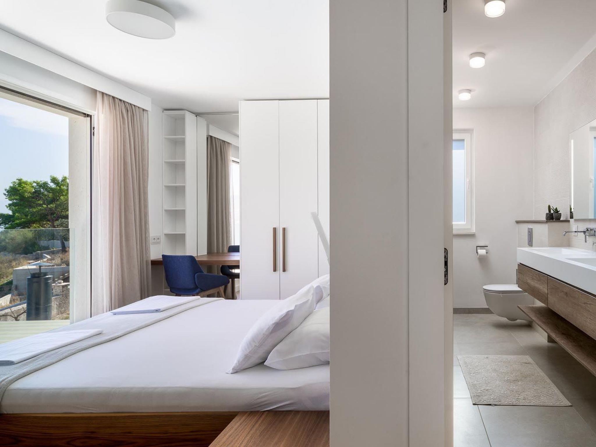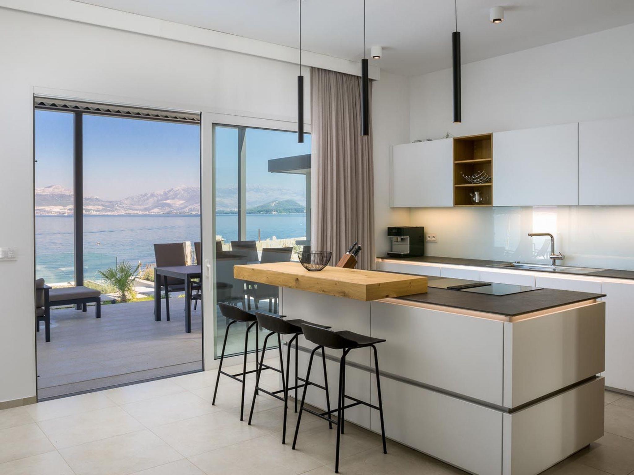 Die Villa Paradise besteht aus dem Erdgeschoss und dem ersten Stock und umfasst insgesamt 260 m2 Wohnfläche. Die Villa verfügt über 4 Doppelschlafzimmer, 3 Bäder, Wohnzimmer mit offener Küche, 1 Halbbad und kann bis zu 8 Personen beherbergen. Das Erdgeschoss besteht aus einem geräumigen Wohnzimmer mit hochwertigen Möbeln und einem Innenkamin, einem Essbereich mit einem großen Esstisch und Stühlen für 8 Personen und einer gut ausgestatteten luxuriösen offenen Küche. Große Glasschiebetüren führen vom Wohnzimmer und der Küche auf die überdachte Terrasse mit Gartenmöbeln und einem Außengrill mit Blick auf das Meer und den Garten. Die erste Etage ist als Ruhebereich mit 4 klimatisierten Schlafzimmern mit Kingsize-Betten und SAT-TVs und 3 Bädern mit Duschen konzipiert. Zwei Schlafzimmer haben große französische Balkone mit spektakulärem Blick auf das Meer, so dass man das Gefühl hat, in einem wahren mediterranen Paradies aufzuwachen. Die Villa Paradise ist voll klimatisiert und mit SAT-TV, Wi-fi, Safe, Bügeleisen und Bügelbrett, Waschmaschine, Haartrockner, Herd, Backofen, Dunstabzugshaube, Kühlschrank mit Gefrierfach, Geschirrspüler, Wasserkocher und Kaffeemaschine ausgestattet. Babybett und Hochstuhl sowie Liegeplatz für Boote sind auf Anfrage erhältlich. Den Gästen stehen 3 überdachte Parkplätze zur Verfügung. Haustiere sind nicht erlaubt. Die Kurtaxe ist bei der Ankunft zu entrichten. Die Gäste erhalten bei ihrer Ankunft ein Begrüßungsgetränk.