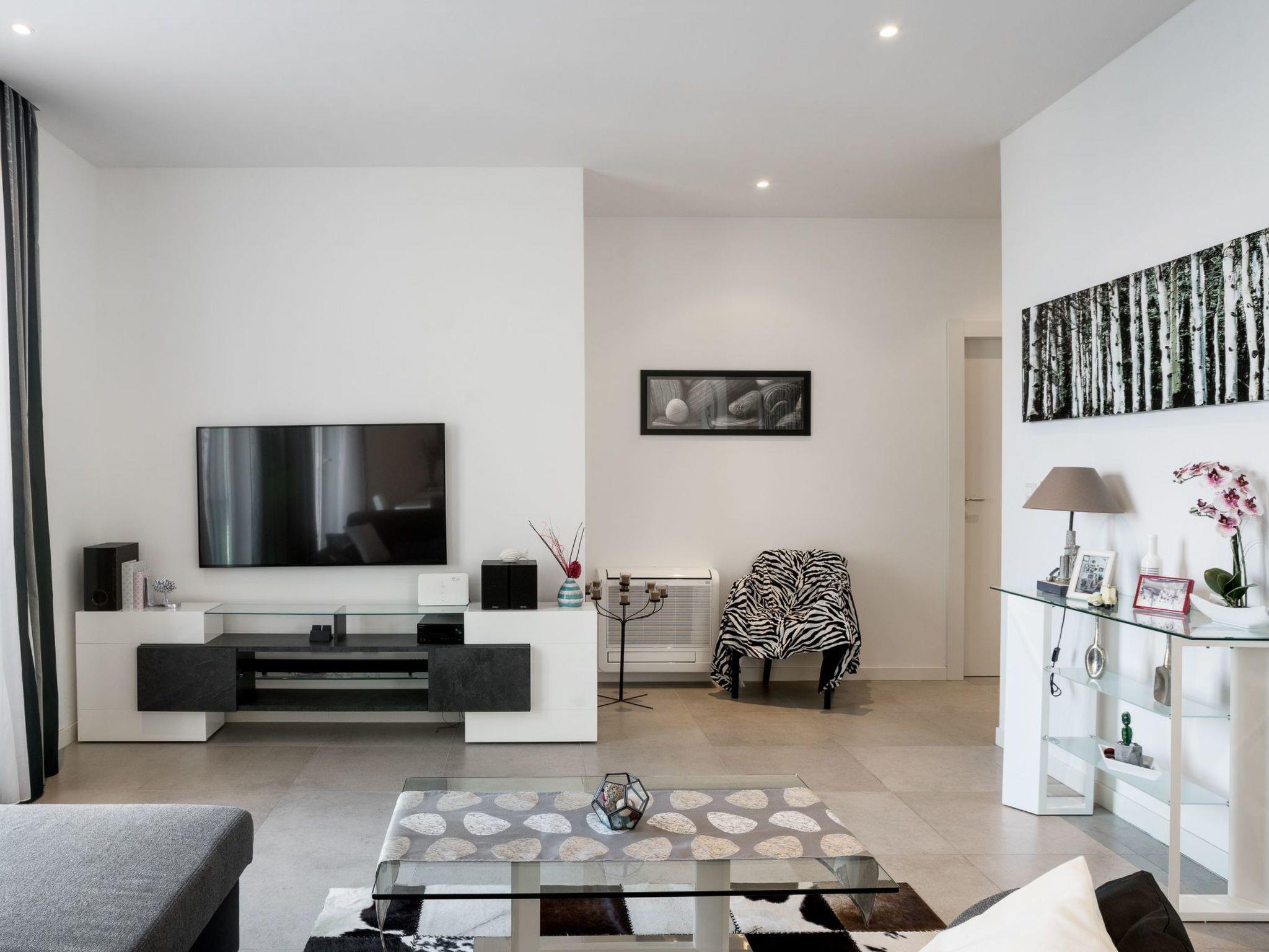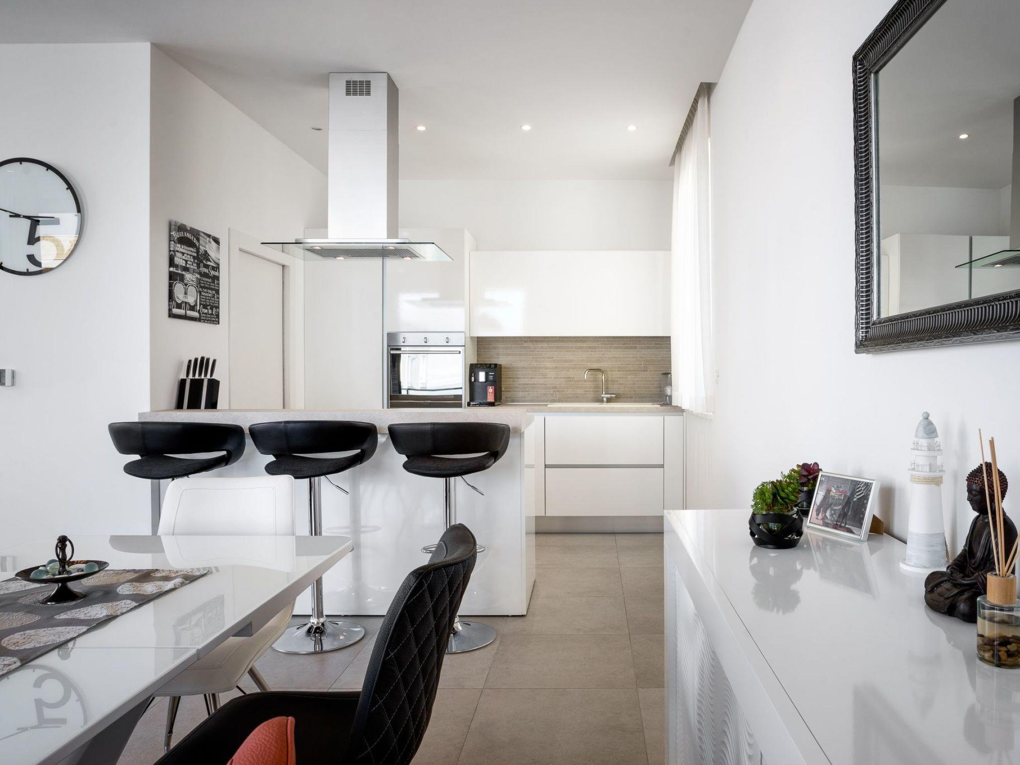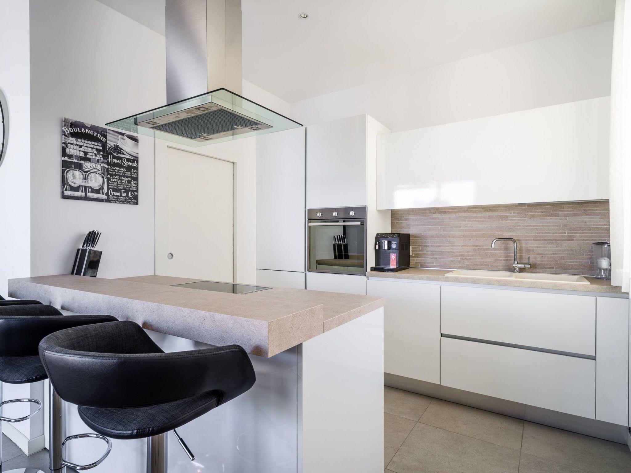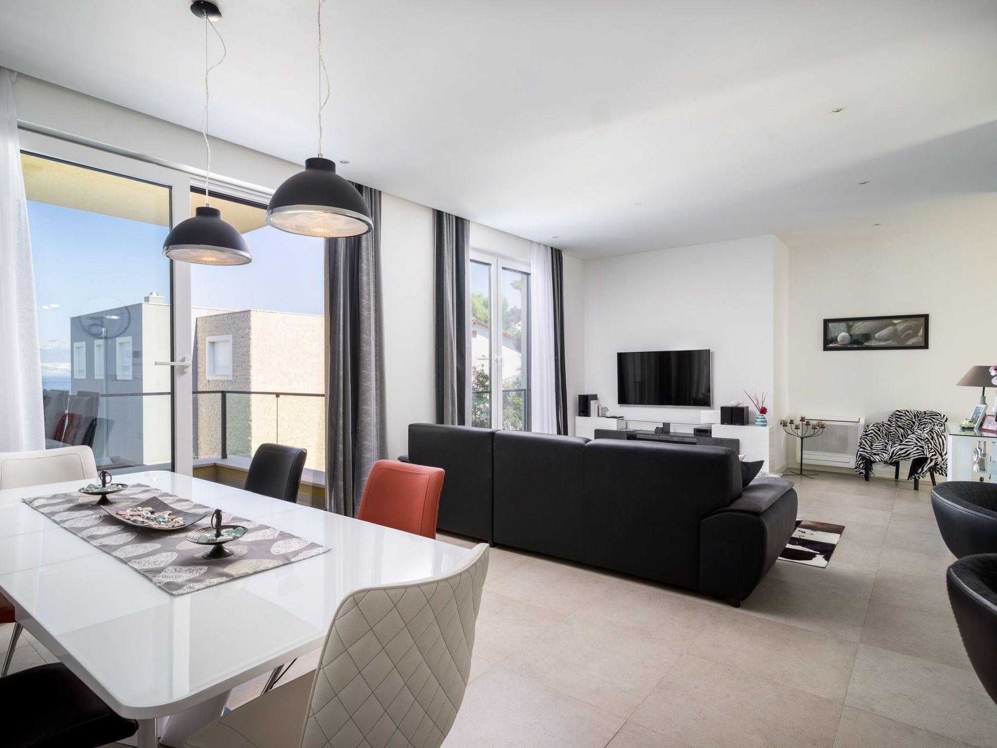 Eine Glasschiebetür führt vom Wohnzimmer auf einen schönen überdachten Balkon mit Meerblick, der mit Gartenmöbeln und einem elektrischen Grill ausgestattet ist.