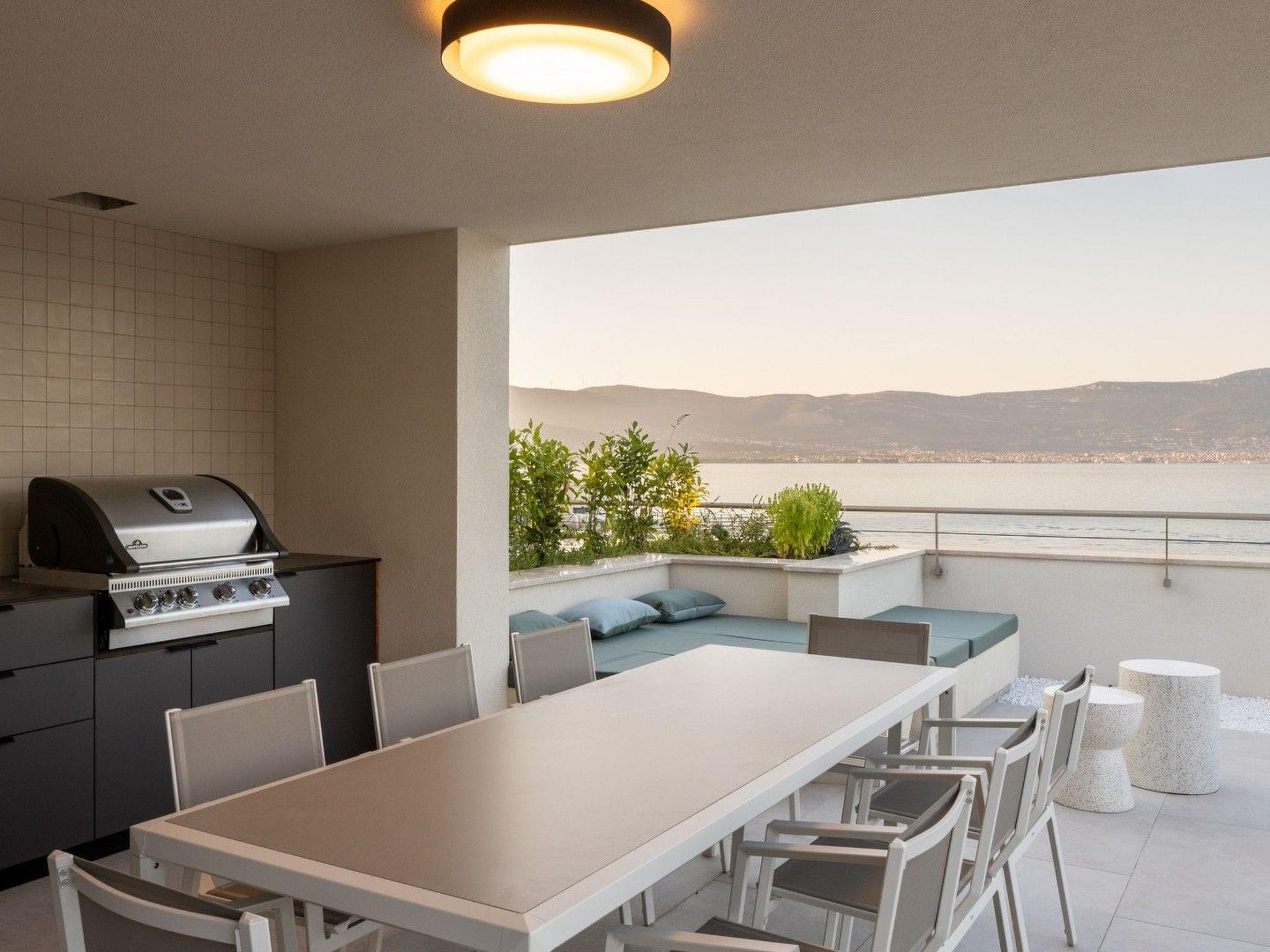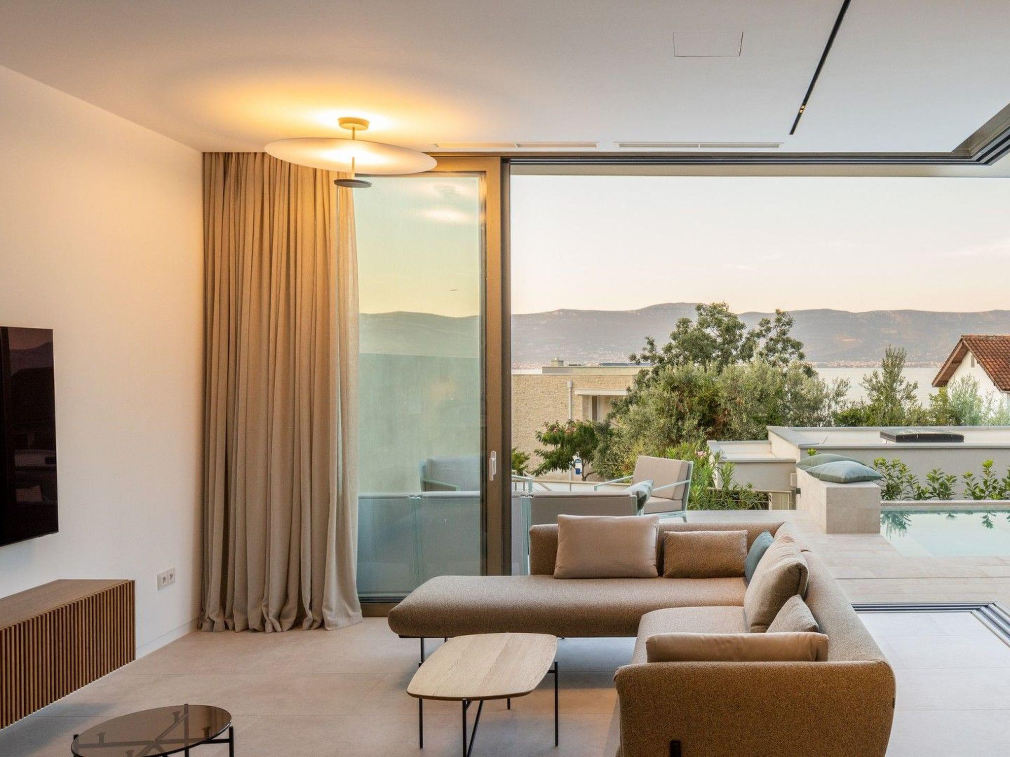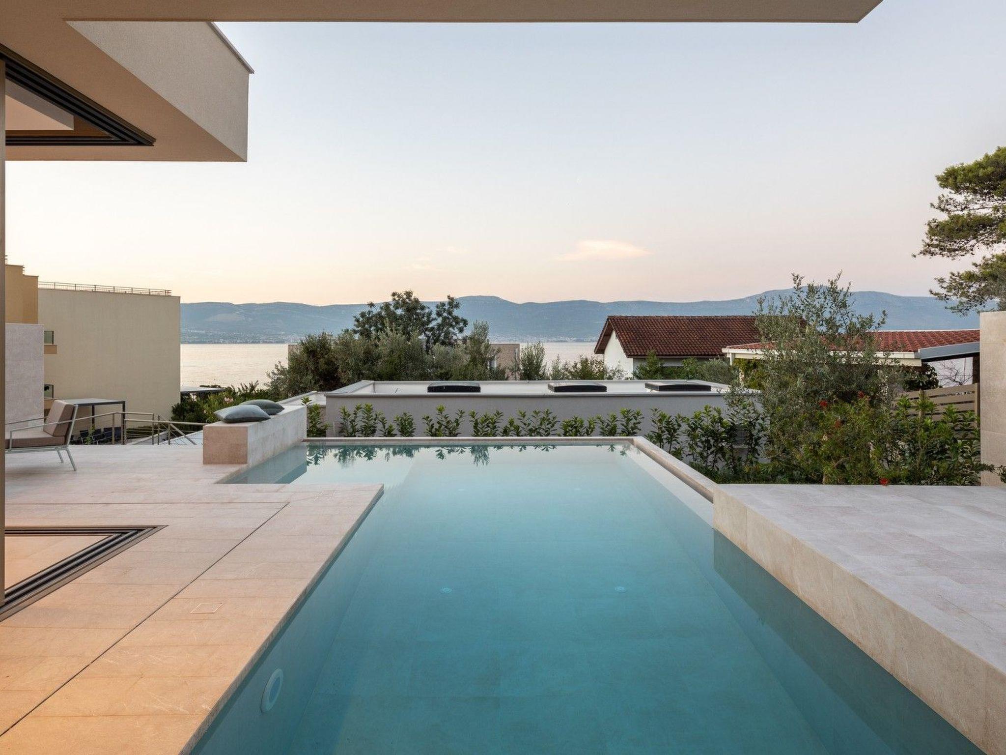 Diese wunderschön eingerichtete Villa ist Teil des Strandkomplexes Golden. Sie ist eine Mischung aus Eleganz, Luxus und Funktionalität. Die Villa liegt nur 30 Meter von einem atemberaubenden Kieselstrand und kristallklarem Meer entfernt und bietet einen atemberaubenden Panoramablick auf die Küste, die Berge und die Stadt Split.