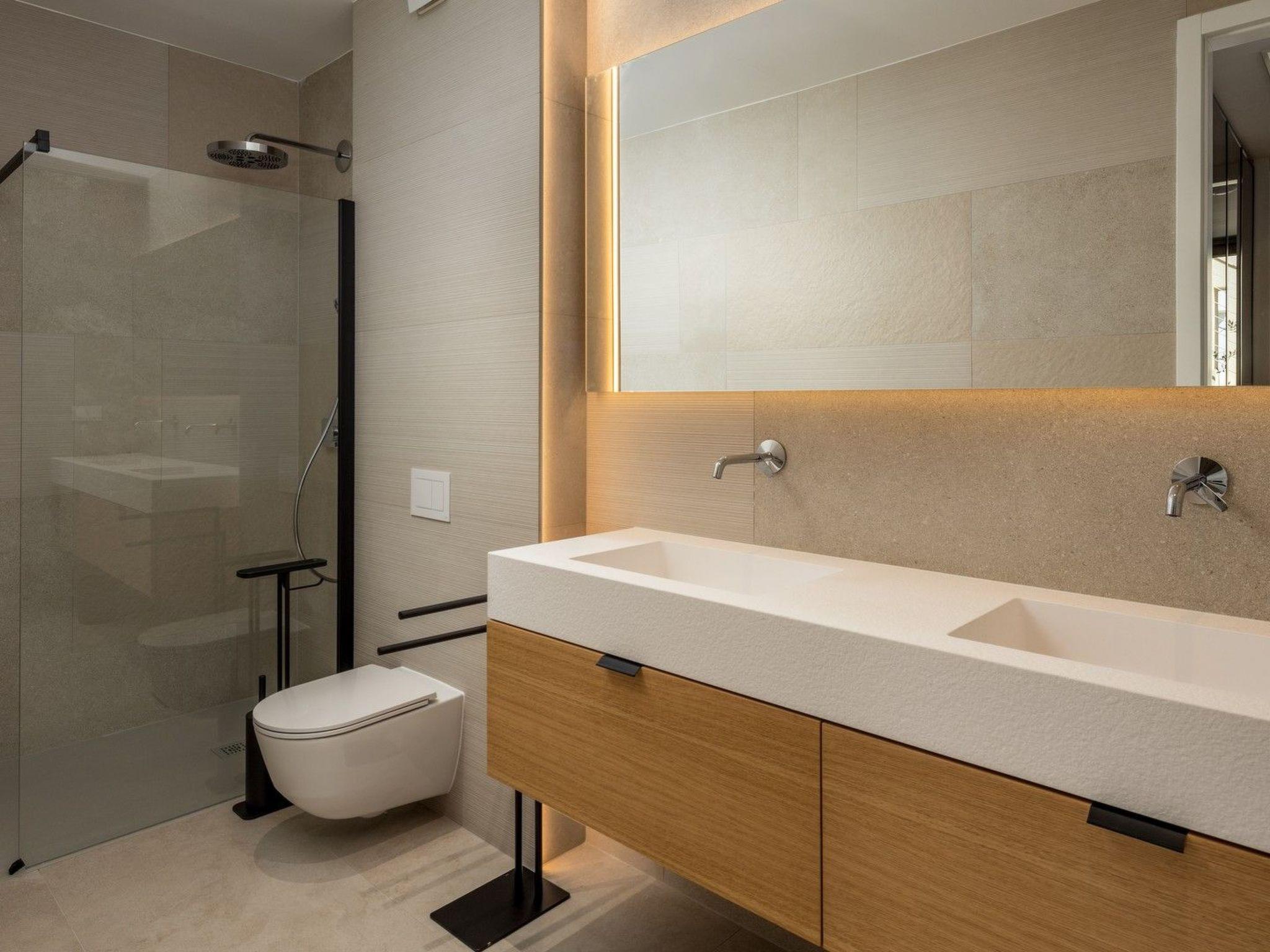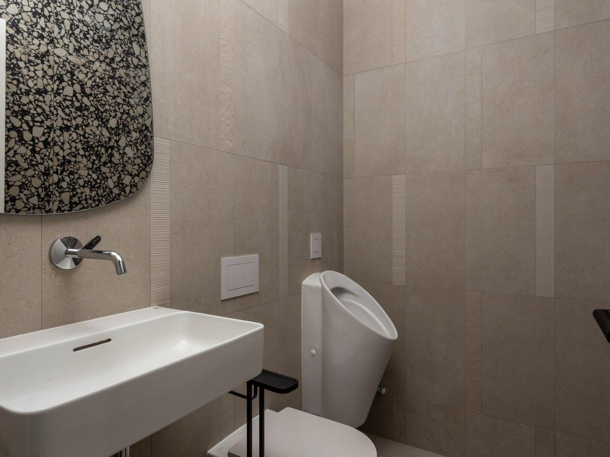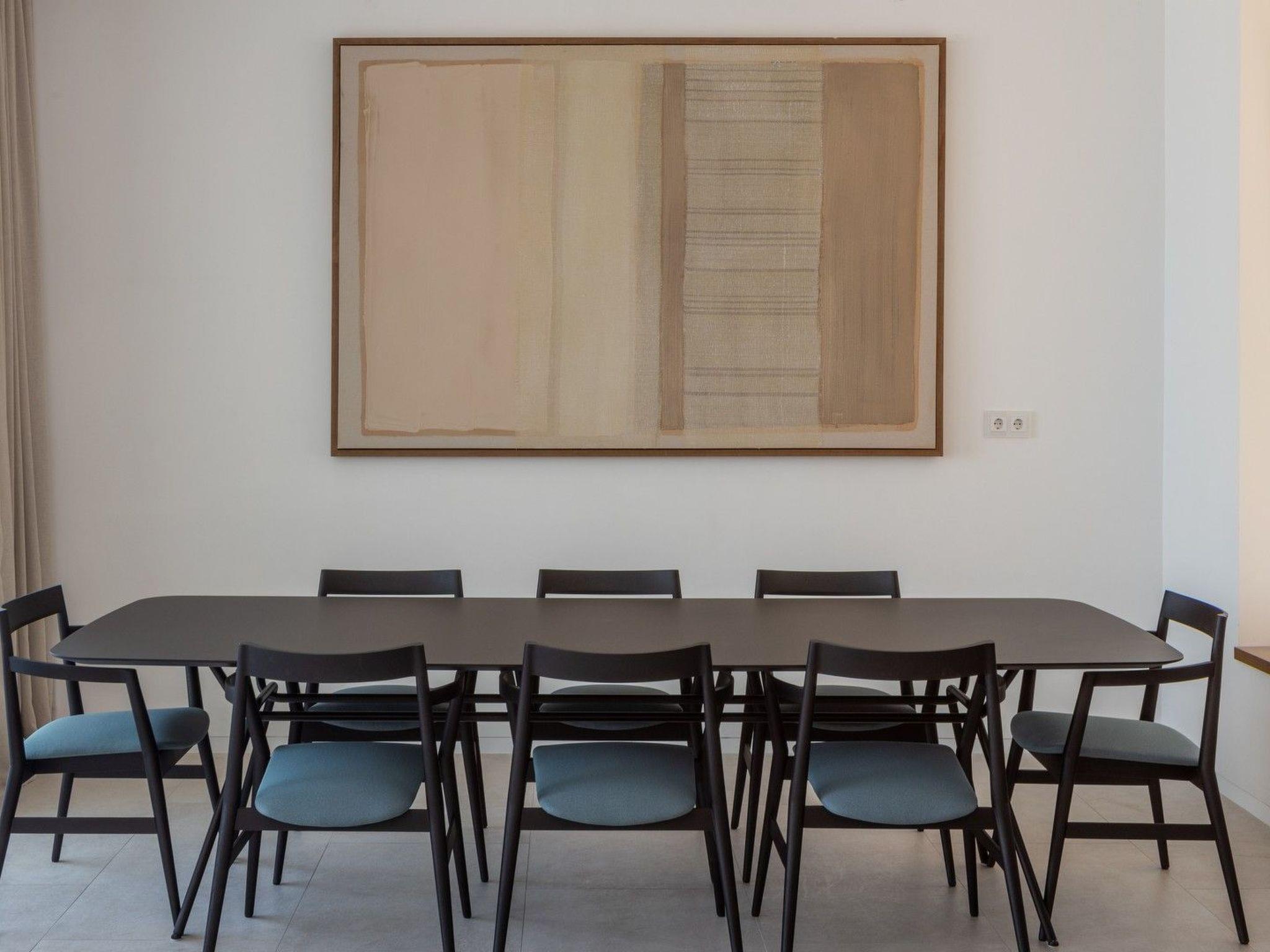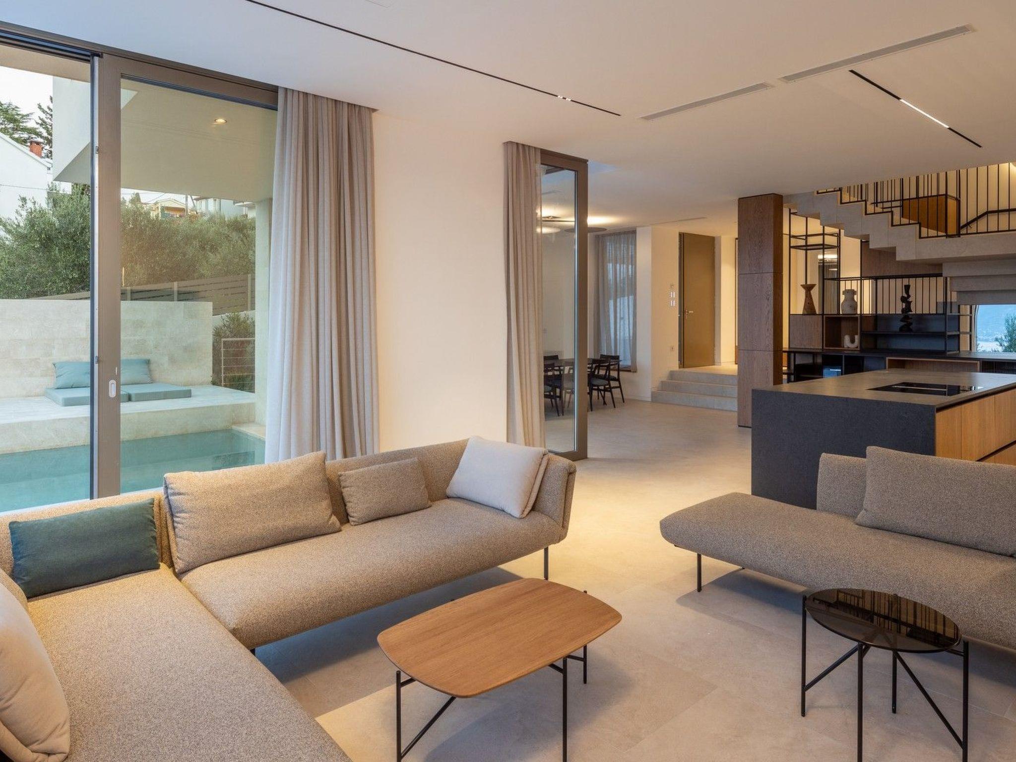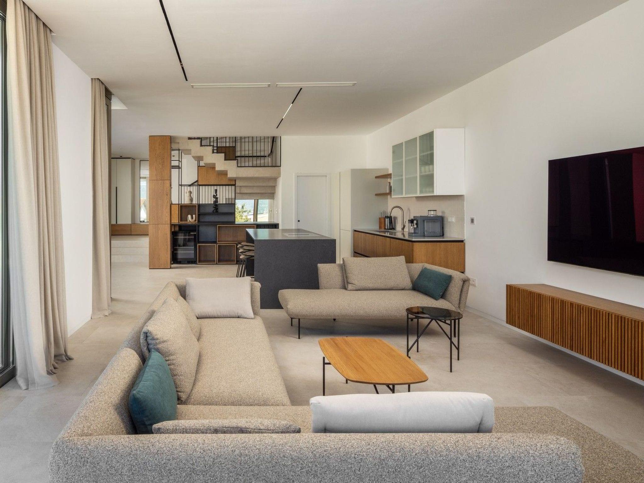 Im Untergeschoss finden Sie eine Waschküche, einen kleinen Fitnessraum, eine türkische Sauna und ein halbes Bad. Im Erdgeschoss finden Sie ein geräumiges Wohnzimmer mit hochwertigen Möbeln, einen Essbereich mit einem großen Tisch und Stühlen für 8 Personen und eine gut ausgestattete, luxuriöse, offene Küche. Große Glasschiebetüren führen vom Wohnzimmer und der Küche auf die Terrasse. Dieser einladende Raum ist mit Gartenmöbeln ausgestattet und bietet einen Blick auf das Meer und den Garten.