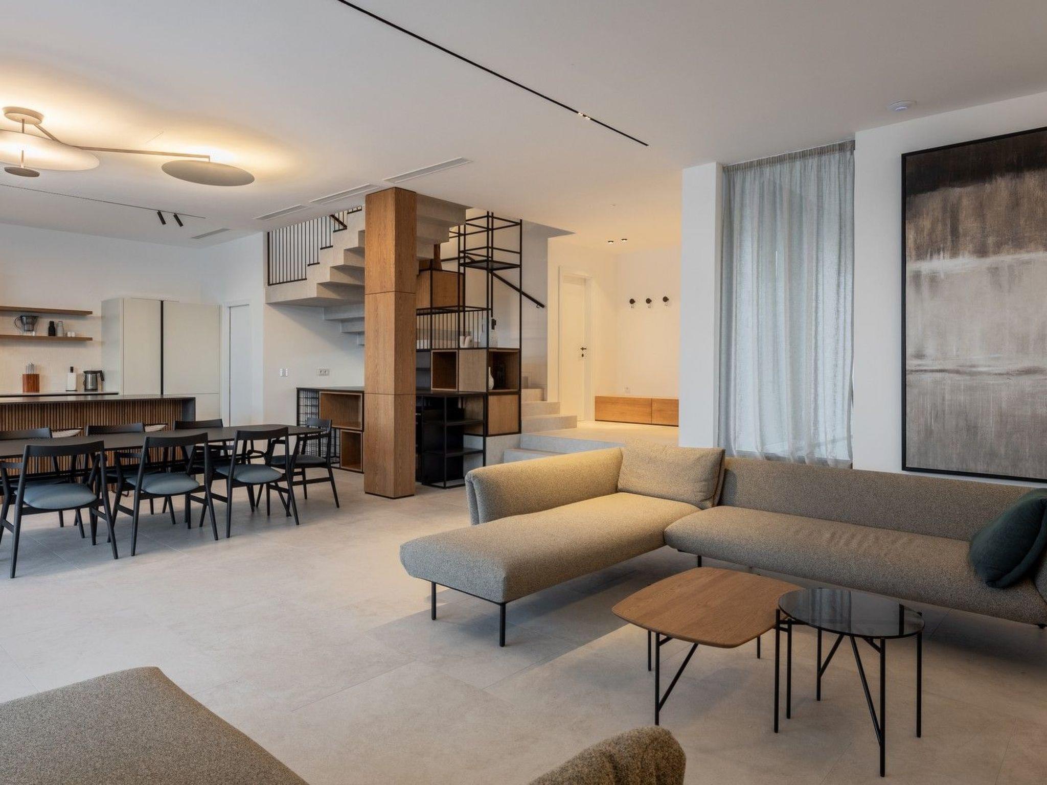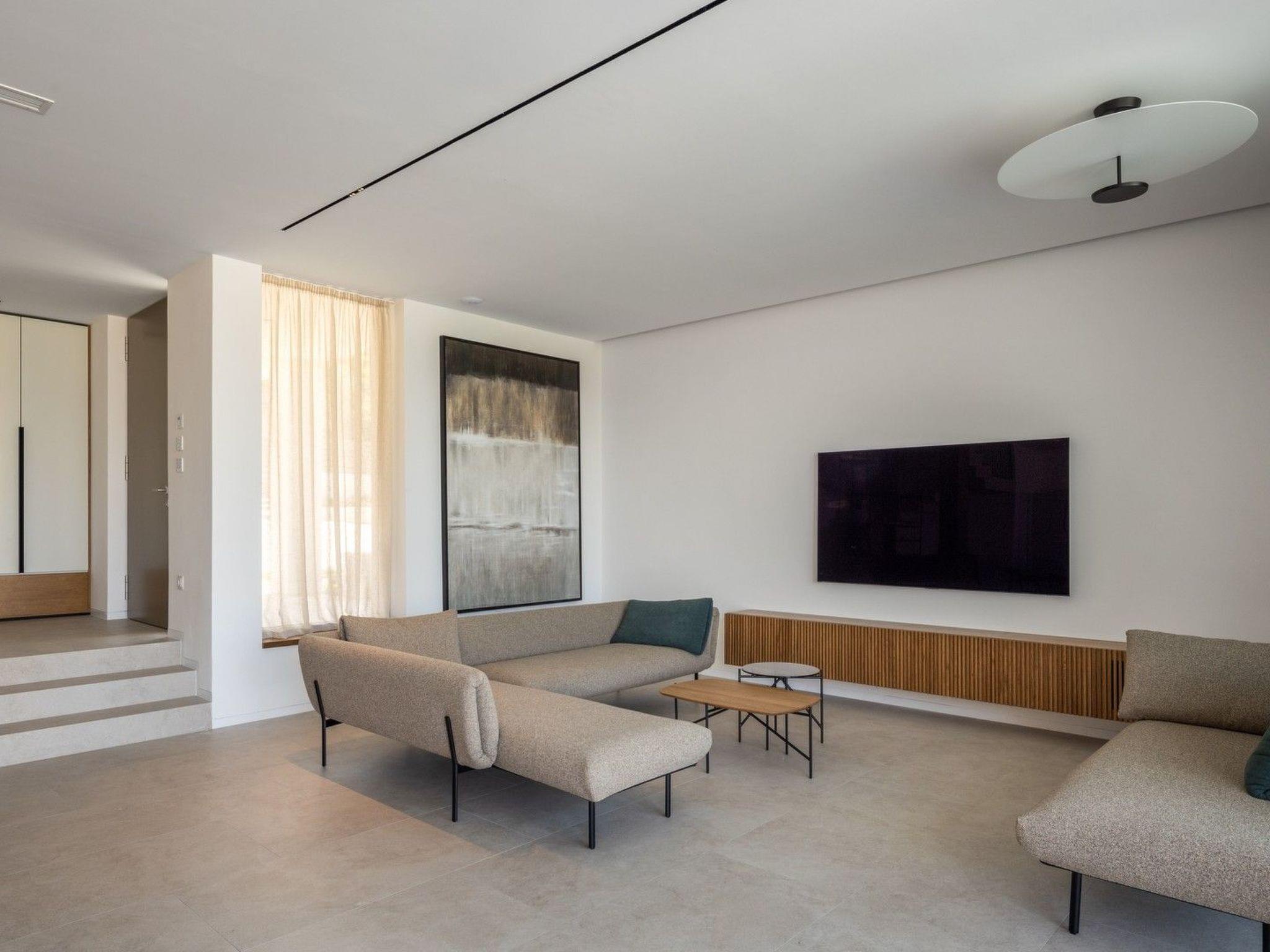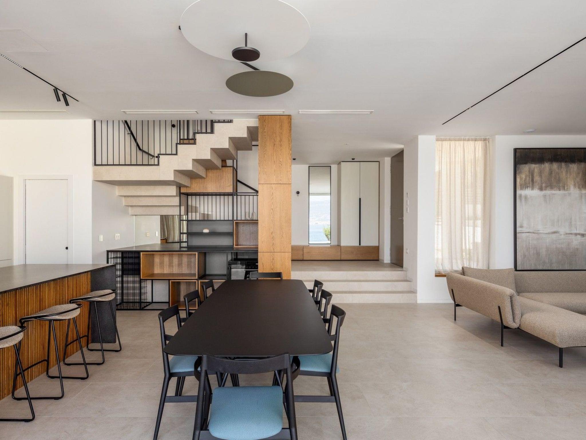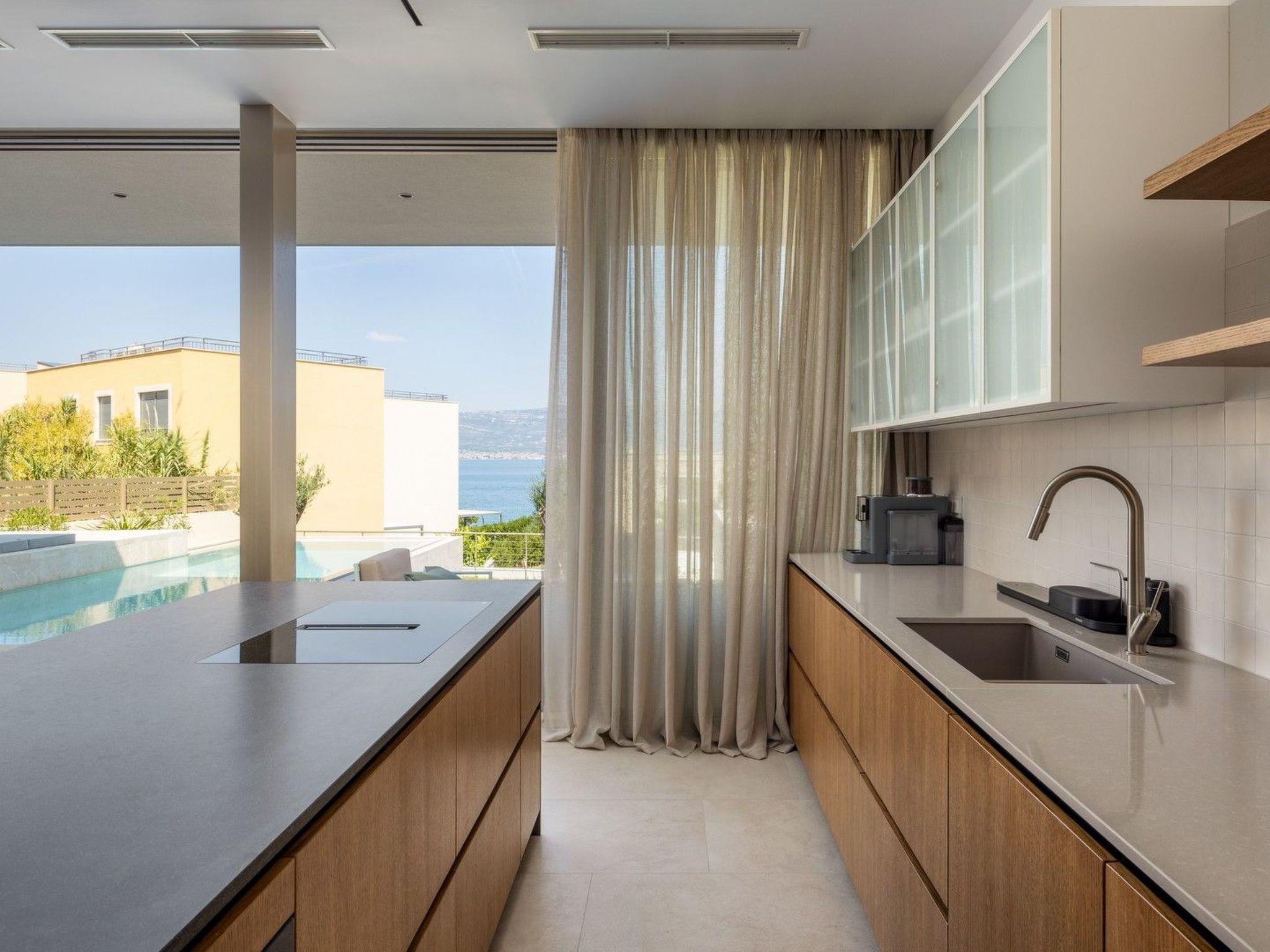 Im Untergeschoss finden Sie eine Waschküche, einen kleinen Fitnessraum, eine türkische Sauna und ein halbes Bad. Im Erdgeschoss finden Sie ein geräumiges Wohnzimmer mit hochwertigen Möbeln, einen Essbereich mit einem großen Tisch und Stühlen für 8 Personen und eine gut ausgestattete, luxuriöse, offene Küche. Große Glasschiebetüren führen vom Wohnzimmer und der Küche auf die Terrasse. Dieser einladende Raum ist mit Gartenmöbeln ausgestattet und bietet einen Blick auf das Meer und den Garten.