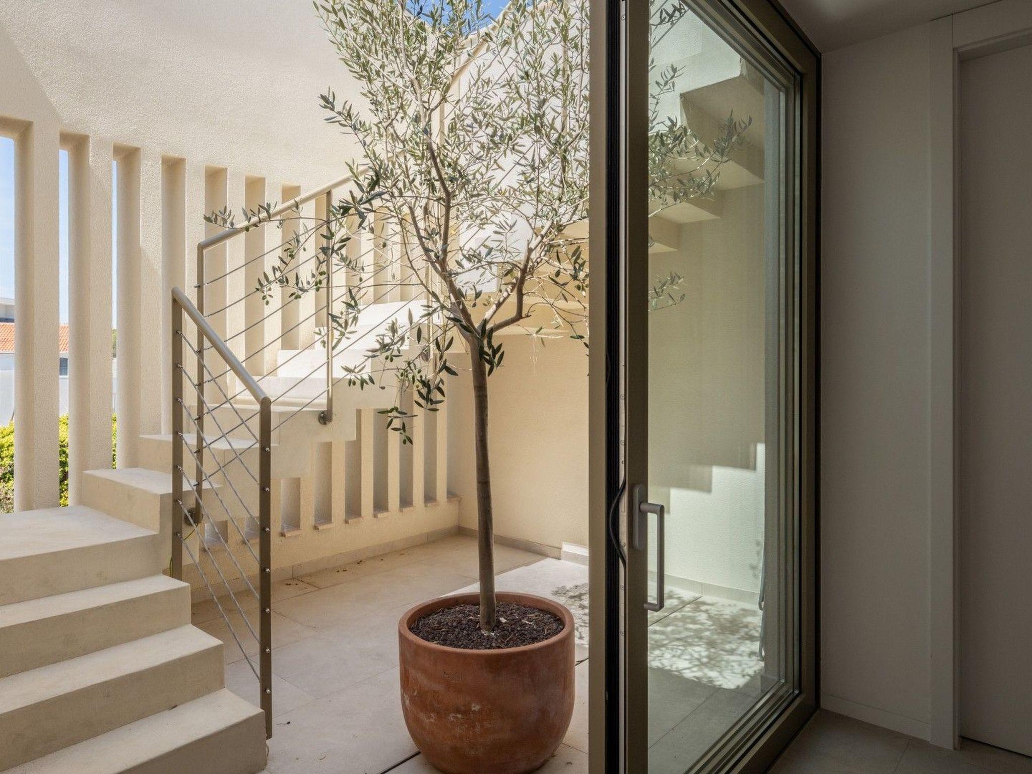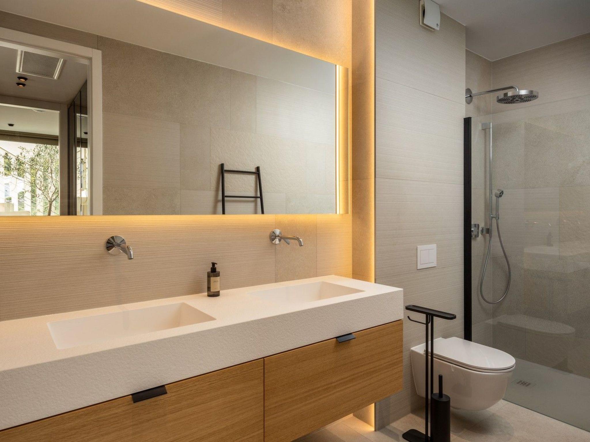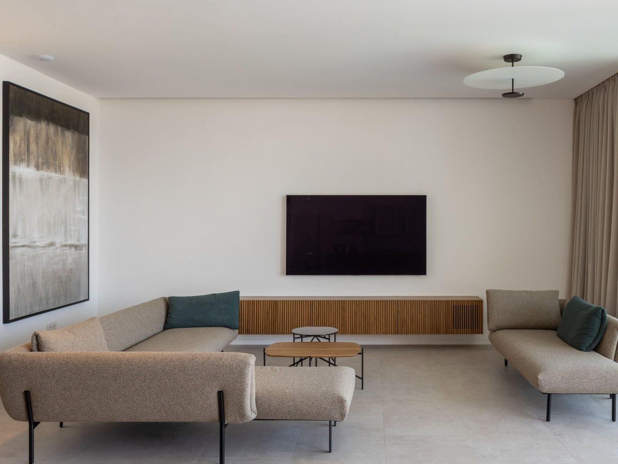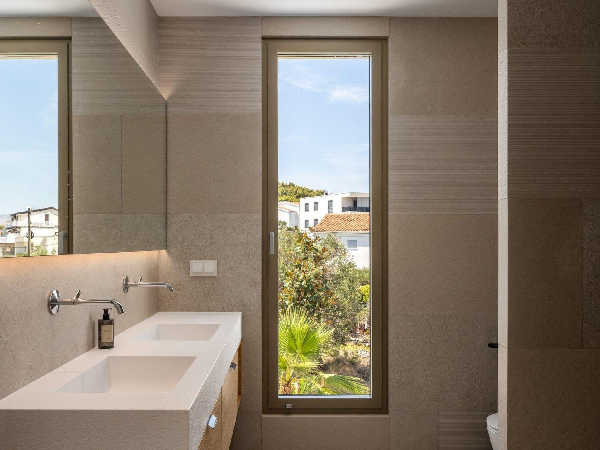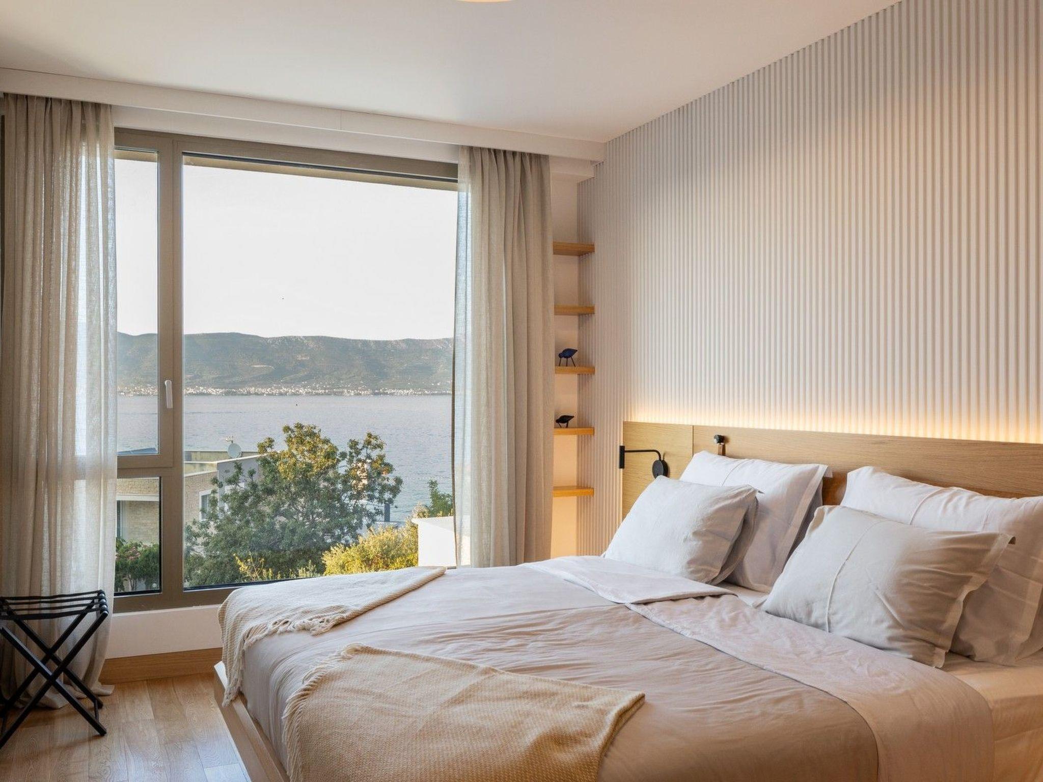 Im Untergeschoss finden Sie eine Waschküche, einen kleinen Fitnessraum, eine türkische Sauna und ein halbes Bad. Im Erdgeschoss finden Sie ein geräumiges Wohnzimmer mit hochwertigen Möbeln, einen Essbereich mit einem großen Tisch und Stühlen für 8 Personen und eine gut ausgestattete, luxuriöse, offene Küche. Große Glasschiebetüren führen vom Wohnzimmer und der Küche auf die Terrasse. Dieser einladende Raum ist mit Gartenmöbeln ausgestattet und bietet einen Blick auf das Meer und den Garten.