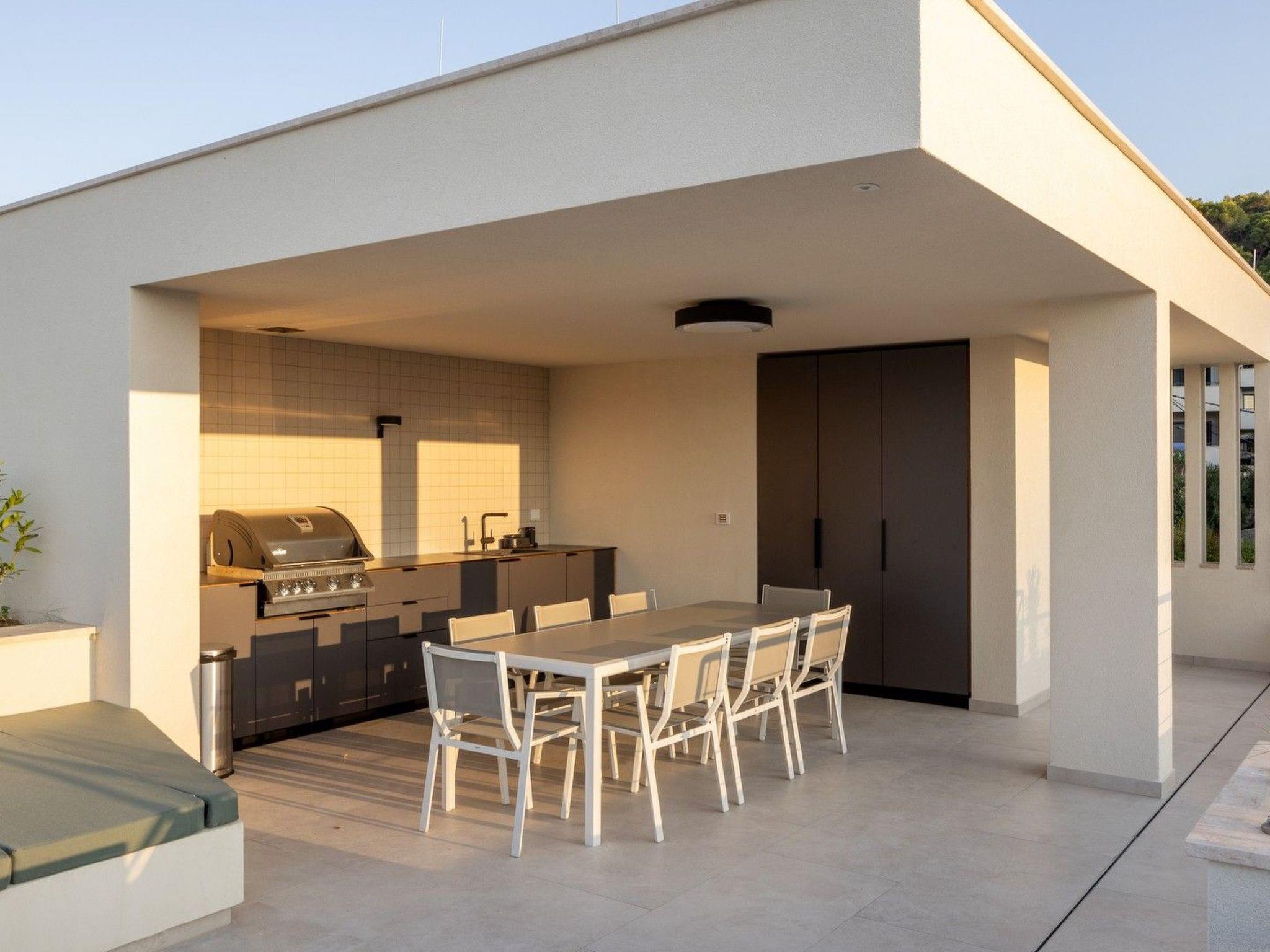 Im zweiten Stock gibt es eine Sommerküche mit einem Gasgrill, einem Tisch und Stühlen für 8 Personen, einem Whirlpool für 4 Personen und einem halben Bad. Hier können die Gäste beim Abendessen den Sonnenuntergang genießen.