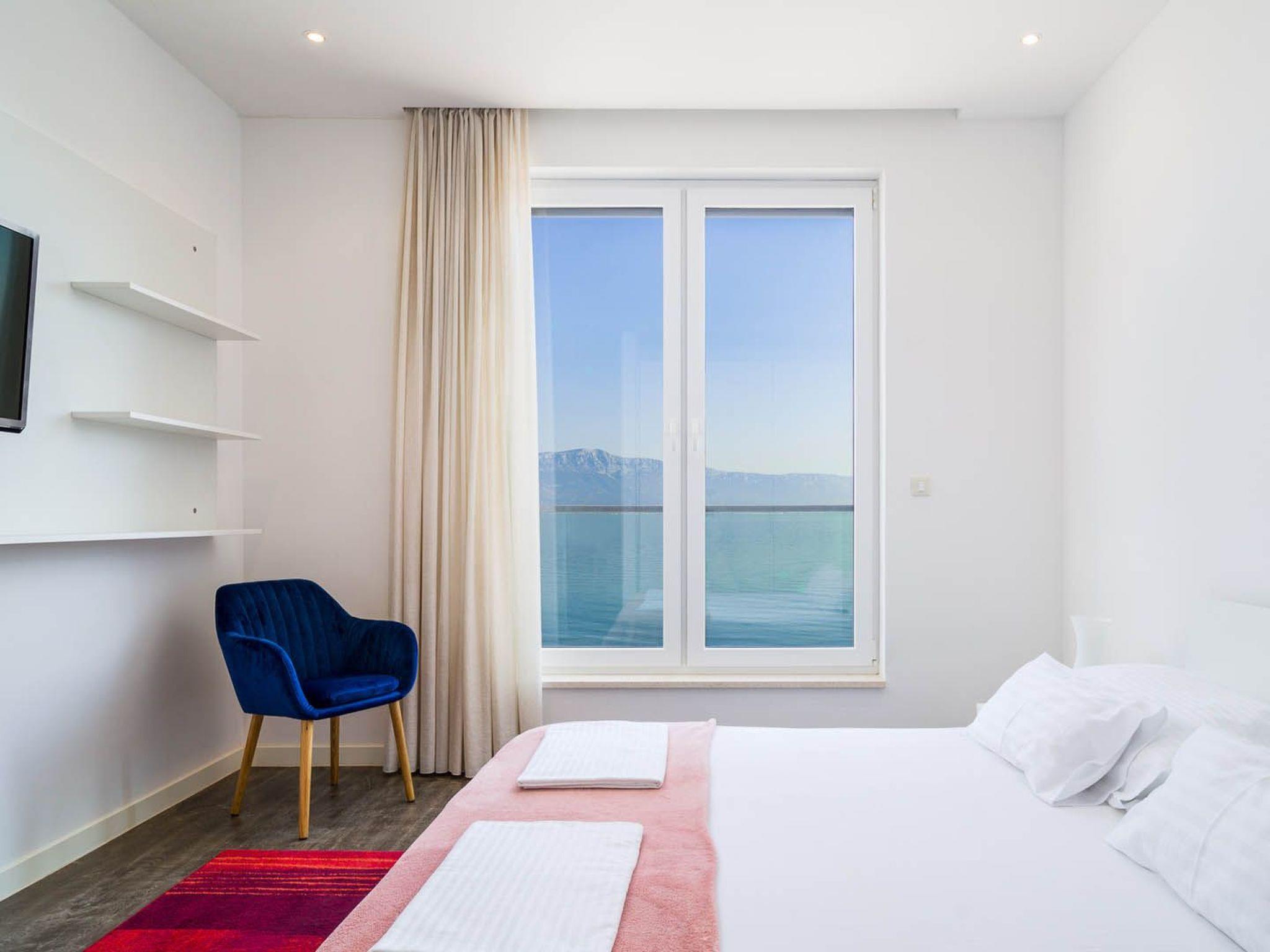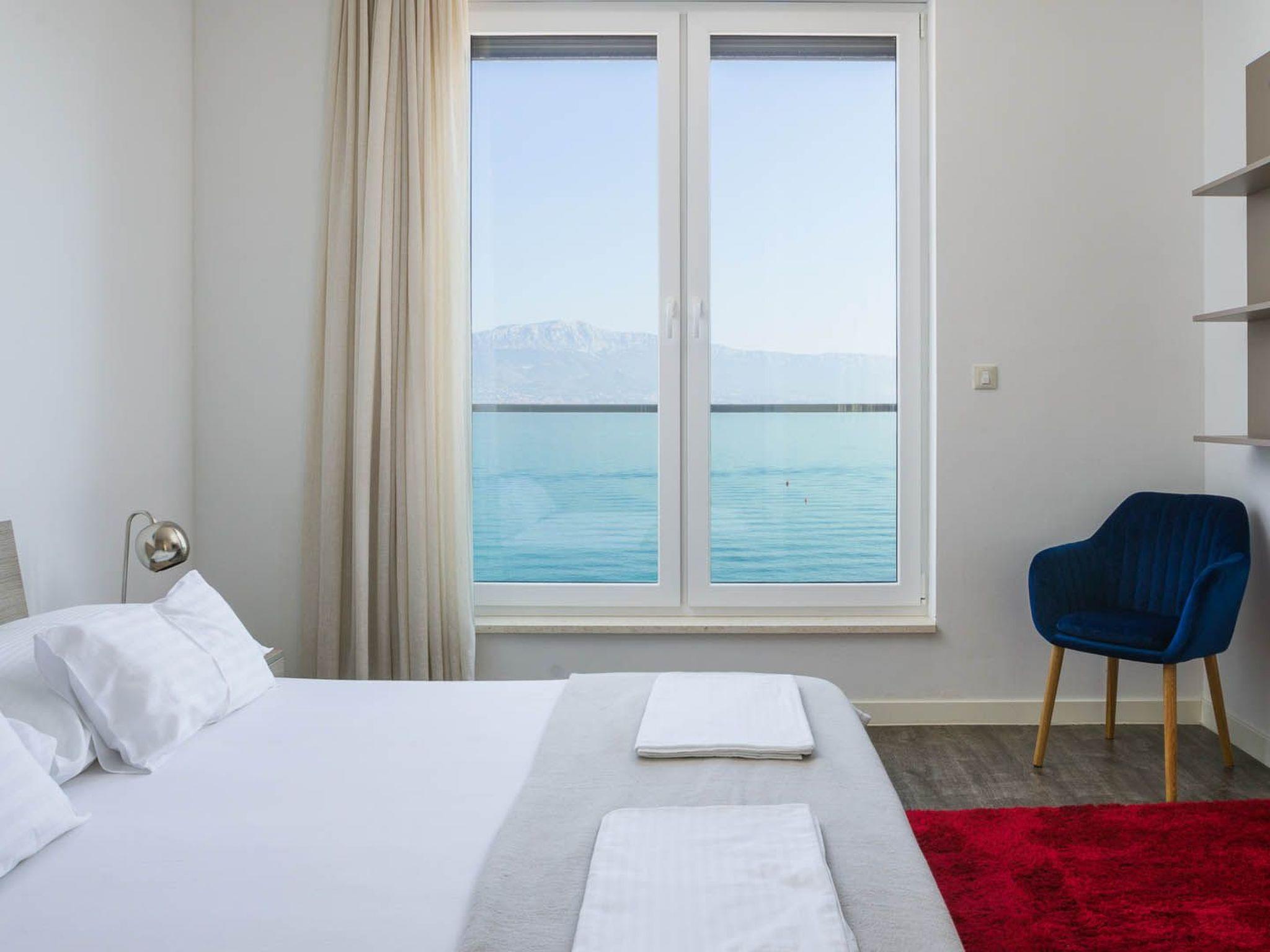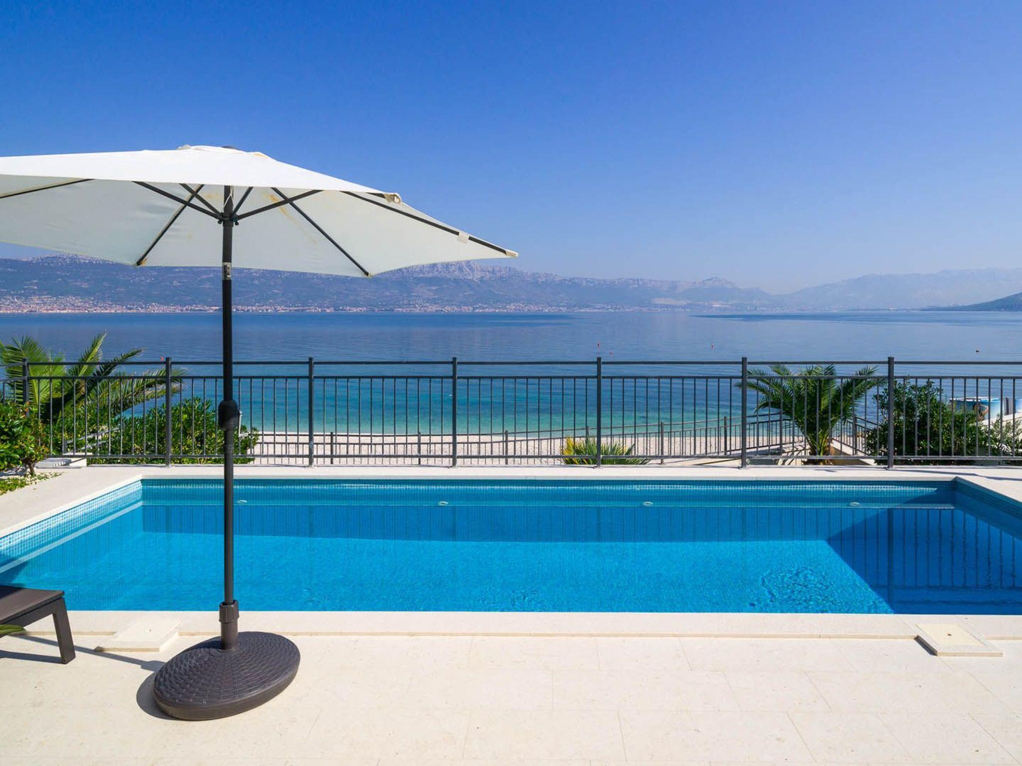 Diese hervorragend eingerichtete und elegante Villa ist Teil eines neu gebauten luxuriösen Strandkomplexes Golden, nur 10 m vom schönen Kieselstrand und dem kristallklaren Meer entfernt, mit einem atemberaubenden Panoramablick auf die Küste, die Berge und die Stadt Split.