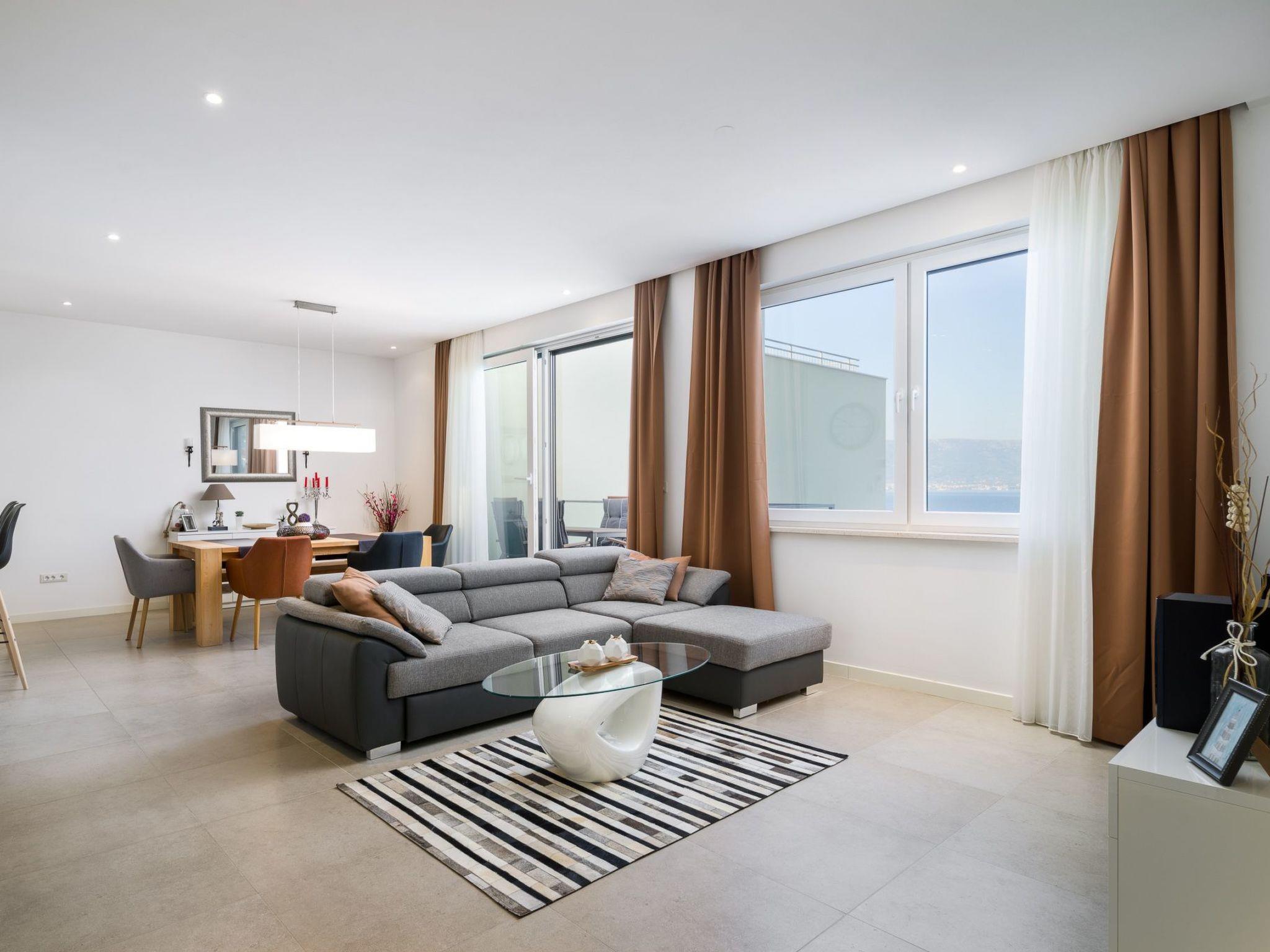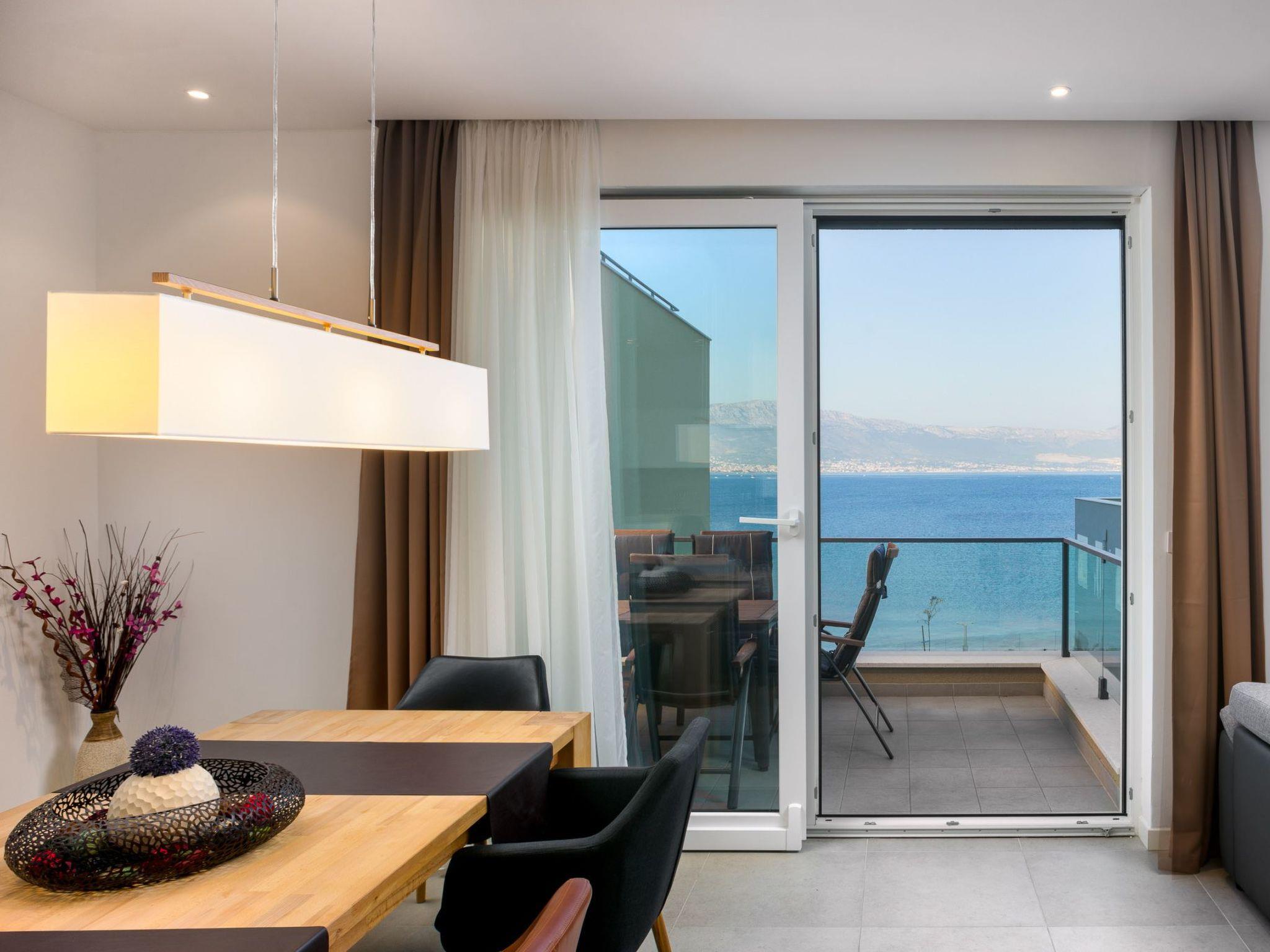 Diese wunderschön eingerichtete Wohnung ist Teil eines neu gebauten luxuriösen Strandkomplexes Golden, nur 10 m vom schönen Kieselstrand und kristallklarem Meer mit einem atemberaubenden Panoramablick auf die Küste, die Berge und die Stadt Split entfernt.