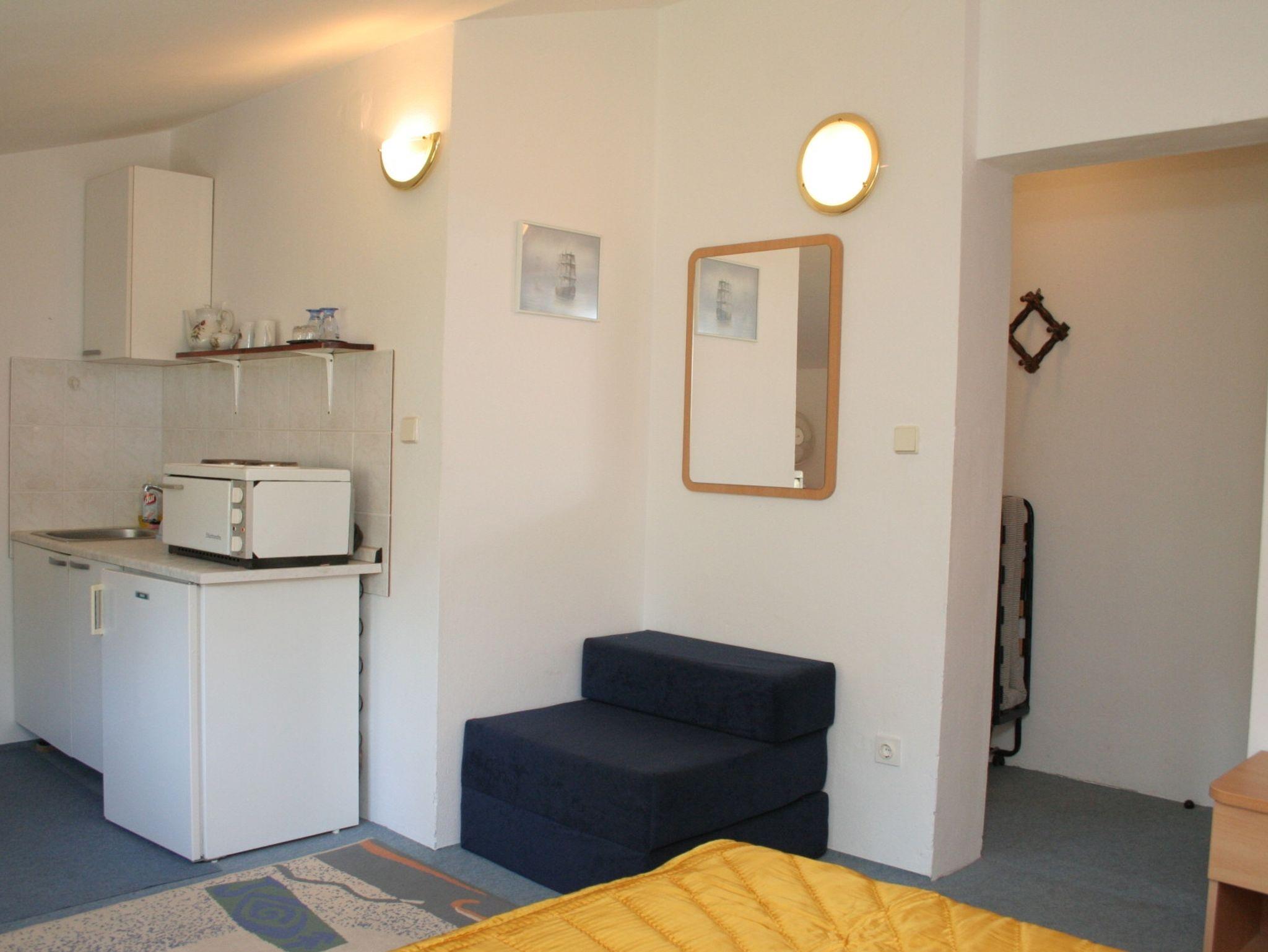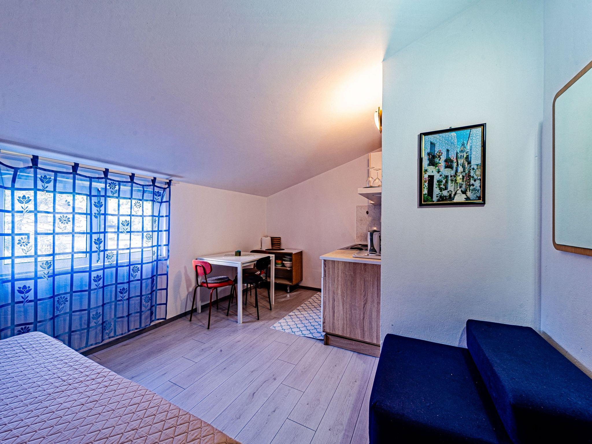 Studio bietet Platz für 2 Gäste. Die Betten sind in Schlafzimmern, die es 1 gibt, innerhalb einer Gesamtfläche von 23m2, angeordnet. Es ist erlaubt, Speisen auf dem Gemeinschafts-Grill vorzubereiten. In der Unterkunftseinheit besteht die Möglichkeit des Mitbringens von Haustieren gegen Aufpreis. Die reservierte Unterkunftseinheit verfügt über einen gemeinsame Terrasse. IM PREIS INBEGRIFFEN: Kurtaxe, Endreinigung, Parkplatz, Internet, Bügeleisen, Bügelbrett, Föhn. VERBINDLICHE ZUSÄTZLICHE KOSTEN: Aufzahlung für Kurzaufenthalte (prozentualer Zuschlag pro Nächtigungsanzahl: 30% - 1, 20% - 2, 10% - 3). UNVERBINDLICHE ZUSÄTZLICHE KOSTEN: Haustiere (5,00 € pro Nacht). Die Verfügbarkeit zusätzlicher Dienstleistungen in Ihrem reservierten Termin und die Preise derselben (falls nicht aufgeführt) müssen im Voraus überprüft werden. Zusätzliche Dienstleistungen die in der Zahlungsaufforderung nicht aufgeführt sind werden direkt beim Vermieter bezahlt, angenommen der Gast nutzt auch diese. Ermäßigung auf den Grundpreis: Gratistag 14=13 (bei einem Aufenthalt von 14 Tagen oder mehr erhalten Sie einen Gratistag für den Aufenthalt bis 31.12.26).