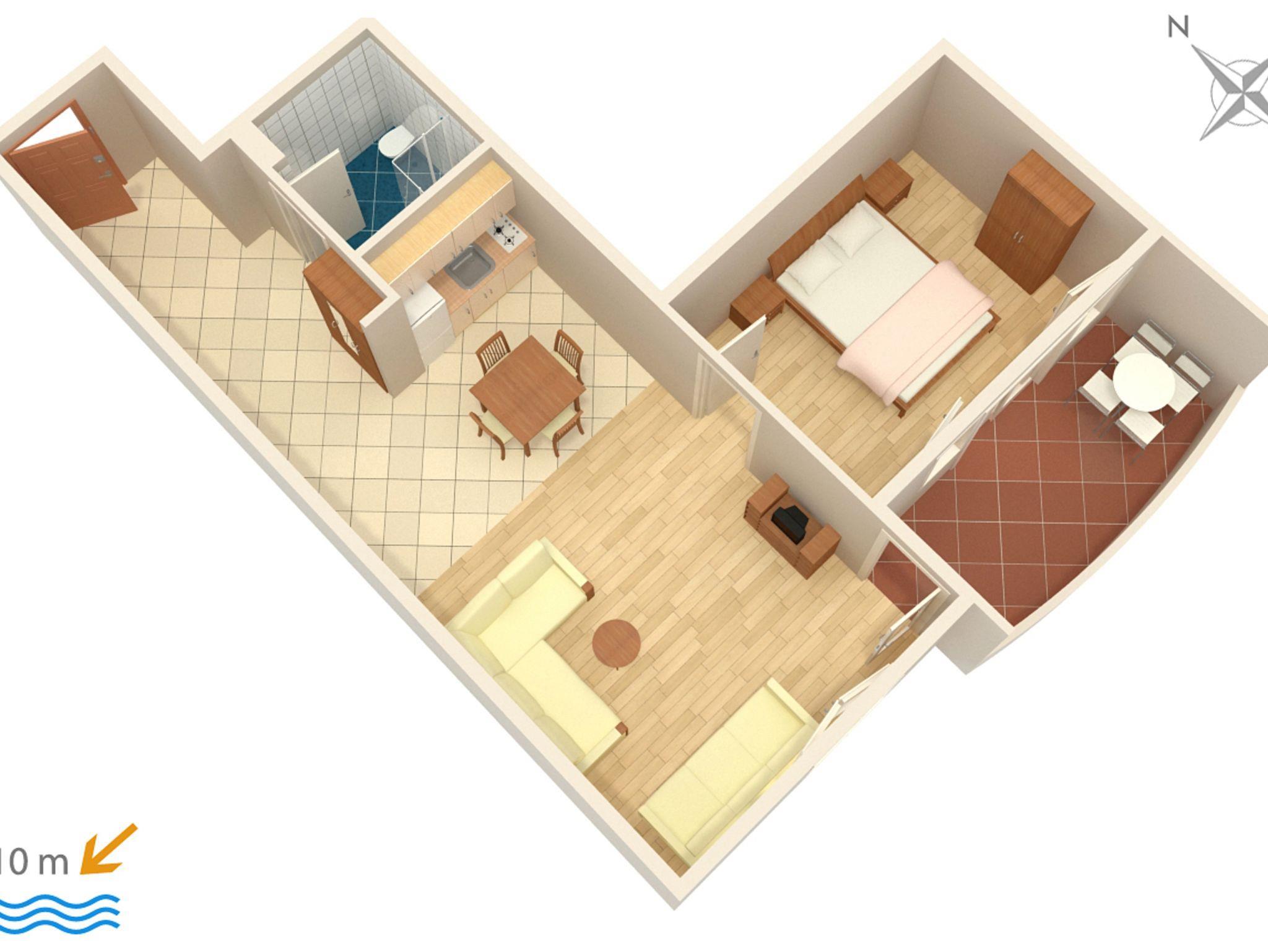 Ferienwohnung bietet Platz für 5 Gäste. Die Betten sind in Schlafzimmern, die es 1 gibt, und in Wohnzimmer, innerhalb einer Gesamtfläche von 50m2, angeordnet. Die Gäste haben eine eigene Terrasse zur Verfügung, auf der sie in warmen Sommernächten genießen können. Es ist erlaubt, Speisen auf dem Gemeinschafts-Grill vorzubereiten. In der Unterkunftseinheit besteht die Möglichkeit des Mitbringens von Haustieren gegen Aufpreis. IM PREIS INBEGRIFFEN: Endreinigung, Klimatisierung, Parkplatz, Internet, Kinderbett, Bügeleisen, Bügelbrett, Föhn. VERBINDLICHE ZUSÄTZLICHE KOSTEN: Kurtaxe (Erwachsene 0,93 € - 1,80 € Nacht/Person, Kinderermäßigung 12 - 17 Jahre). UNVERBINDLICHE ZUSÄTZLICHE KOSTEN: Frühstück (4,00 €, 50% Nachlass für Kinder zwischen 4 und 12 Jahren, Kinder bis 4 Jahre sind frei.), Halbpension (10,00 €, 50% Nachlass für Kinder zwischen 4 und 12 Jahren, Kinder bis 4 Jahre sind frei.), Vollpension (15,00 €, 50% Nachlass für Kinder zwischen 4 und 12 Jahren, Kinder bis 4 Jahre sind frei.), Haustiere (5,00 € pro Nacht). Die Verfügbarkeit zusätzlicher Dienstleistungen in Ihrem reservierten Termin und die Preise derselben (falls nicht aufgeführt) müssen im Voraus überprüft werden. Zusätzliche Dienstleistungen die in der Zahlungsaufforderung nicht aufgeführt sind werden direkt beim Vermieter bezahlt, angenommen der Gast nutzt auch diese.