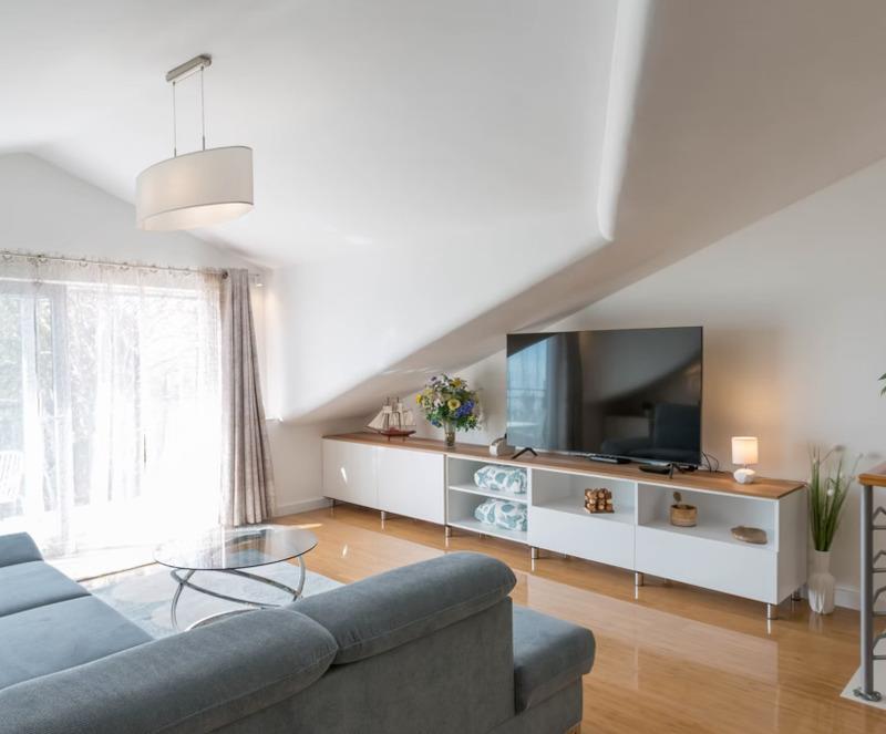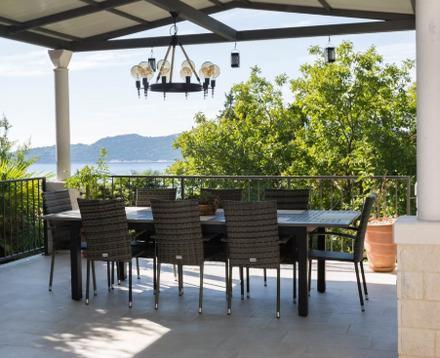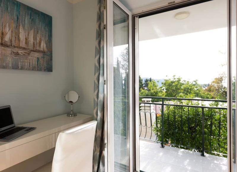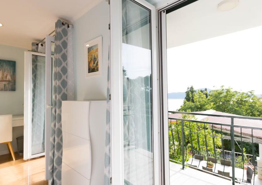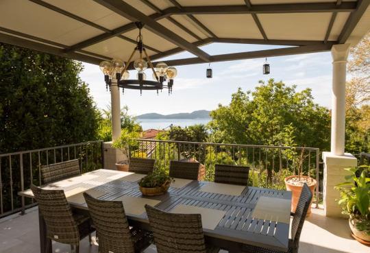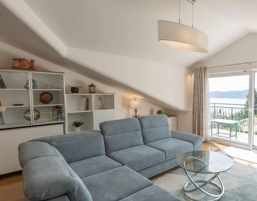 Wenn Sie durch die Eingangstür von Blue Horizon treten, werden Sie von einem spektakulären Wohnbereich mit Aussicht begrüßt. Wenn Sie durch die wandfüllenden Glasschiebetüren auf den Balkon treten, werden Sie schnell verstehen, wie dieses Haus zu seinem Namen kam. Vor Ihnen sehen Sie das atemberaubende Blau der Adria, einen Blick auf die nahegelegenen Inseln und die wiegenden Baumkronen des Arboretums.