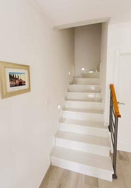 Das Haus verfügt über eine schmale, aber gut beleuchtete Treppe mit Handlauf und die Stockwerke können nur über Stufen bestiegen werden.