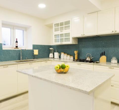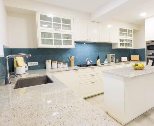 Die moderne Küche bietet alles, was Sie zum Zubereiten, Kochen und Servieren köstlicher Mahlzeiten benötigen. Sie finden alle wichtigen Geräte (einschließlich Mikrowelle, Backofen und Geschirrspüler) sowie Annehmlichkeiten wie einen Mixer, eine Kaffeemaschine und einen Eisspender. Dank der zentralen Kücheninsel gibt es ausreichend Arbeitsfläche.