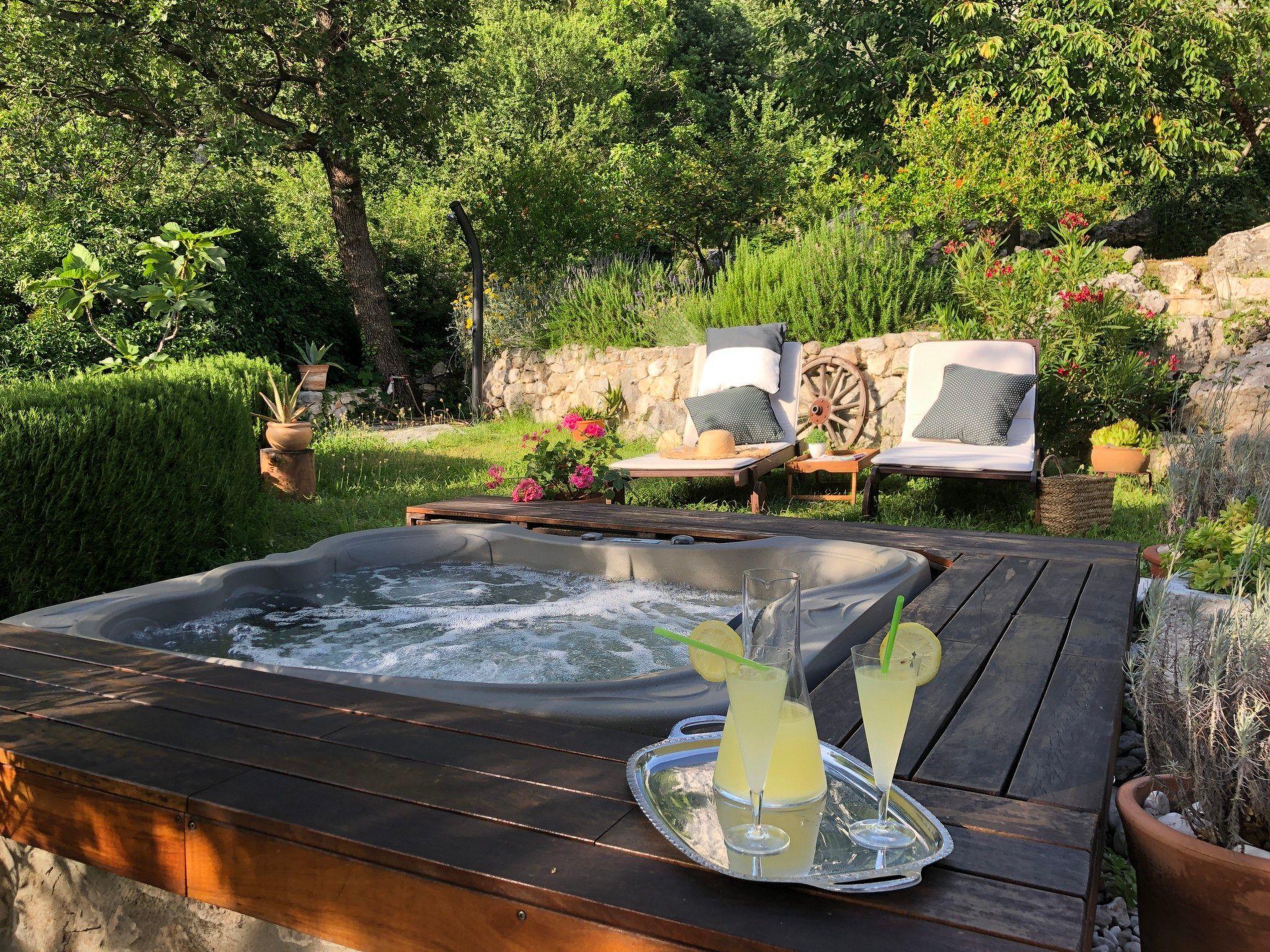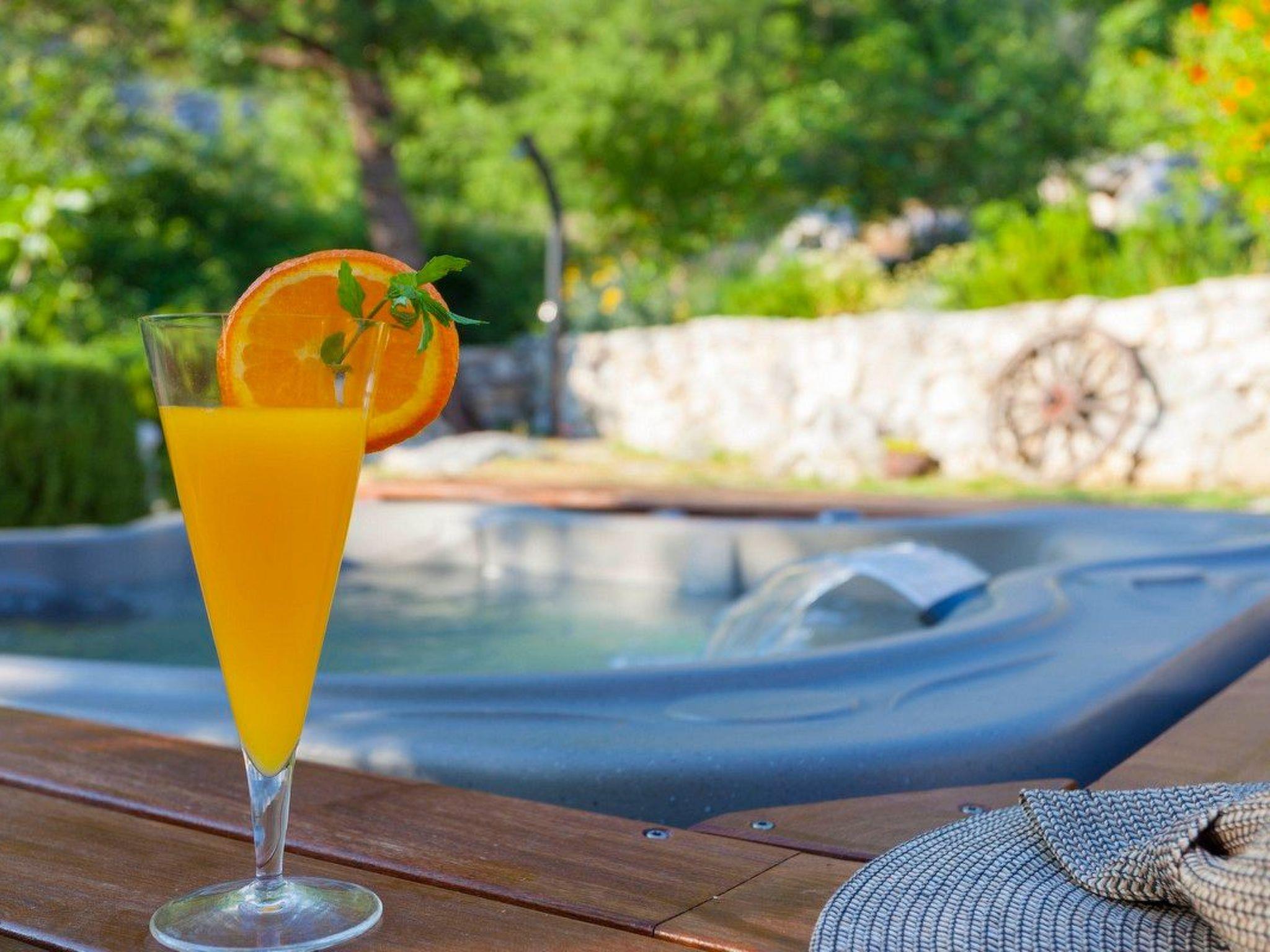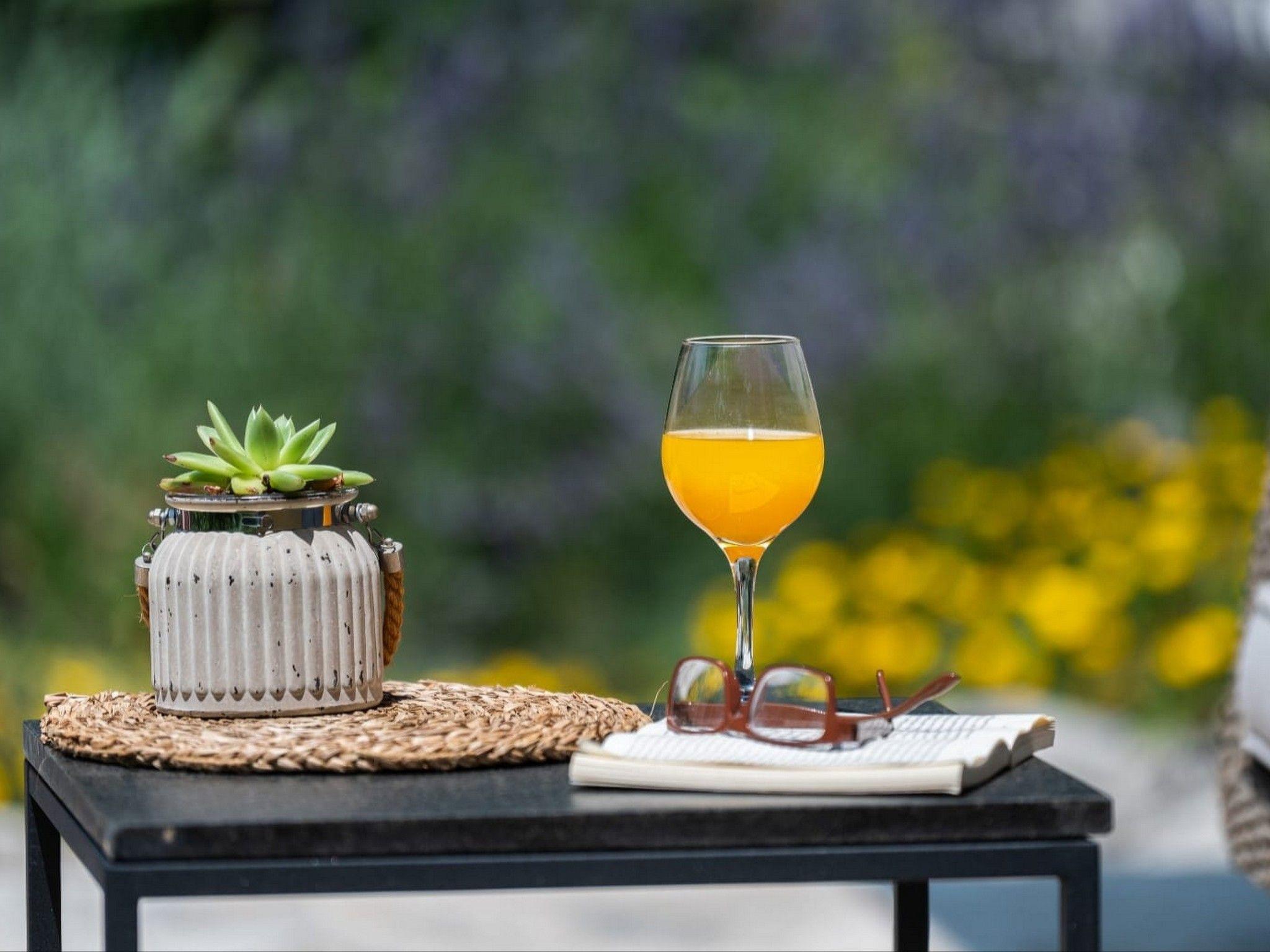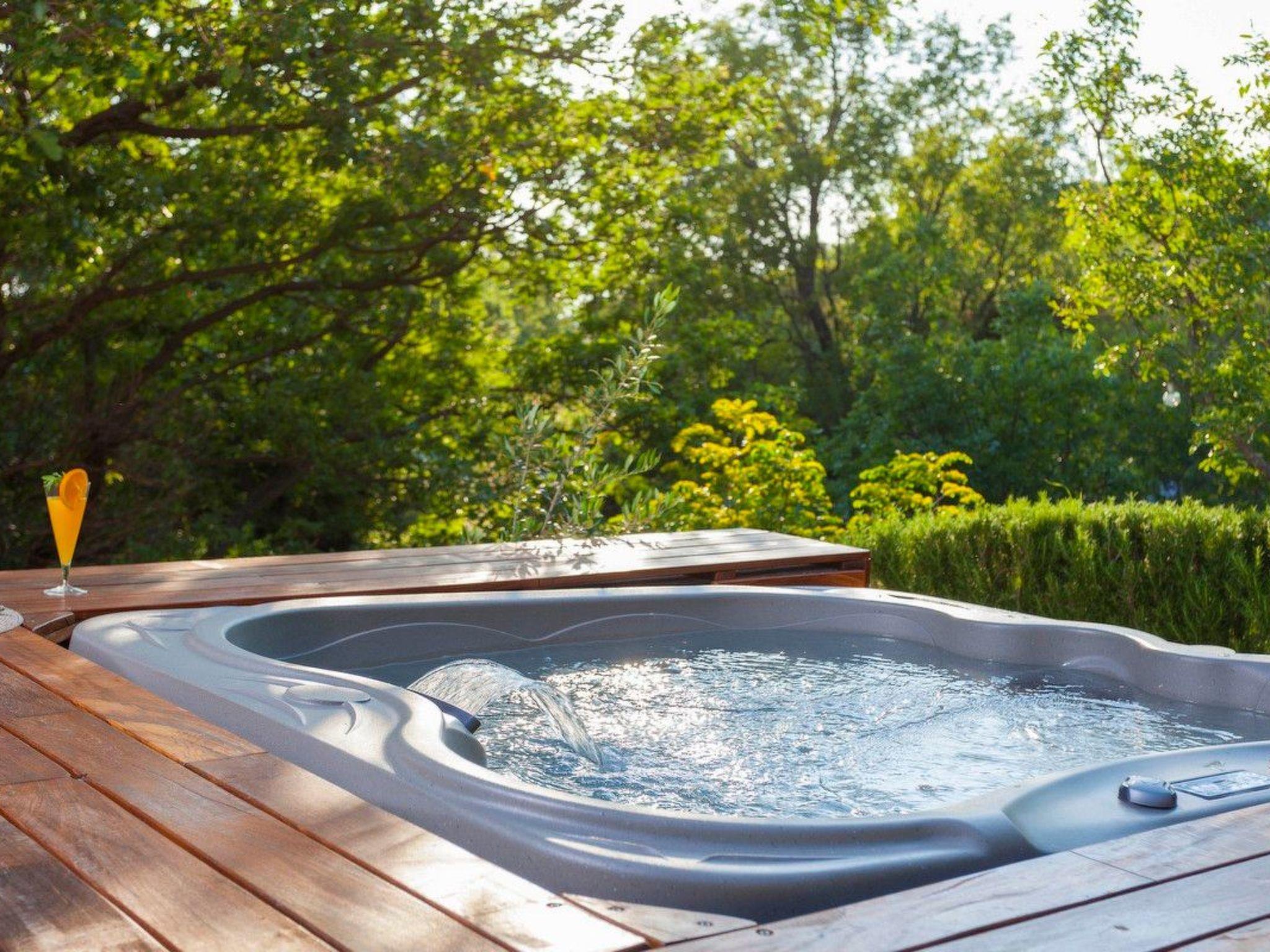 Der Blick schweift über die grüne Umgebung, während man auf der privaten Terrasse entspannt – ob im wohltuenden Whirlpool, auf einer Sonnenliege oder bei einem Glas Wein unter dem Sternenhimmel. Der Außenbereich ist vollständig umzäunt und garantiert absolute Privatsphäre.