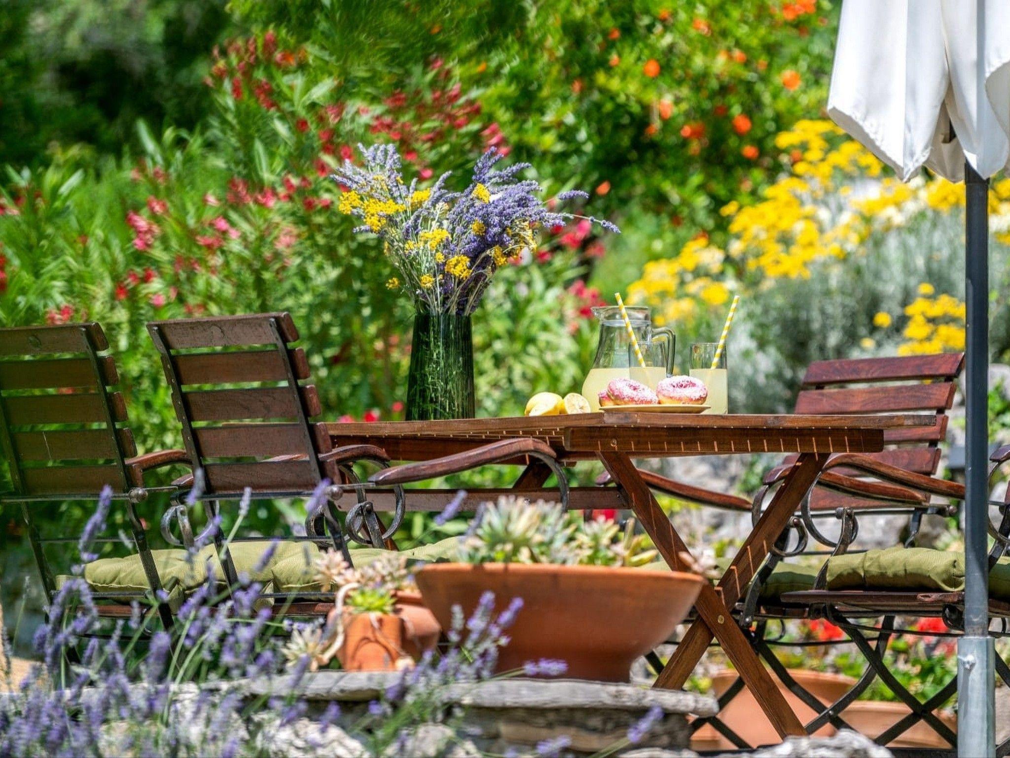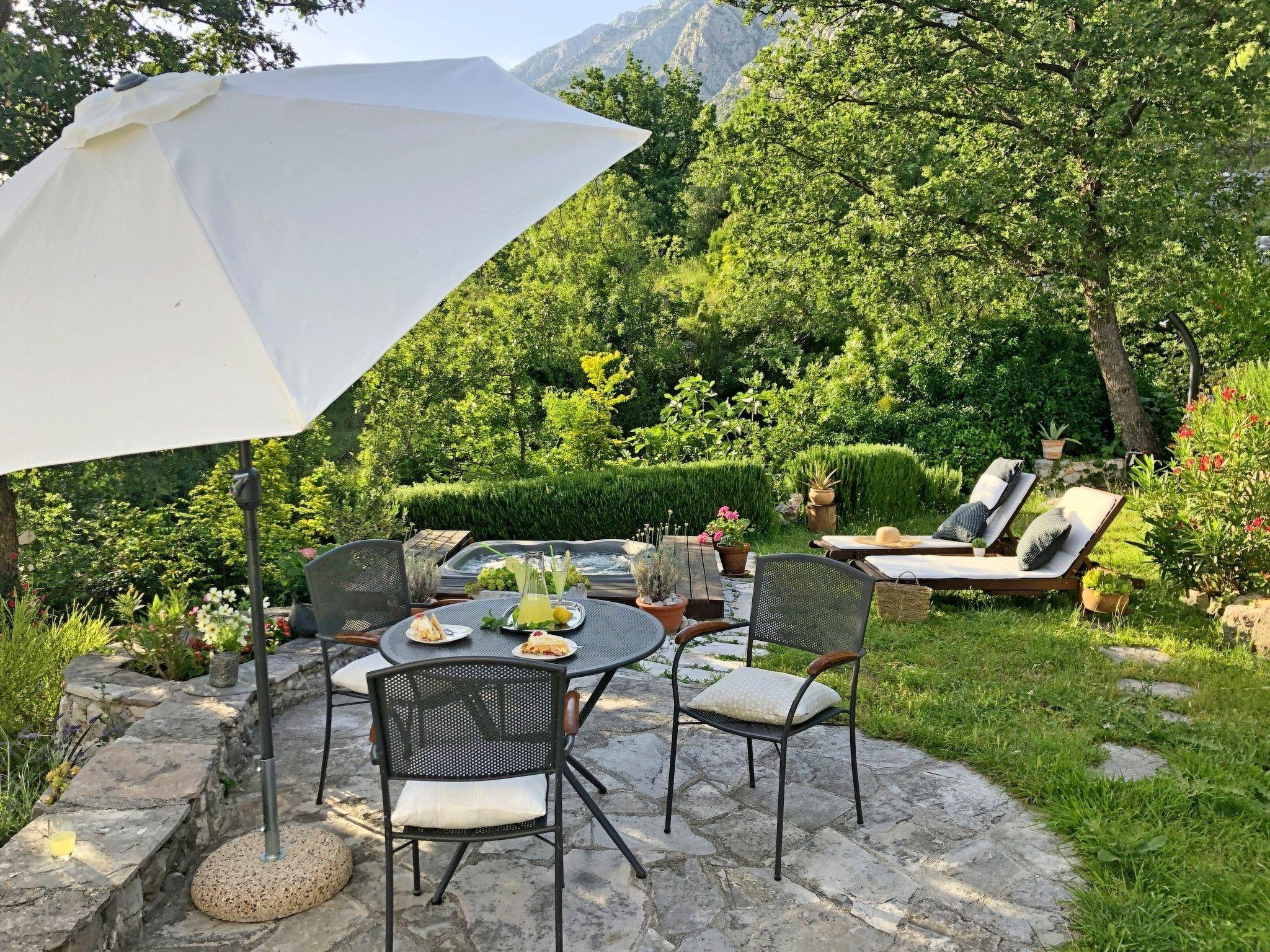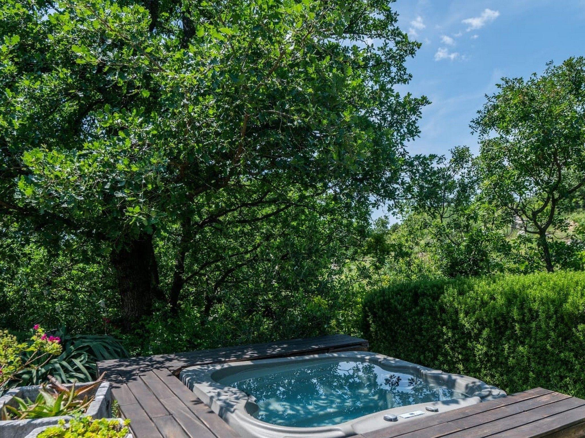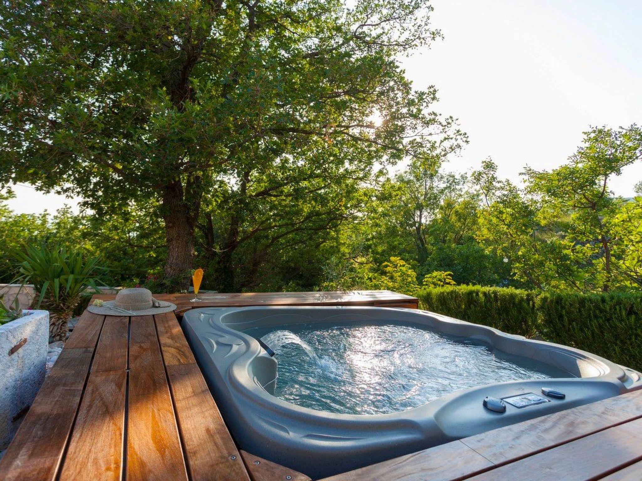 Der Blick schweift über die grüne Umgebung, während man auf der privaten Terrasse entspannt – ob im wohltuenden Whirlpool, auf einer Sonnenliege oder bei einem Glas Wein unter dem Sternenhimmel. Der Außenbereich ist vollständig umzäunt und garantiert absolute Privatsphäre.
